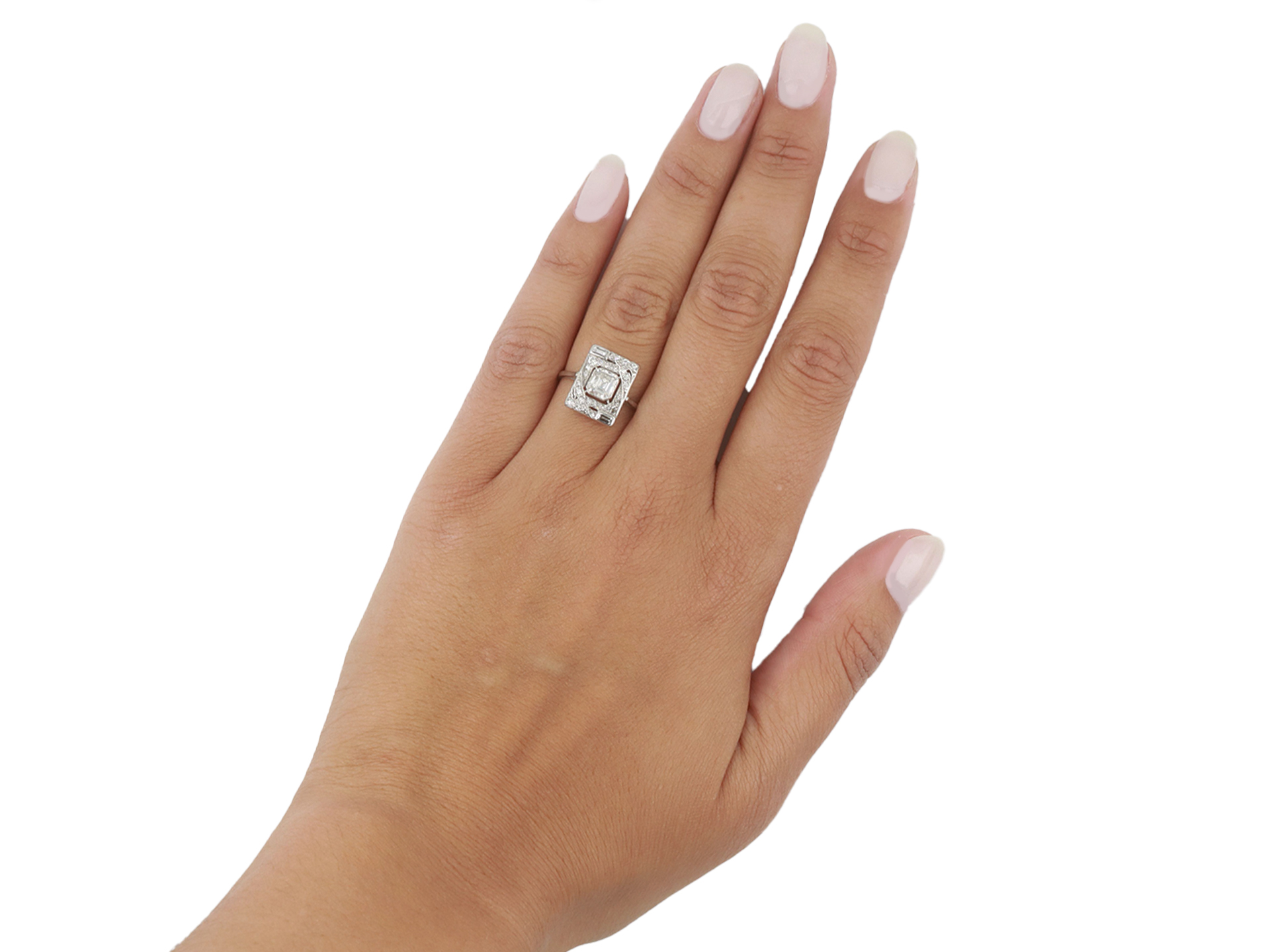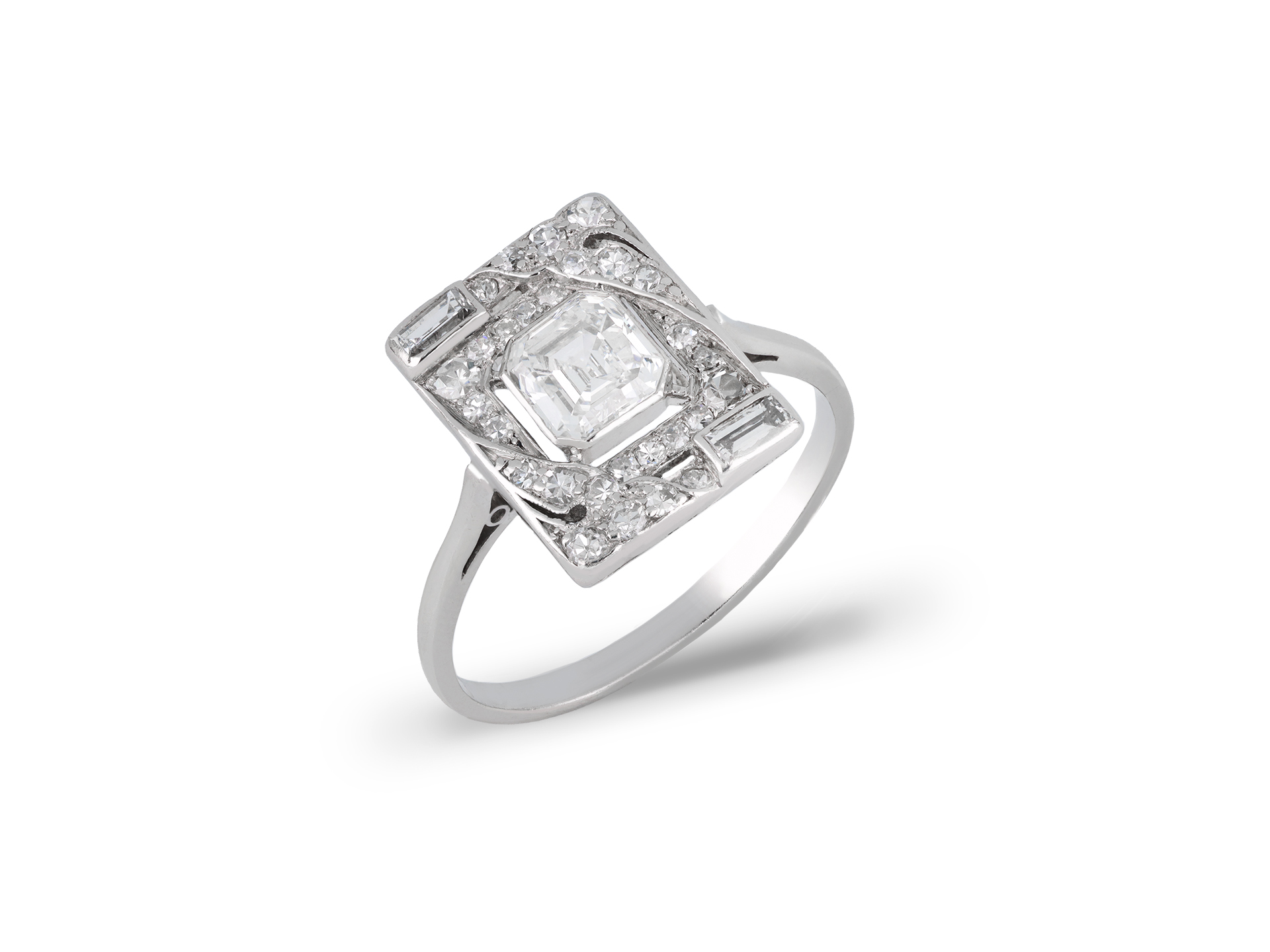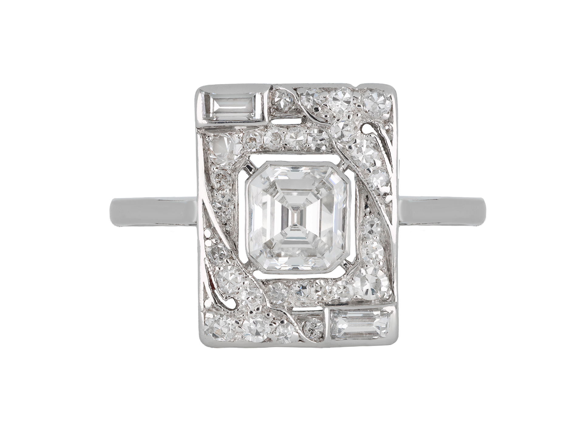 Art Deco diamond cluster ring. Set to centre with an octagonal asscher cut diamond in an open back rubover setting with an approximate weight of 1.00 carats, adorned with two rectangular baguette-cut diamonds in open back rubover settings with a combined weight of 0.20 carats, further set with twenty-eight round eight-cut diamonds in open back grain settings with a combined weight of 0.40 carats. The total approximate diamond weight is 1.60 carats, to an elegant rectangular openwork cluster featuring an intricately pierced gallery with scrolling details and fancy open backholing, leading to smooth shoulders and flowing through to a solid D-shape shank. Tested platinum, circa 1920.