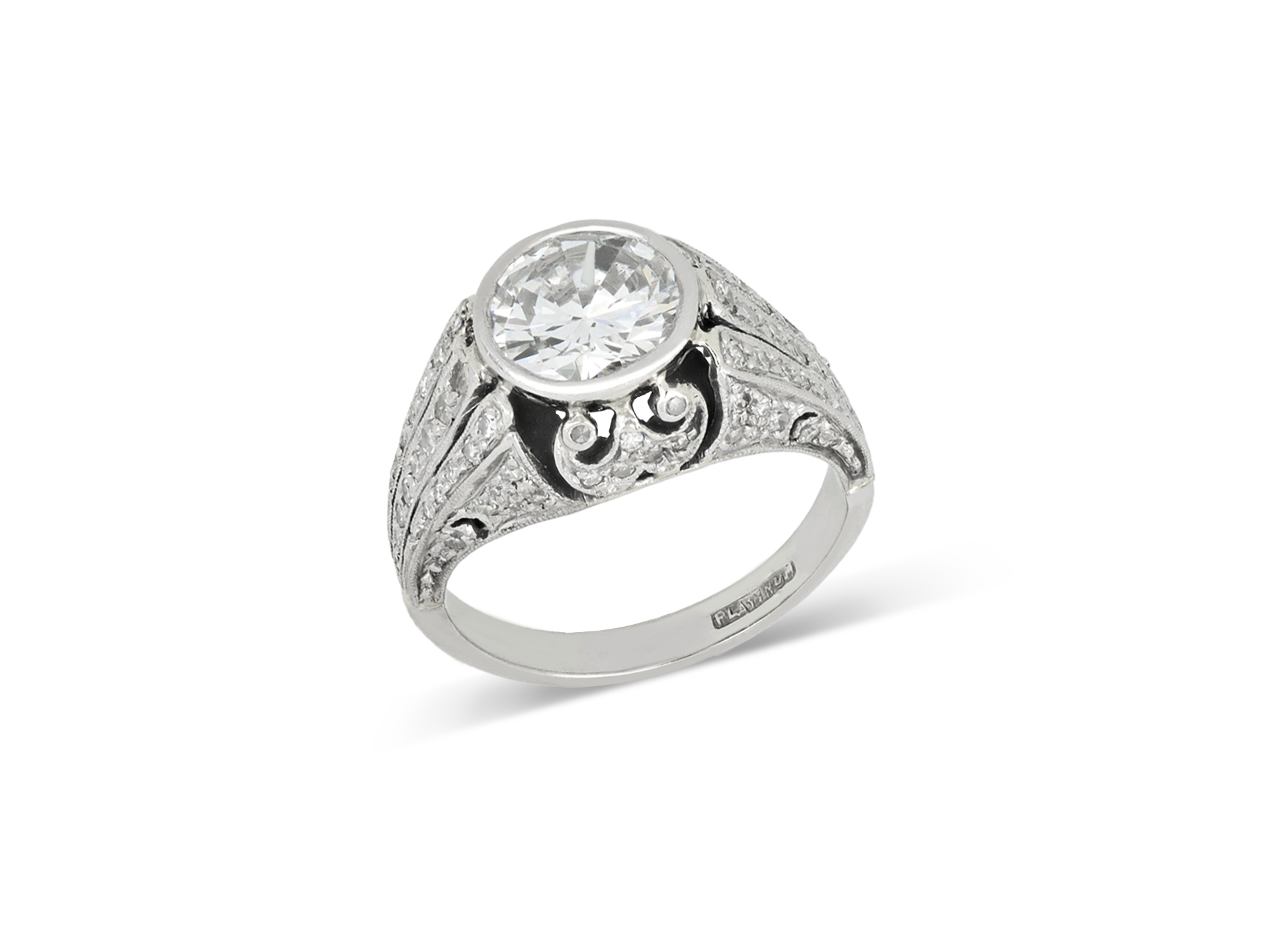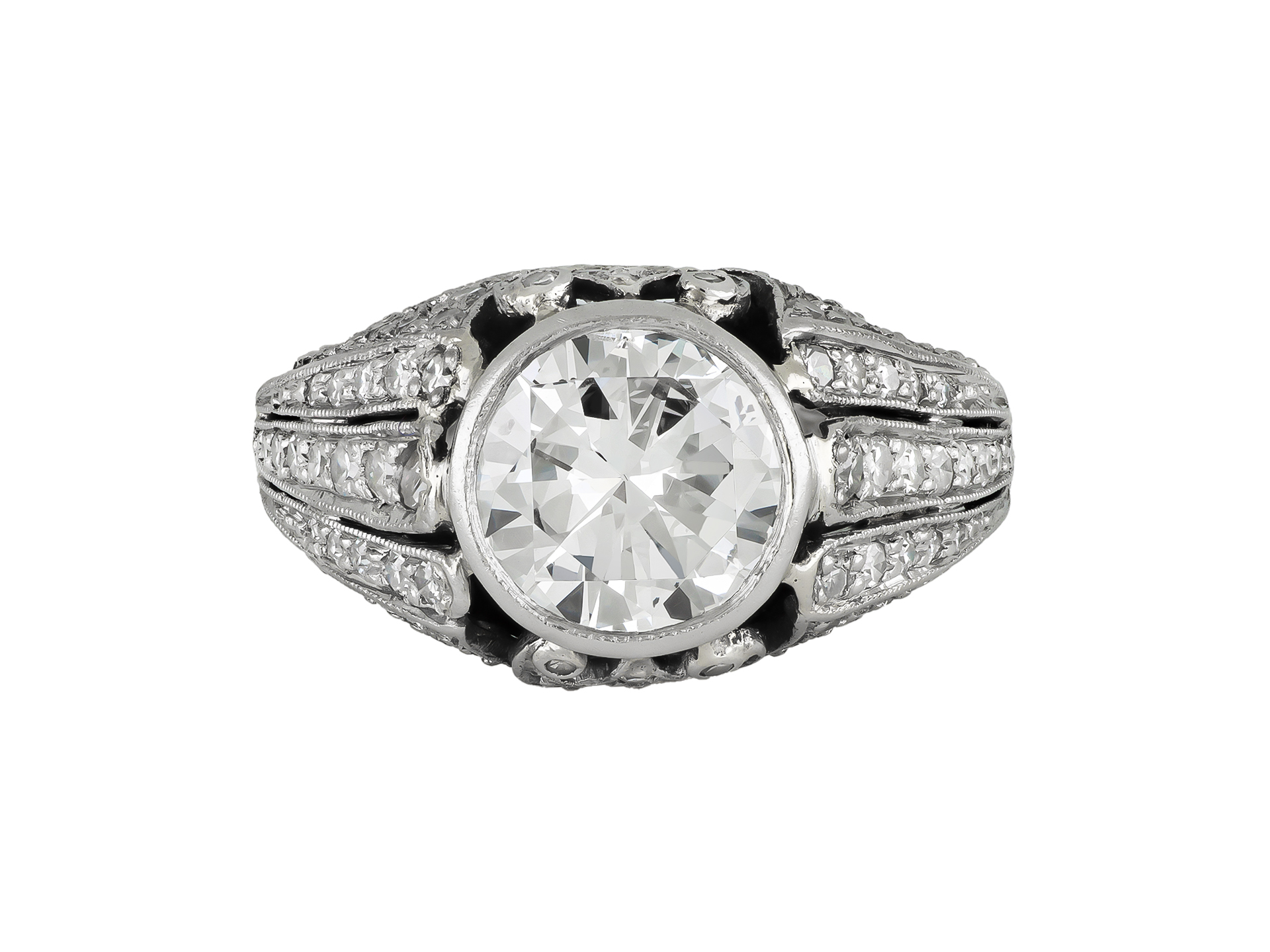 Diamond cluster ring. Centrally set with a round old cut diamond in an open back rubover setting with an approximate weight of 1.80 carats, embellished by seventy-eight round eight cut diamonds in open back grain settings with a combined weight of 0.90 carats. The total approximate diamond weight is 2.70 carats, to an ornate cluster design featuring intricate openwork and millegrain borders throughout, a decoratively pierced gallery with scrolling motifs and elaborate open backholing, the trumpeting shoulders flowing through to a solid D-shape shank. Marked platinum.