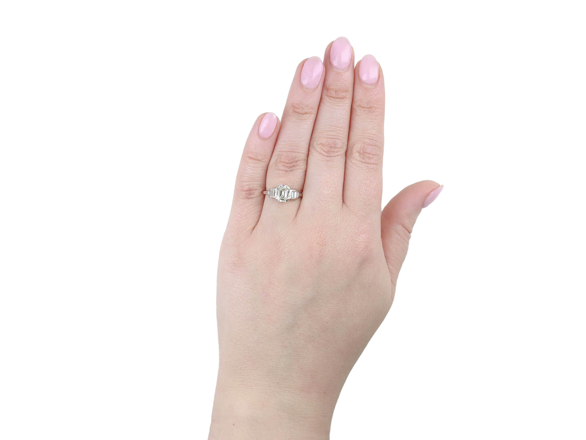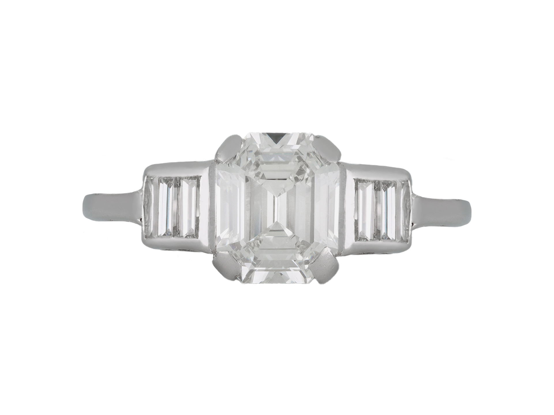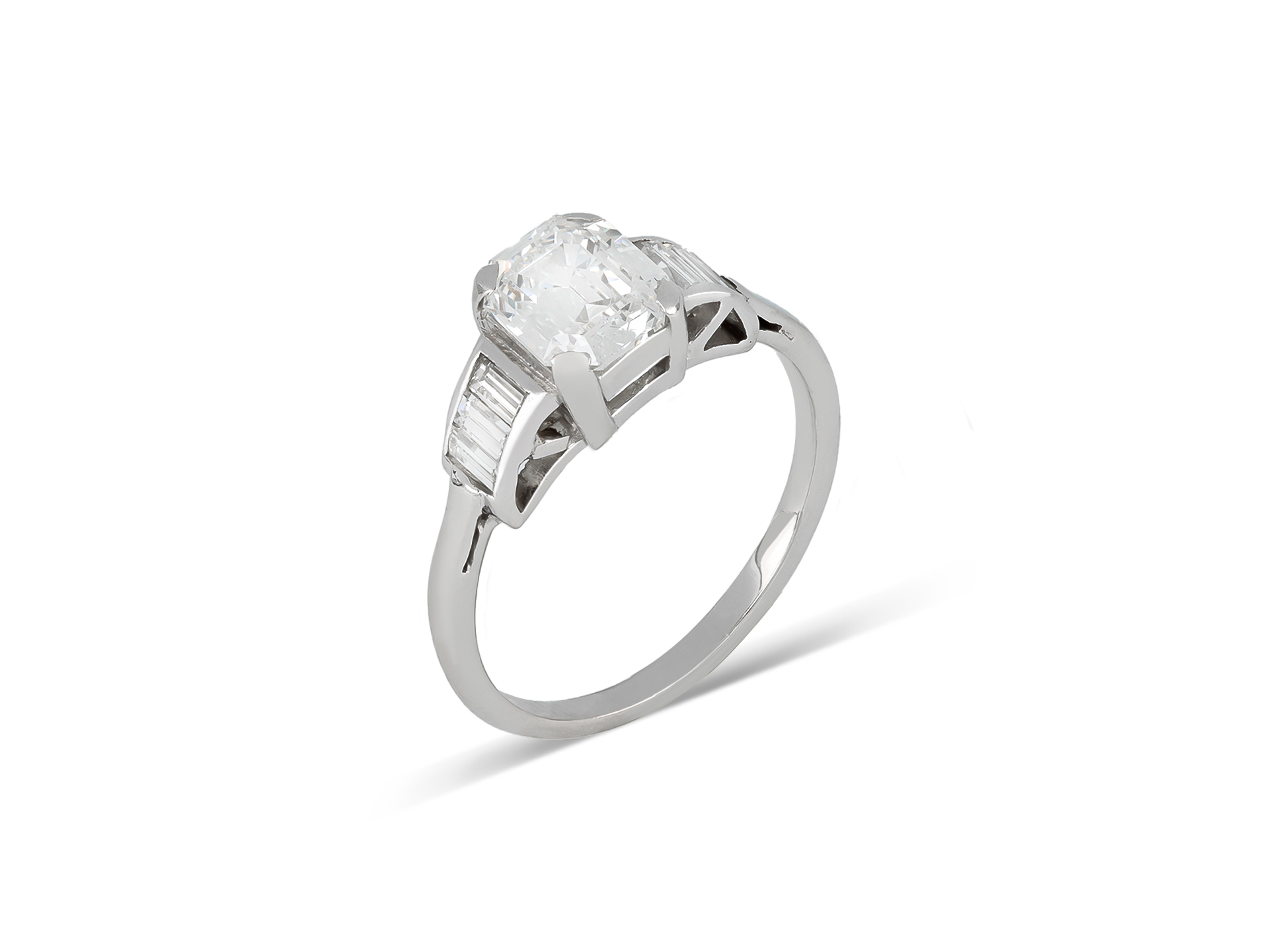 Art Deco diamond flanked solitaire ring. Set to centre with an octagonal emerald-cut diamond, G colour, VVS2 clarity, with a weight of 1.20 carats in an open back claw setting, flanked by six rectangular baguette cut diamonds in open back rubover settings, with a combined approximate weight of 0.25 carats. The total approximate diamond weight is 1.45 carats, to an impressive flanked design featuring polished borders, a geometrically pierced gallery and open backholing, flanked by broad raised shoulders that flow through to a solid D-shape shank. Marked platinum, circa 1920, accompanied by Gemological Institute of America (GIA) report #2231211713.