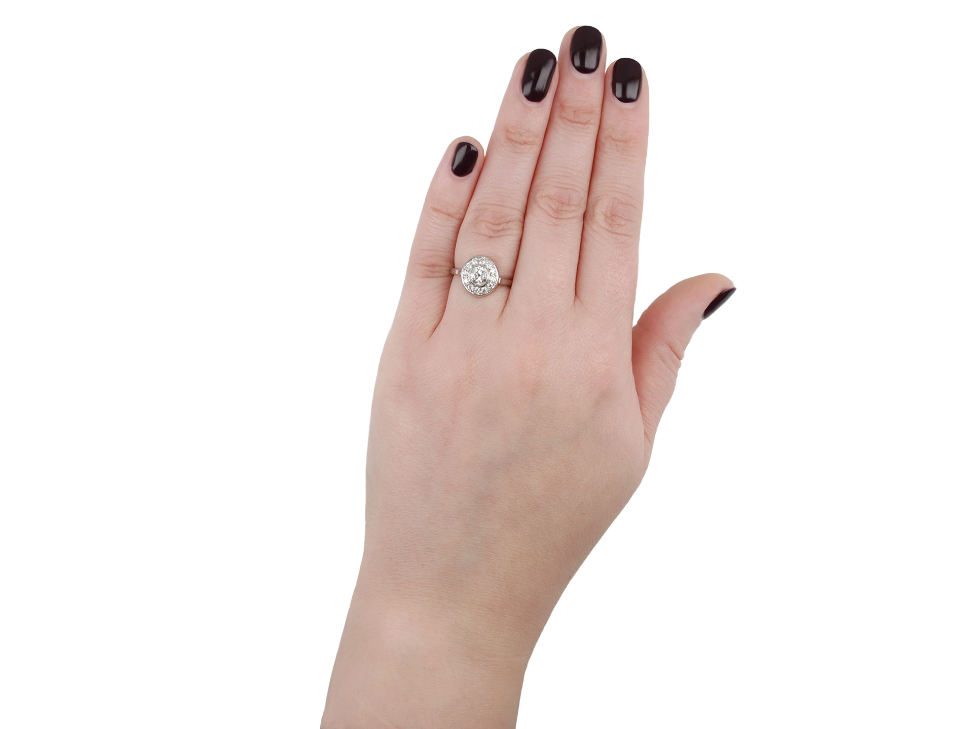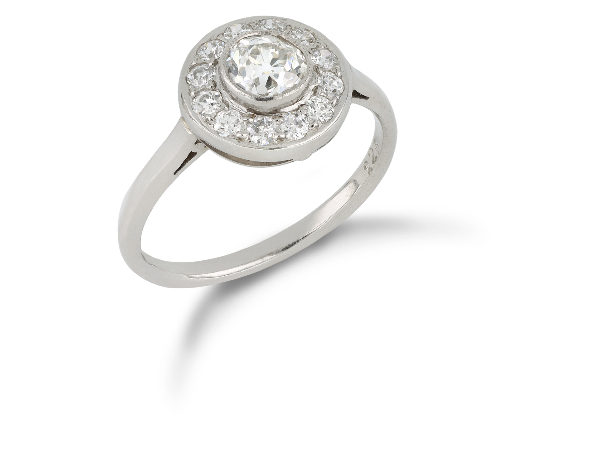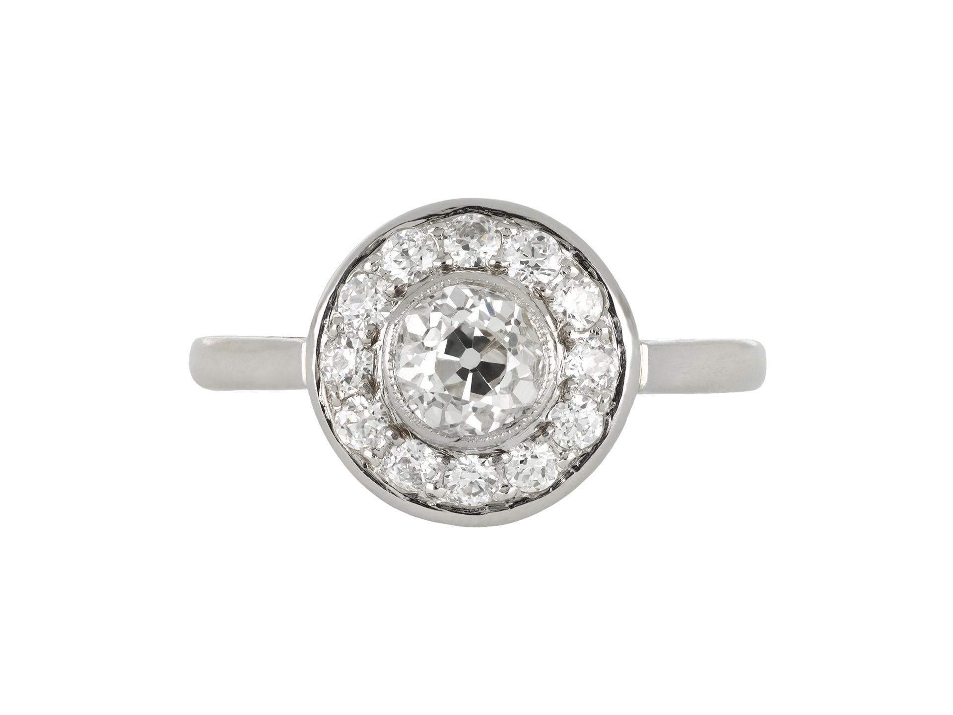 Art Deco diamond target ring. Centrally set with a round old cut diamond in an open back rubover setting with an approximate weight of 0.60 carats, encircled by twelve round old cut diamonds in open back grain settings with a combined weight of 0.40 carats. The total approximate diamond weight is 1.00 carats, to a stylish target cluster with decorative millegrain borders, a geometric linear pierced gallery and intricate open backholing, flanked by elegantly sloping shoulders and leading to a slim D-shape shank. Marked platinum, numbered '226', English, circa 1920.