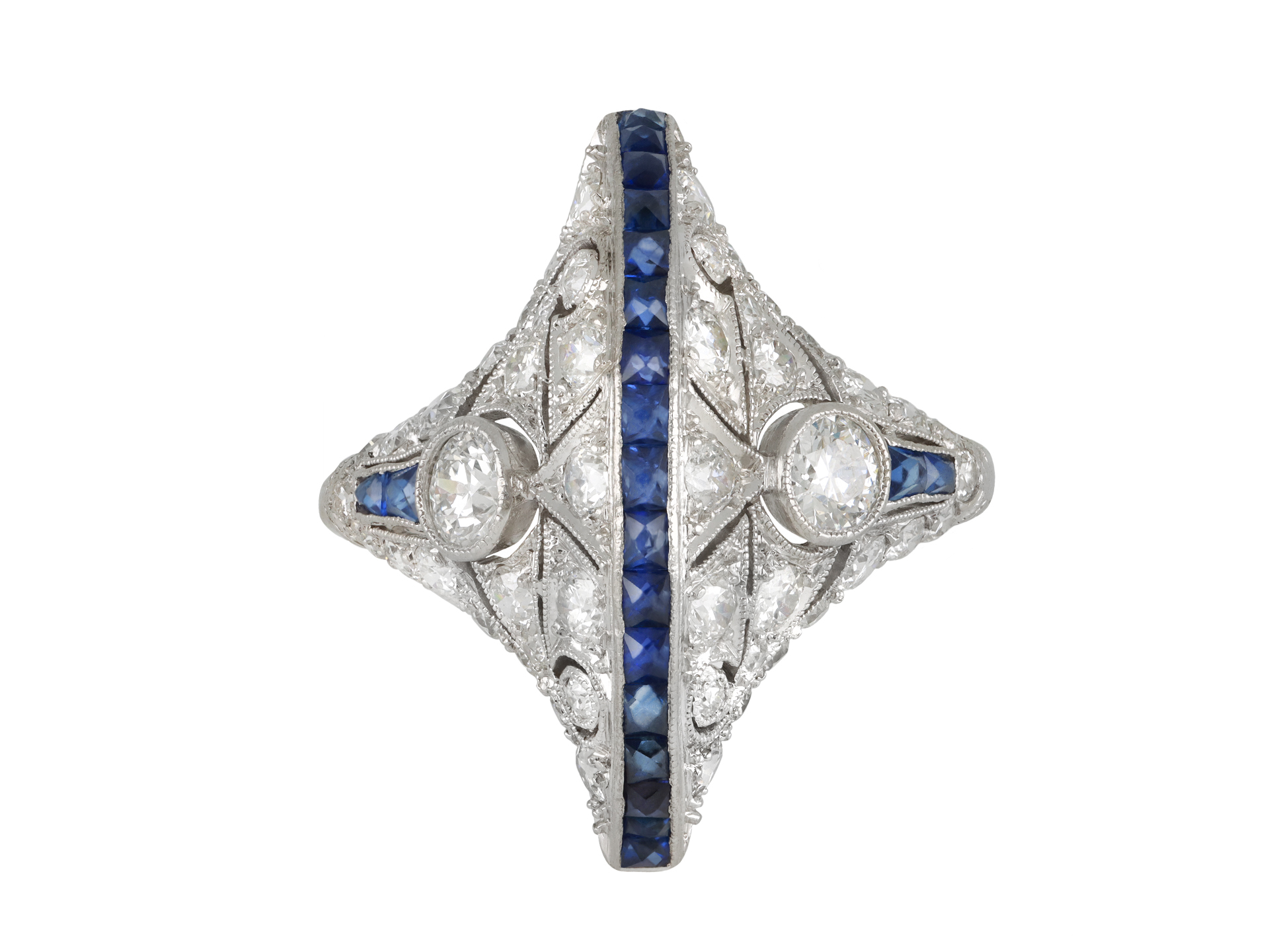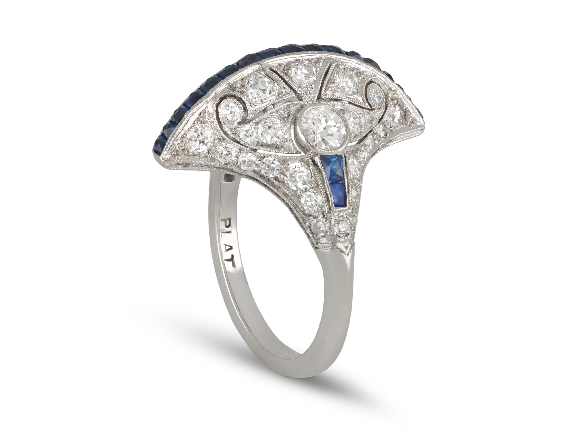 Art Deco Egyptian Revival sapphire and diamond ring, circa 1935.