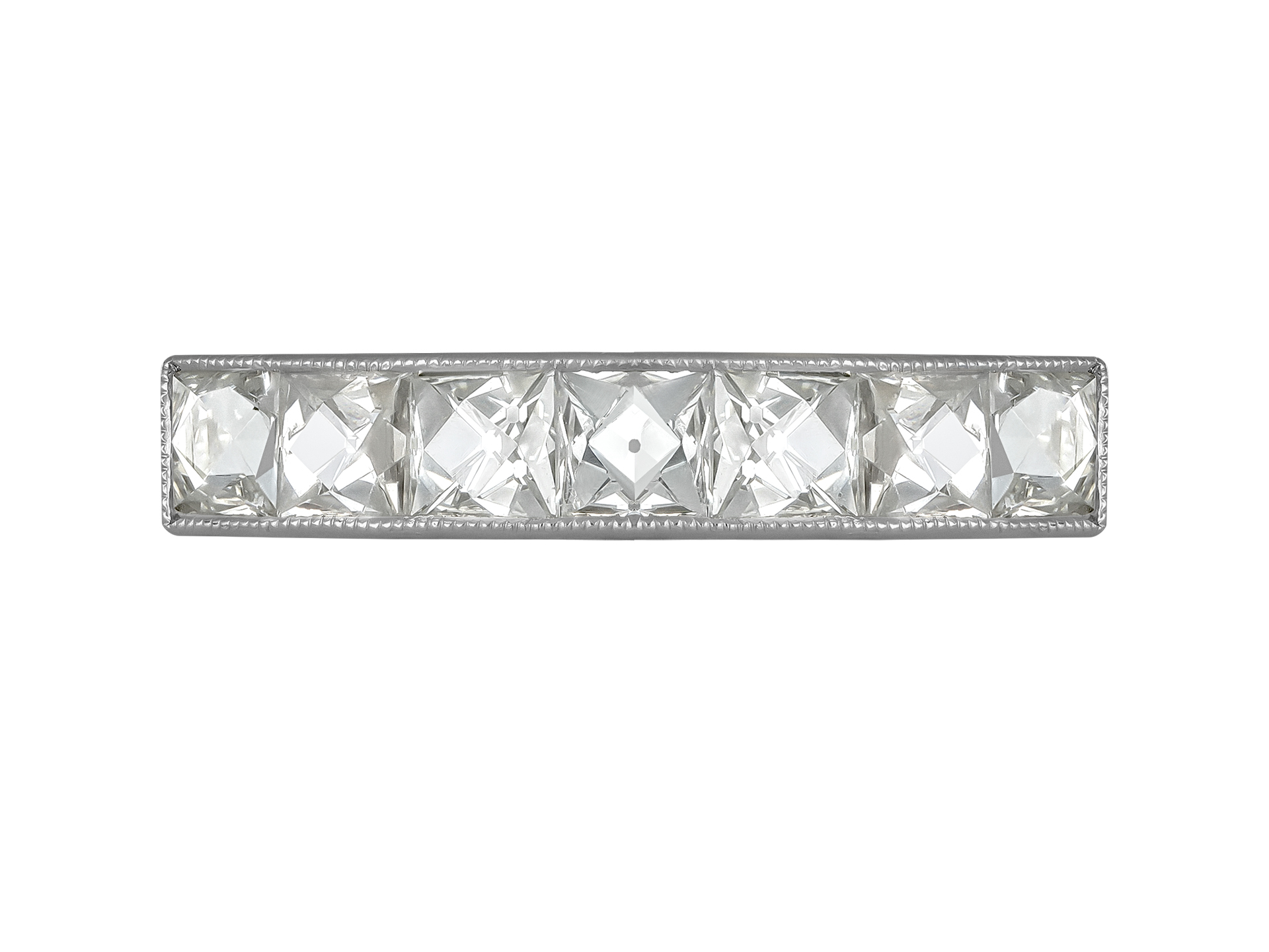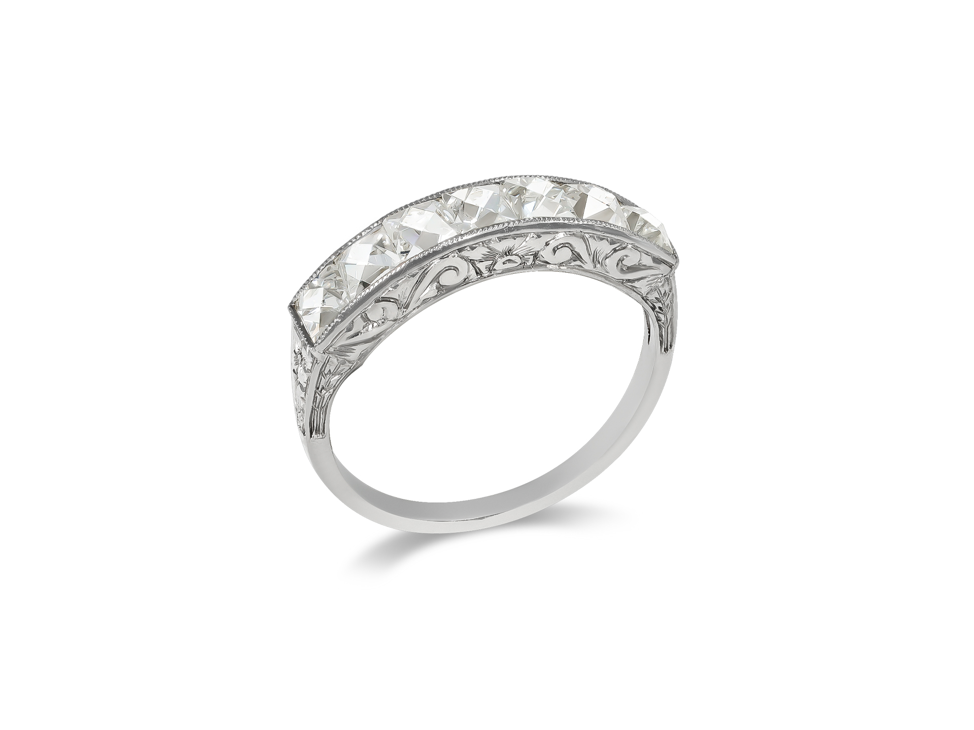 Art Deco french cut diamond ring. Set with seven square french cut diamonds in open back channel settings with a combined approximate weight of 1.75 carats, to a linear five stone design featuring engraved borders and square open backholing, leading to tapering shoulders engraved with floral motifs and flowing through to a solid shank. Tested platinum, circa 1930.