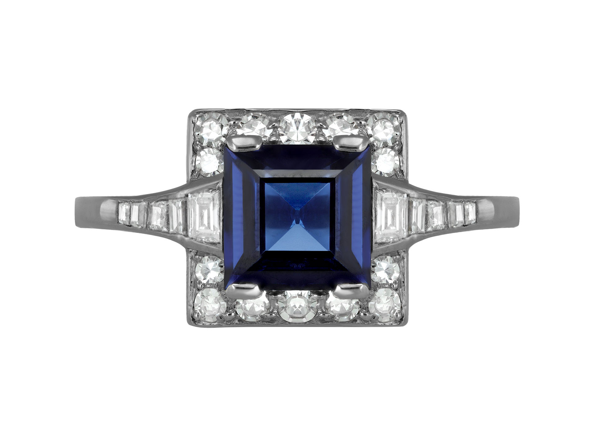Art Deco sapphire and diamond cluster ring. Set to centre with a square step-cut natural no heat sapphire in an open back claw setting with an approximate weight of 1.40 carats, encircled by fourteen round eight cut diamonds in open back grain settings, with a combined approximate weight of 0.28 carats, further set with ten tapering rectangular step cut diamonds in channel settings with a combined weight of 0.30 carats. The total approximate diamond weight is 0.58 carats, to a geometric cluster design featuring smooth borders, a linear open gallery and fancy open backholing, flanked by raised shoulders flowing through to a solid D-shape shank. Tested platinum, circa 1935.