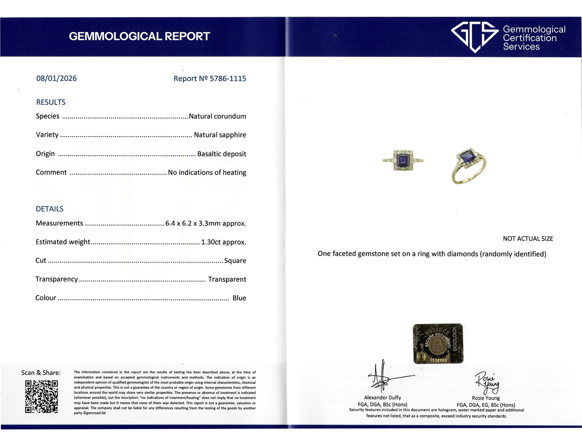 Art Deco sapphire and diamond ring. Set to centre with a square step-cut natural no heat sapphire in an open back claw setting with an approximate weight of 1.40 carats, encircled by fourteen round eight cut diamonds in open back grain settings, with a combined approximate weight of 0.28 carats, further set with ten tapering rectangular step cut diamonds in channel settings with a combined weight of 0.30 carats. The total approximate diamond weight is 0.58 carats, to a geometric cluster design featuring smooth borders, a linear open gallery and fancy open backholing, flanked by raised shoulders flowing through to a solid D-shape shank. Tested platinum, circa 1935, accompanied by Gemmological Certification Services report #5786-1115.