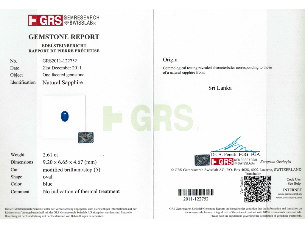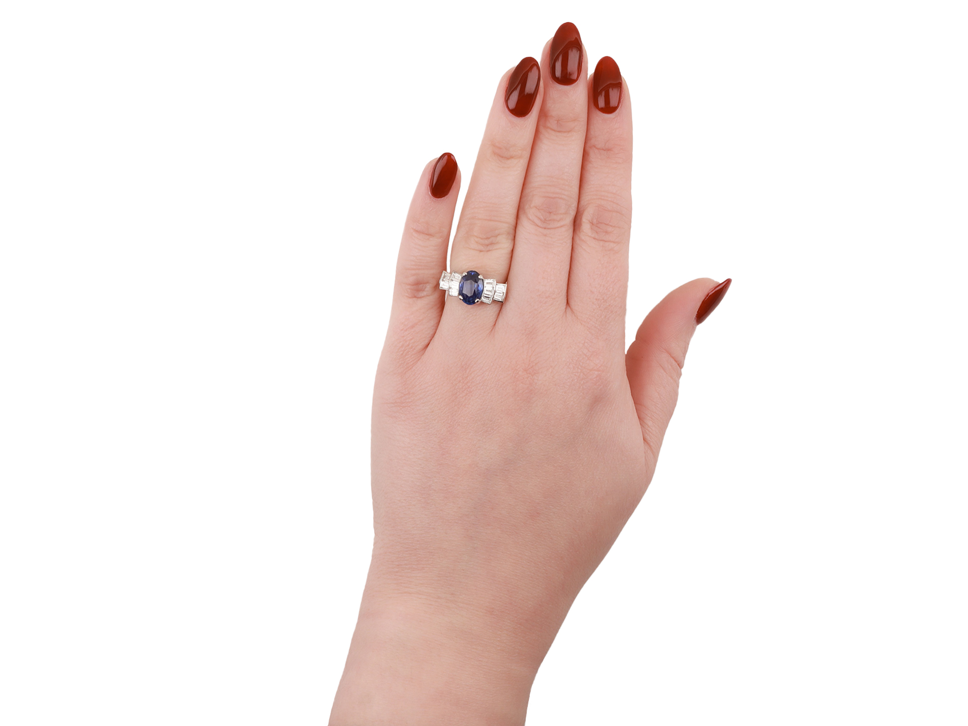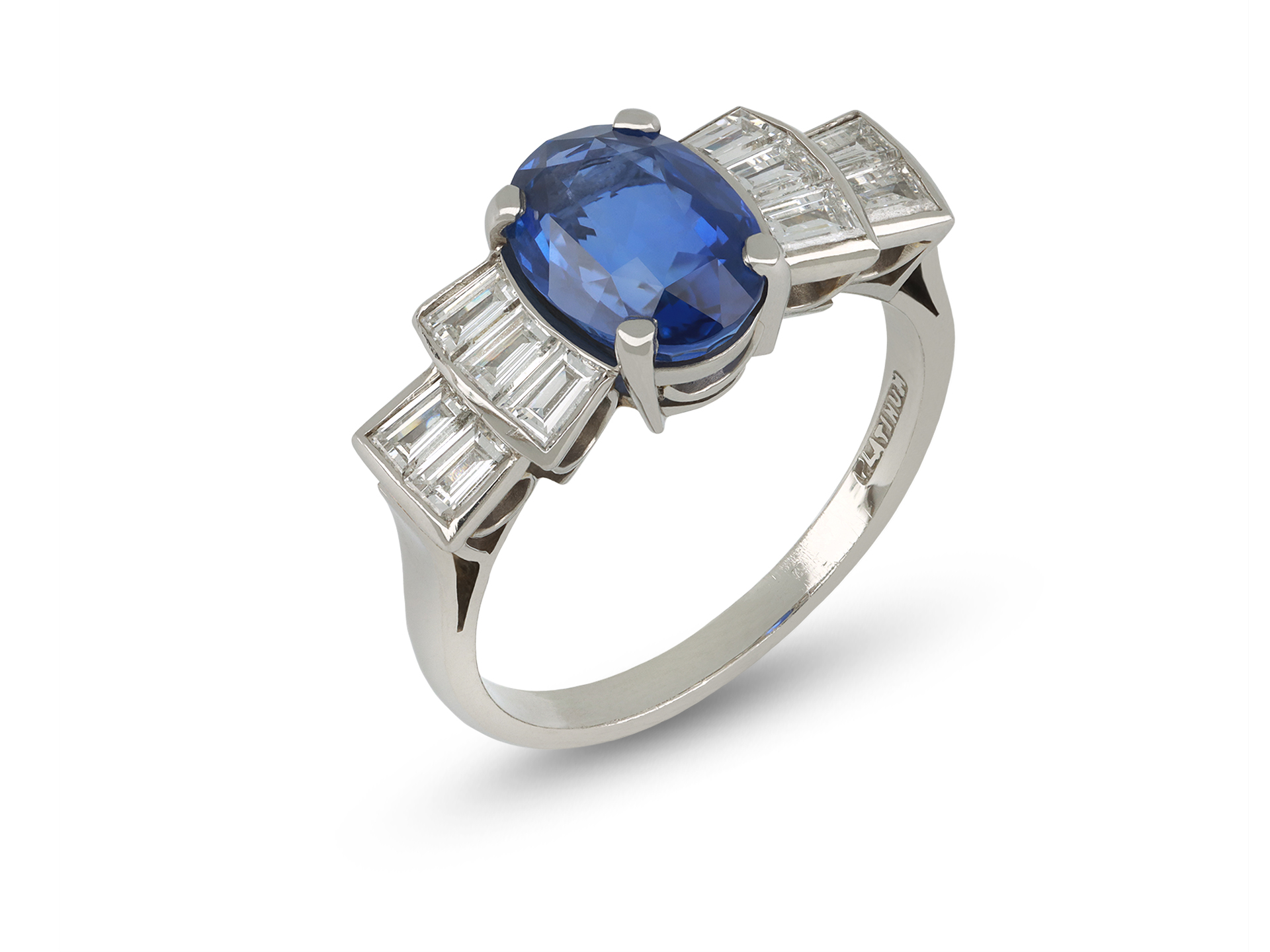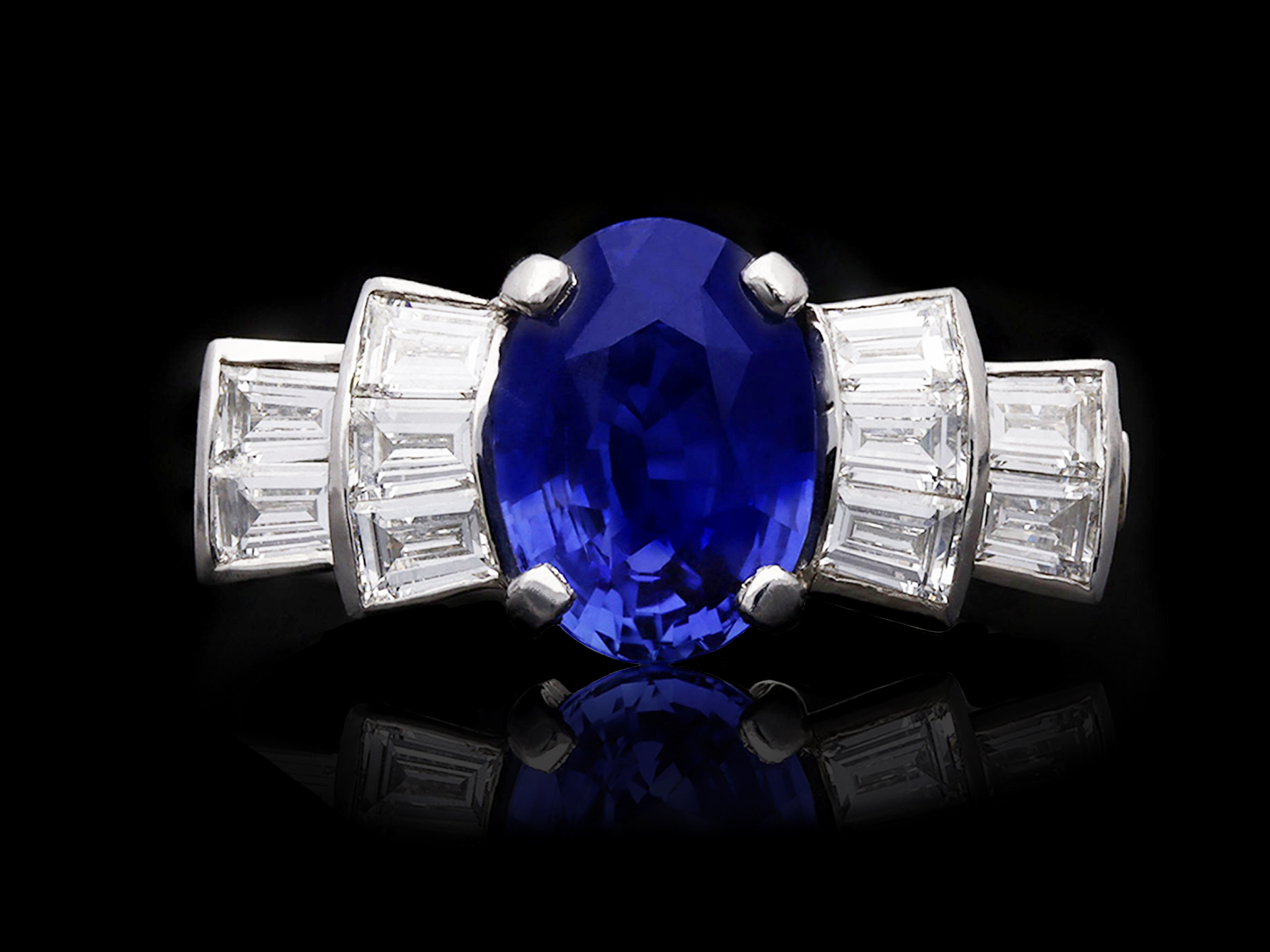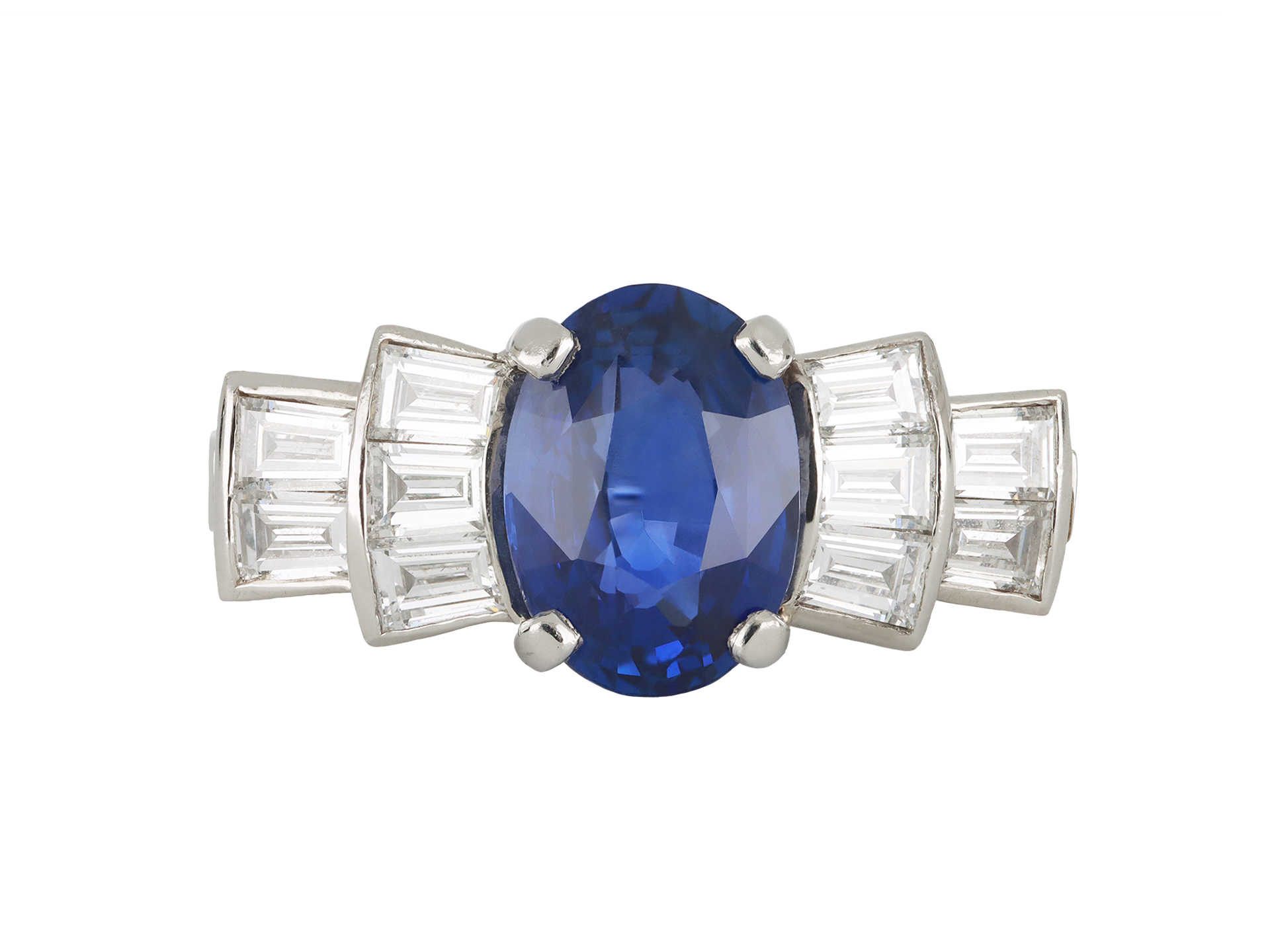 Art Deco sapphire and diamond ring. Set with an oval double brilliant cut natural unenhanced Ceylon sapphire in an open back four claw setting with a weight of 2.61 carats, flanked by a fan of ten tapered baguette cut diamonds in open back rubover channel settings with a combined approximate weight of 0.70 carats, to a solitaire design of tapering design, with a finely pierced gallery, fancy shaped backholing and a squared shank. Marked platinum, circa 1935, accompanied by Gem Research Swisslab (GRS) report #2011-122752.