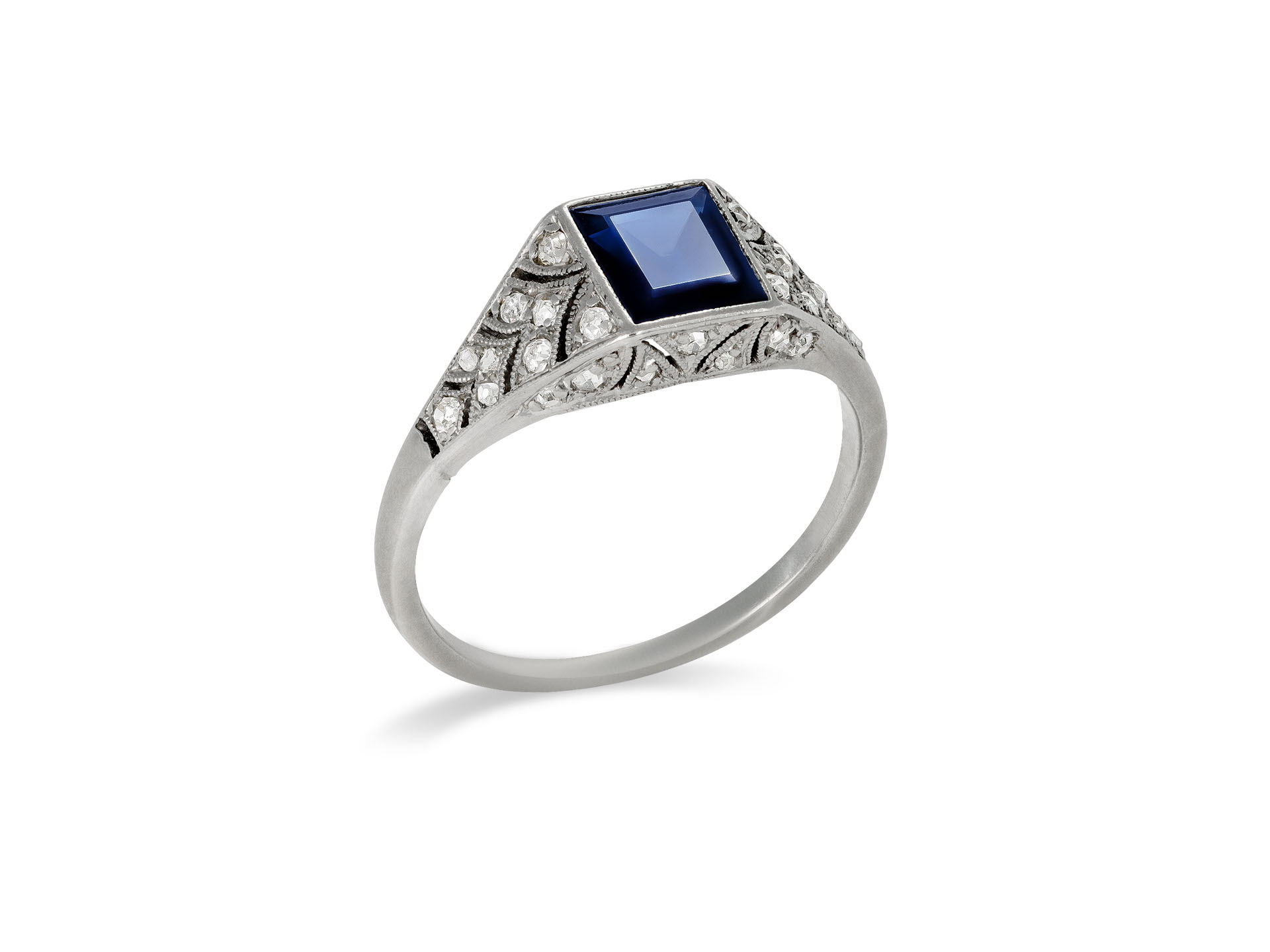 Art Deco sapphire cluster ring. Centrally set with a rectangular step cut natural no heat sapphire in an open back rubover setting with an approximate weight of 1.20 carats, flanked by thirty two round mixed old cut diamonds in open back grain settings with a combined weight of 0.40 carats to an elegant cluster with intricate open work and millegrain edges throughout, an integrated gallery and fancy shape open backholing, the shoulders tapering to a solid D-shape shank. Marked platinum, numbered '24608', French, circa 1920.