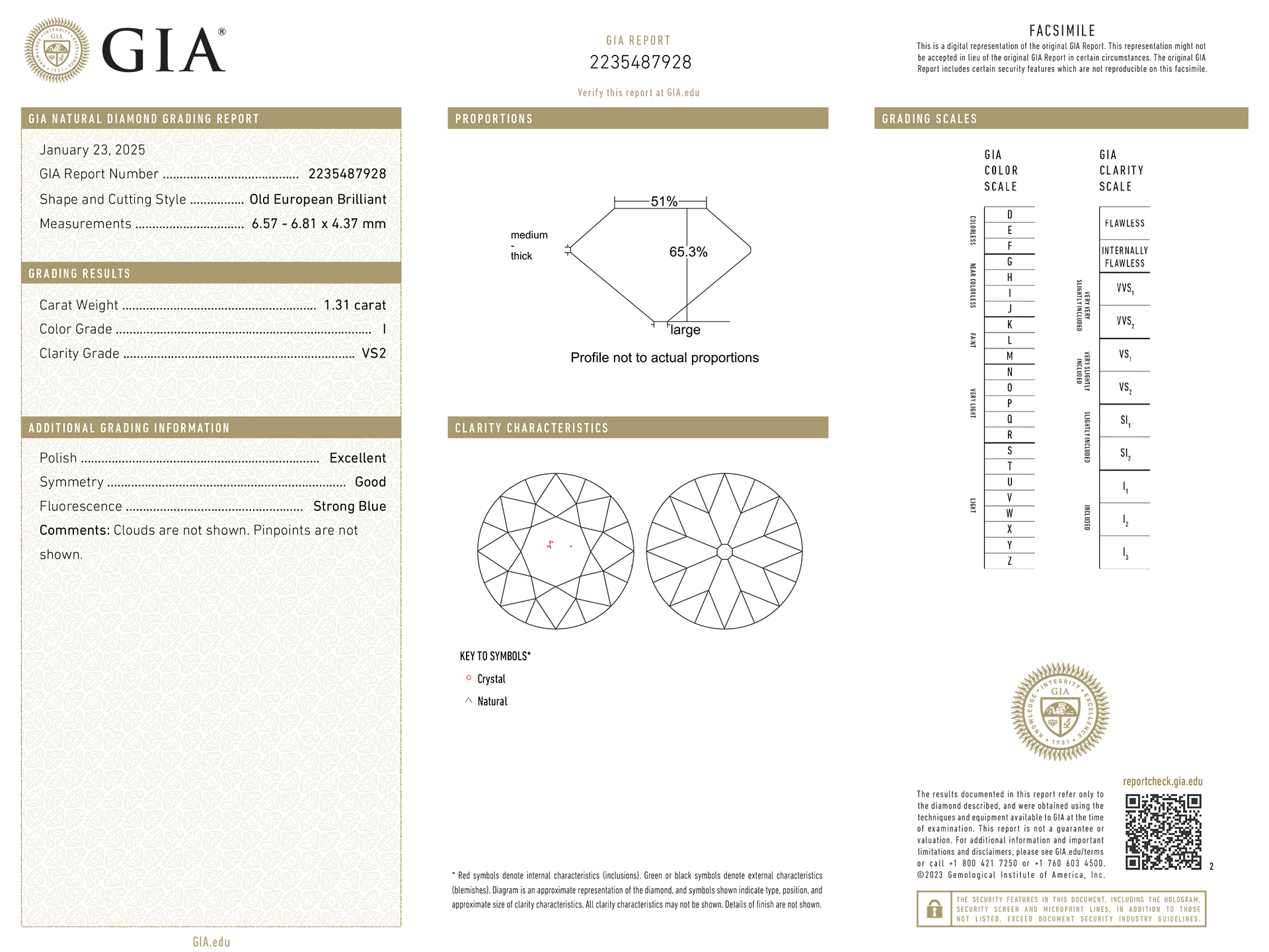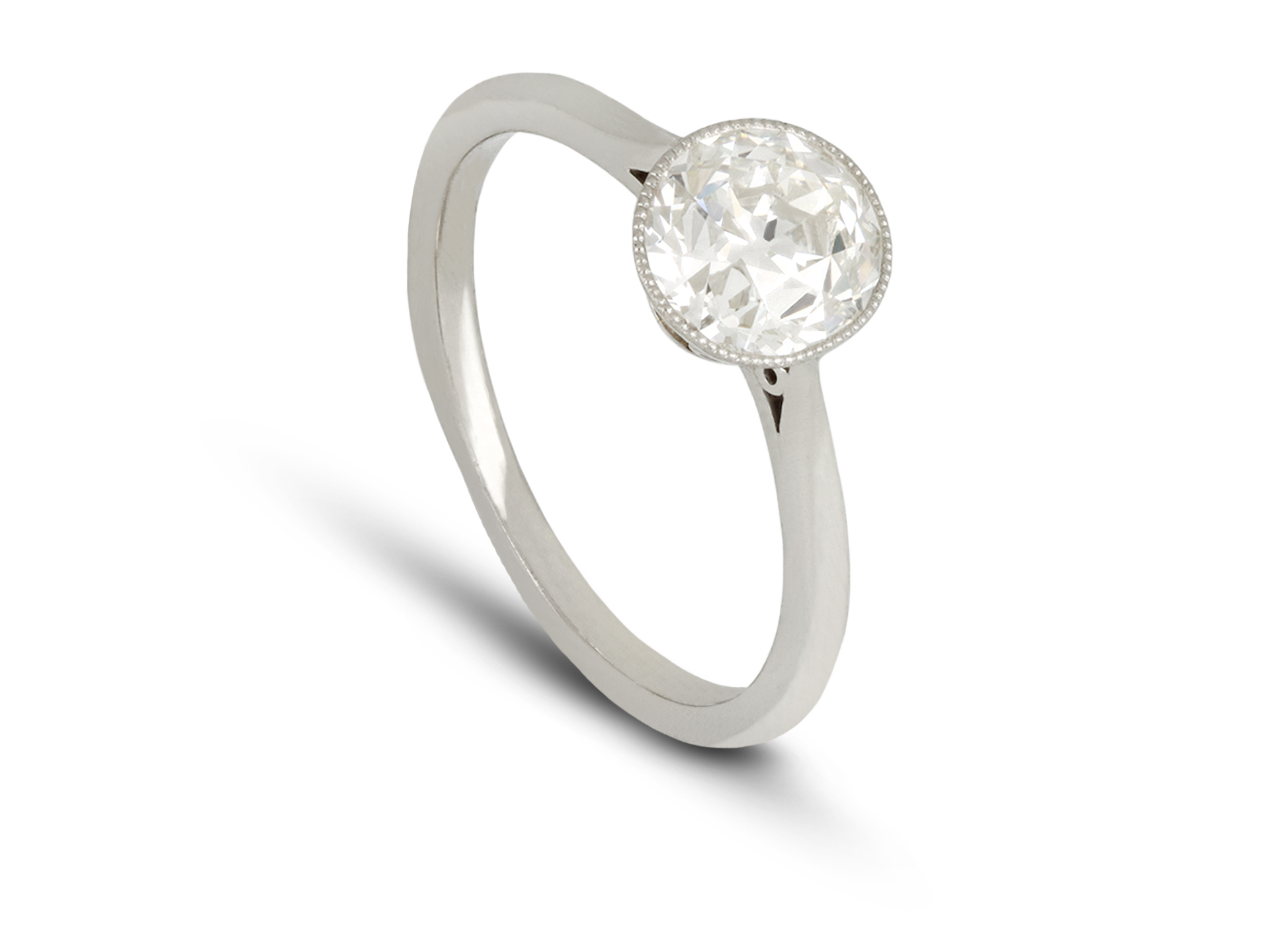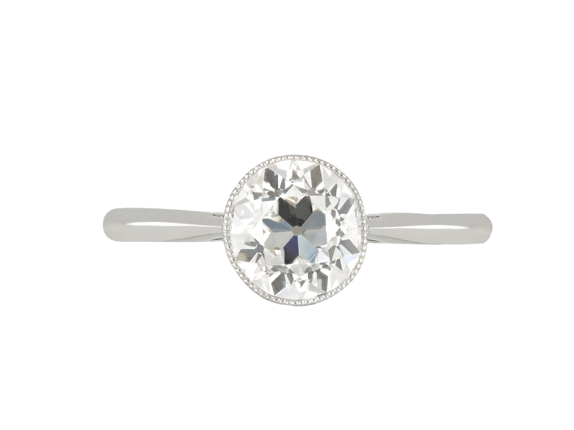 Art Deco diamond solitaire ring. Centrally set with a round old cut diamond, I colour, VS2 clarity, with a weight of 1.31 carats, in an open back rubover setting, to an elegant solitaire design with millegrain borders, an intricately pierced gallery with circular motifs, open back holing and tapered shoulders with chenier details flowing through to a solid D-shape shank. Tested platinum, circa 1920, accompanied by Gemmological Institute of America (GIA) report #2235487928.