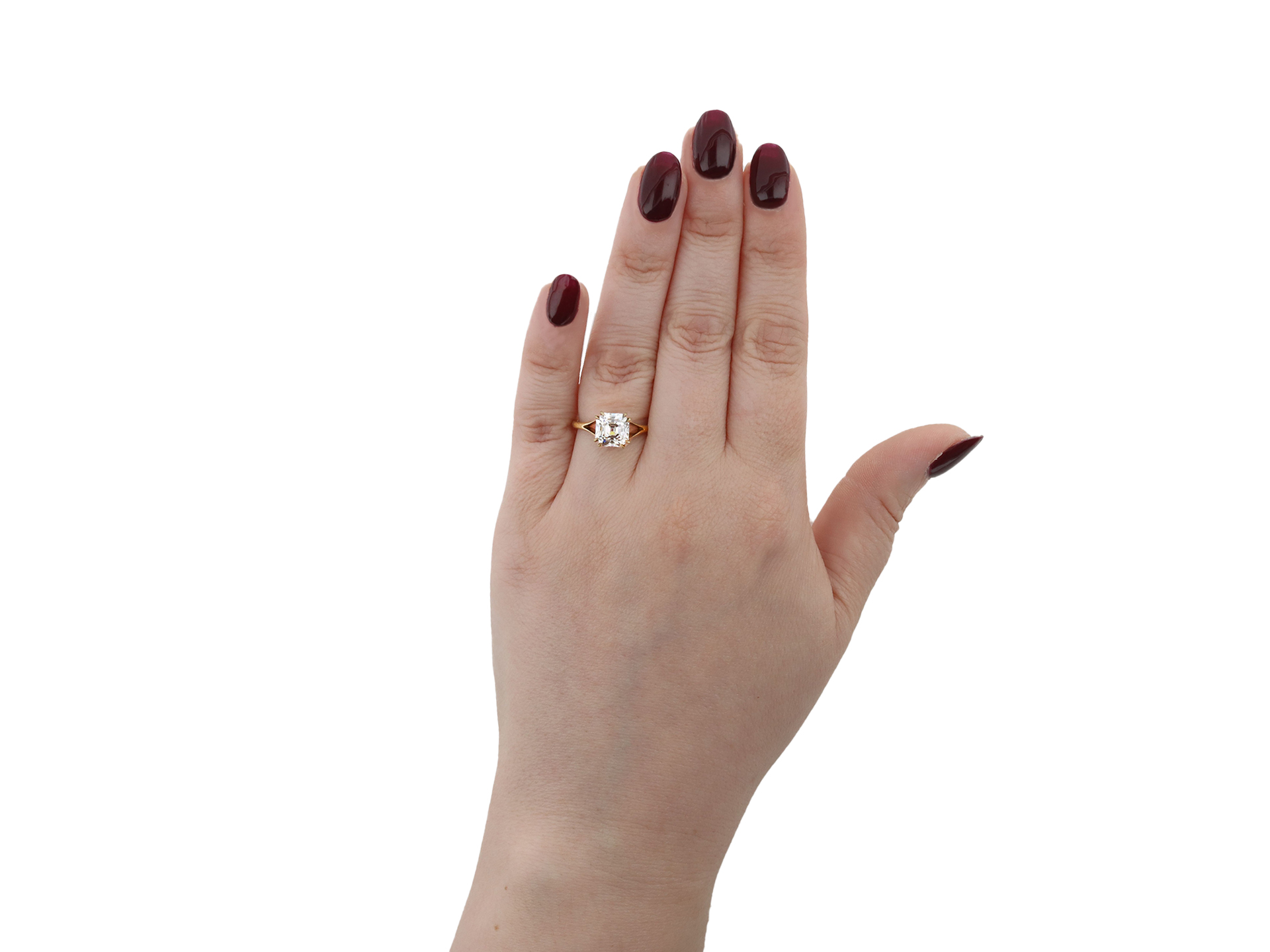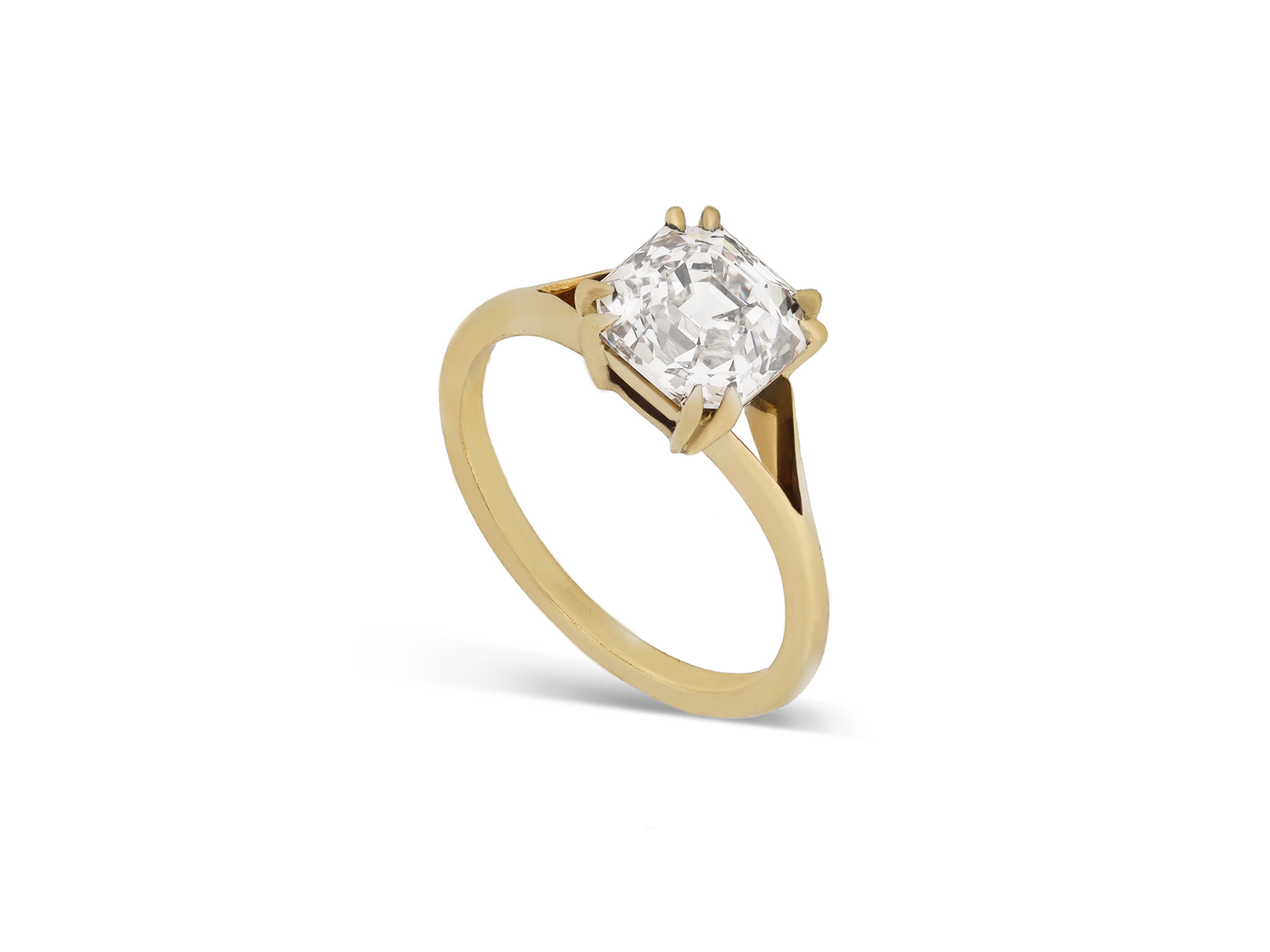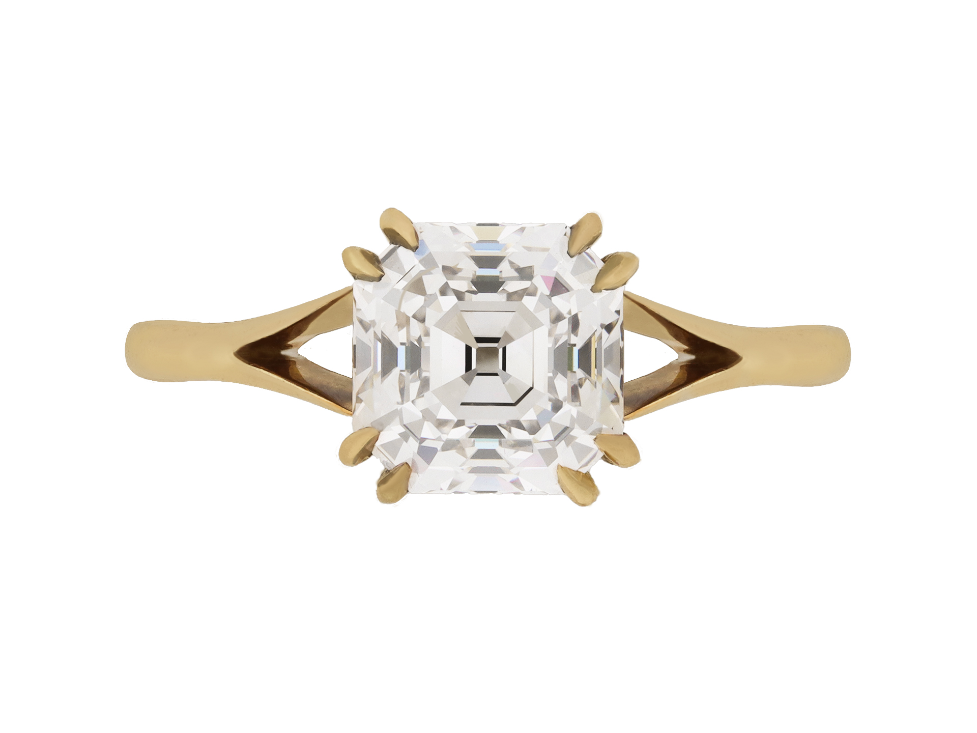 Asscher cut diamond solitaire ring. Set to centre with a square asscher cut diamond, L colour, VVS2 clarity, with a weight of 2.27 carats in an open back claw setting, to an elegant solitaire design featuring double claw detail, a geometric gallery and square open backholing, leading to split shoulders and flowing through to a solid D-shape shank. Tested yellow gold, circa 1950, accompanied by Gemological Institute of America (GIA) report #5232546818.