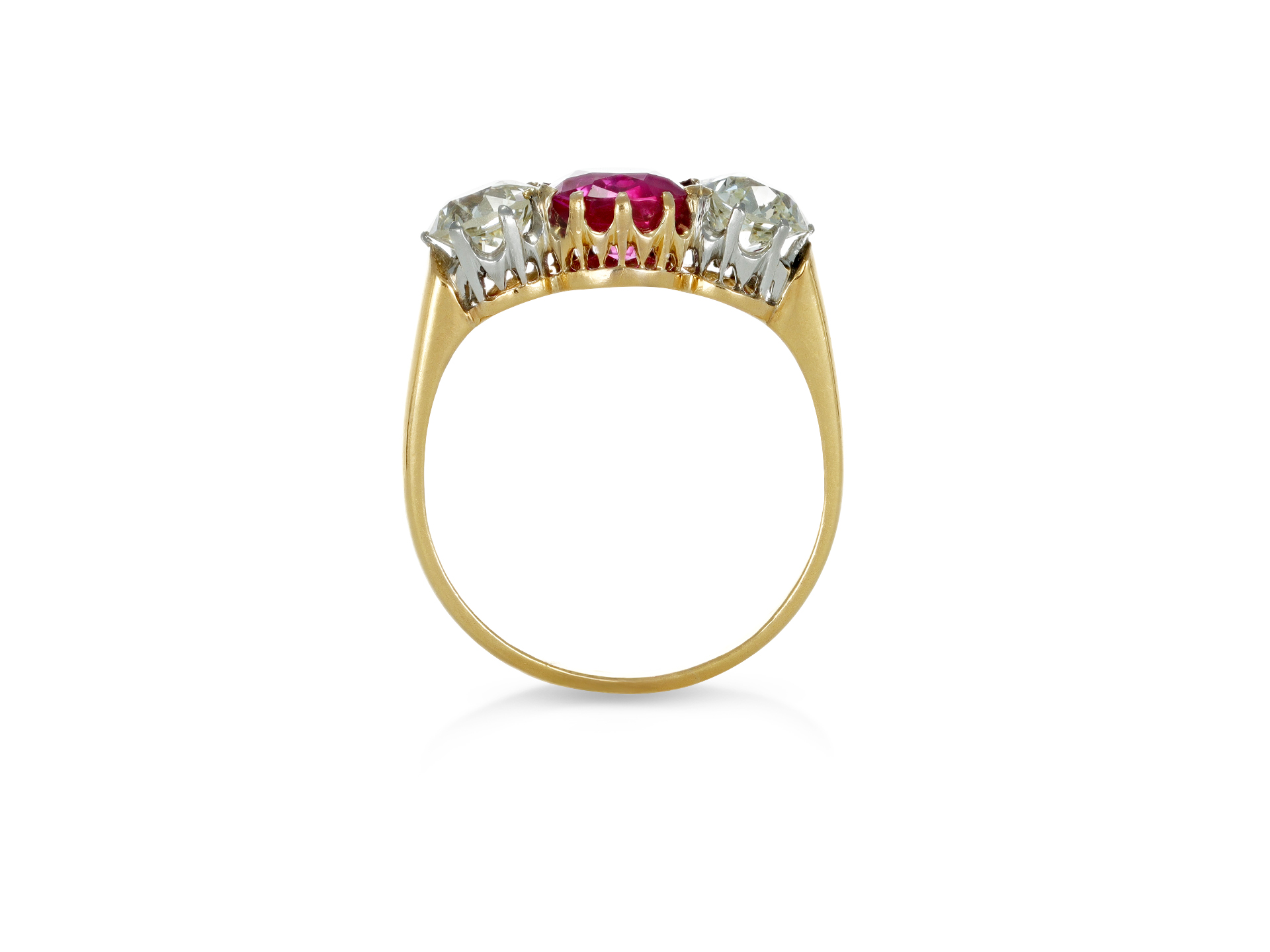 Belle Époque ruby and diamond three stone ring. Set to centre with a single cushion shape old mine cut natural no heat Burmese ruby in an open back claw setting with an approximate weight of 1.70 carats, flanked by two round old cut diamonds in open back claw settings with a combined approximate weight of 1.25 carats, to an elegant three stone design with curving claws, a decoratively pierced gallery and open backholing, leading to smooth shoulders and flowing through to a solid shank. Marked 18 carat yellow gold and platinum, French, circa 1910, accompanied by Gemmological Certification Services report #79213-12.