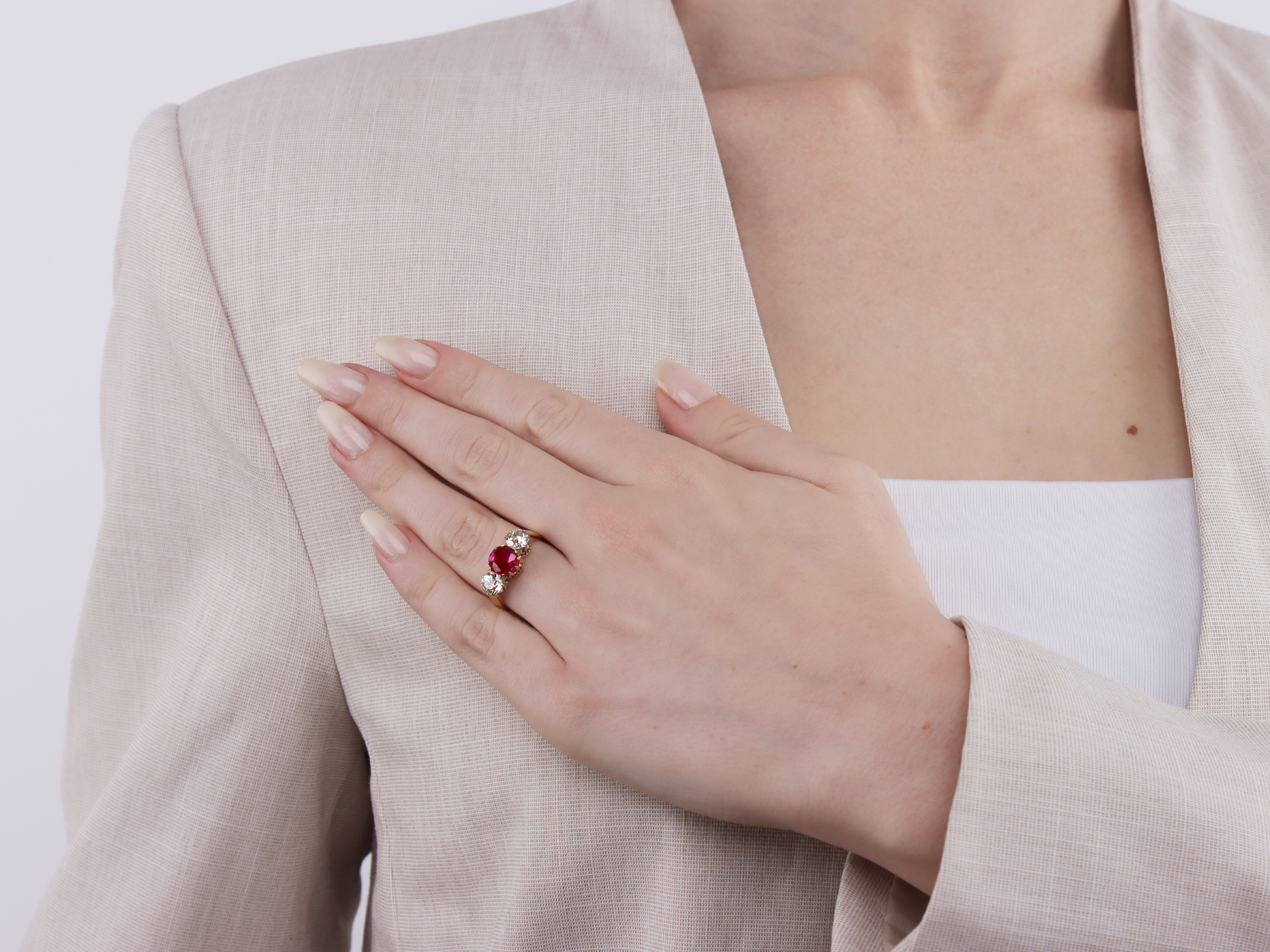 Belle Époque ruby and diamond three stone ring, French, circa 1910.