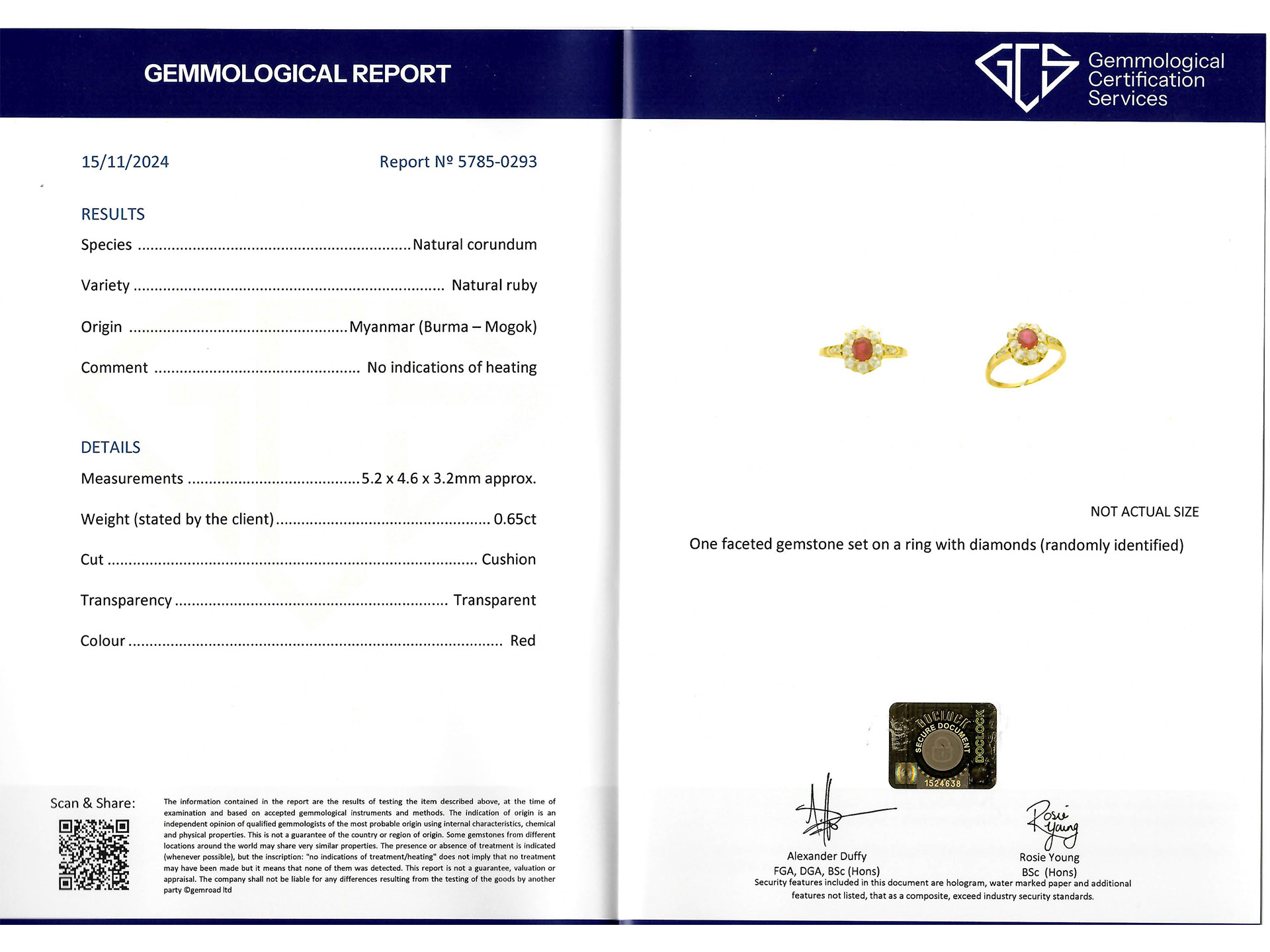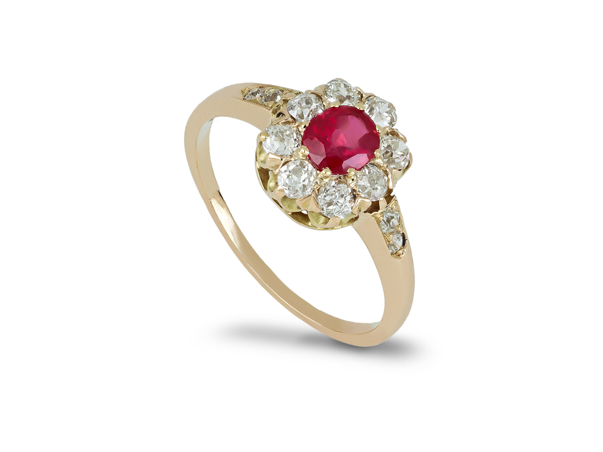 Burmese ruby and diamond coronet cluster ring. Centrally set with a cushion shape old cut natural no heat Burmese ruby with an approximate weight of 0.65 carats in an open back claw setting, encircled by eight cushion shape old mine diamonds in open back claw and grain settings with an approximate combined weight of 0.65 carats, further flanked by four cushion shape old mine diamonds in open back grain settings with an combined weight of 0.10 carats. The total approximate diamond weight is 0.75 carats, to an elegant coronet cluster design featuring curving claws, a decorative gallery and fancy shape open backholing, leading to smoothly conforming shoulders and flowing through to a solid flat shank. Marked 14 carat yellow gold, assay mark for Vienna, Austro-Hungarian, circa 1905, accompanied by Gemmological Certification Services report #5785-0293.