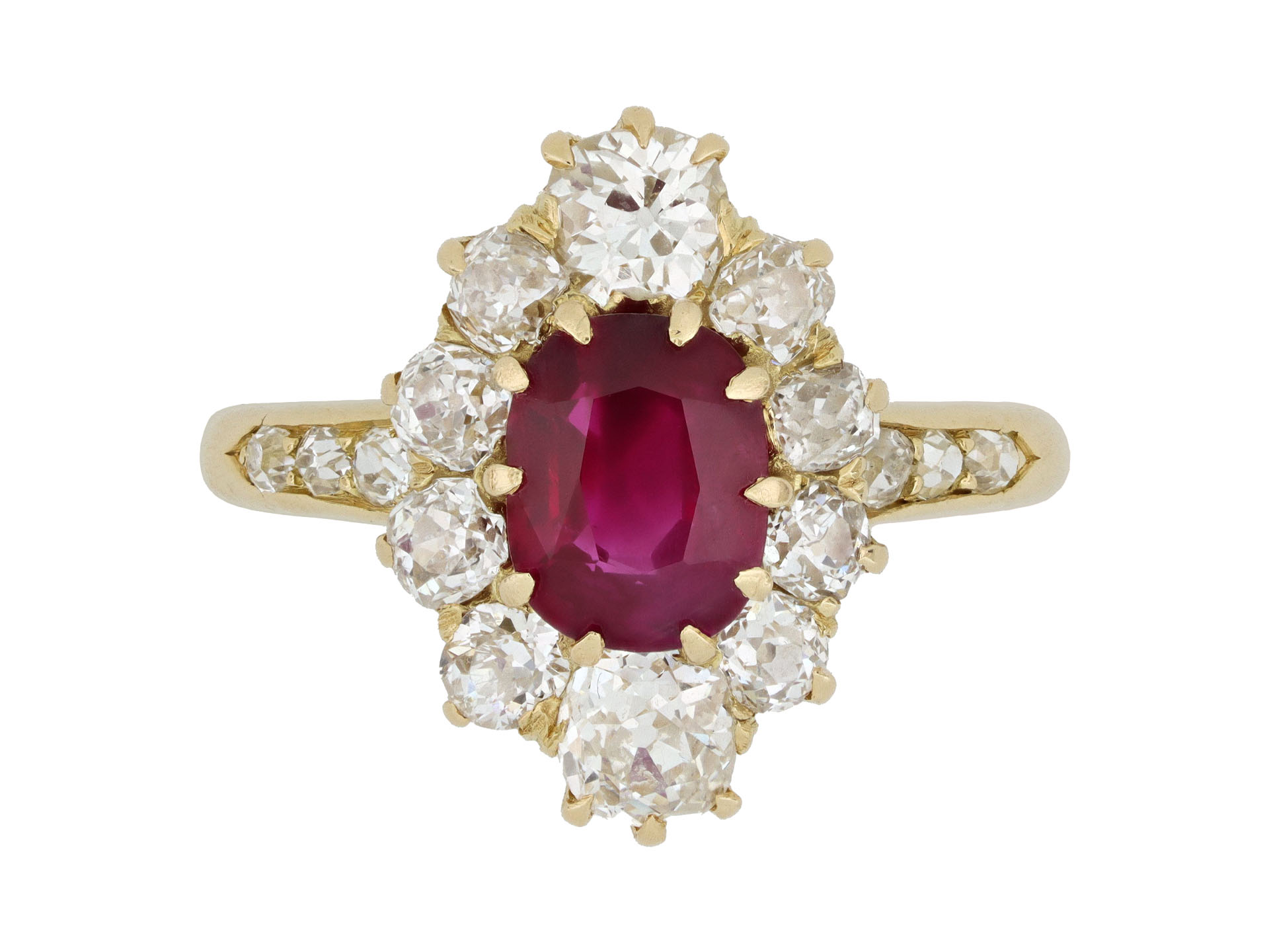 Burmese Ruby and diamond coronet cluster ring. Set to centre with a cushion shape old cut natural no heat Burmese ruby in an open back claw setting with an approximate weight of 1.30 carats, encircled by ten cushion shape old mine diamonds in open back claw and grain settings with a combined approximate weight of 1.90 carats, and flanked by six cushion shape old mine diamonds in open back grain settings with a combined weight of 0.30 carats. The total approximate diamond weight is 2.20 carats to an elegant elongated cluster featuring curving claws, a pierced gallery and fancy shape open backholing, the shoulders flowing through to a solid D-shape shank. Tested yellow gold, partially engraved 'la vie est... ..12.94', maker's mark 'FK' for Franz Keiler, circa 1890, accompanied by Gemmological Certification Services report #5786-0550.