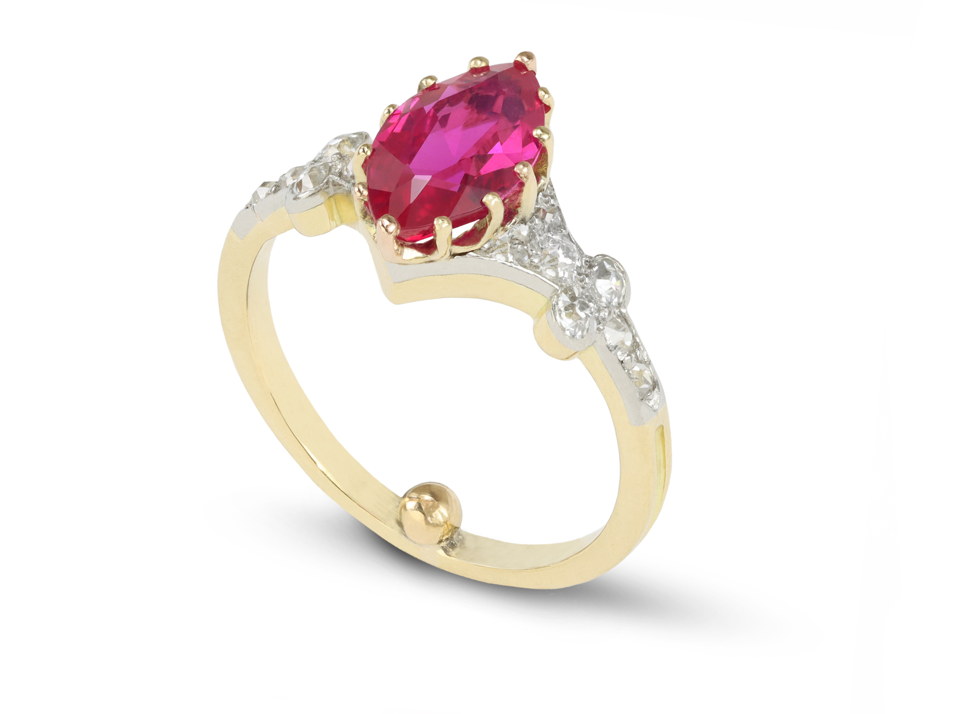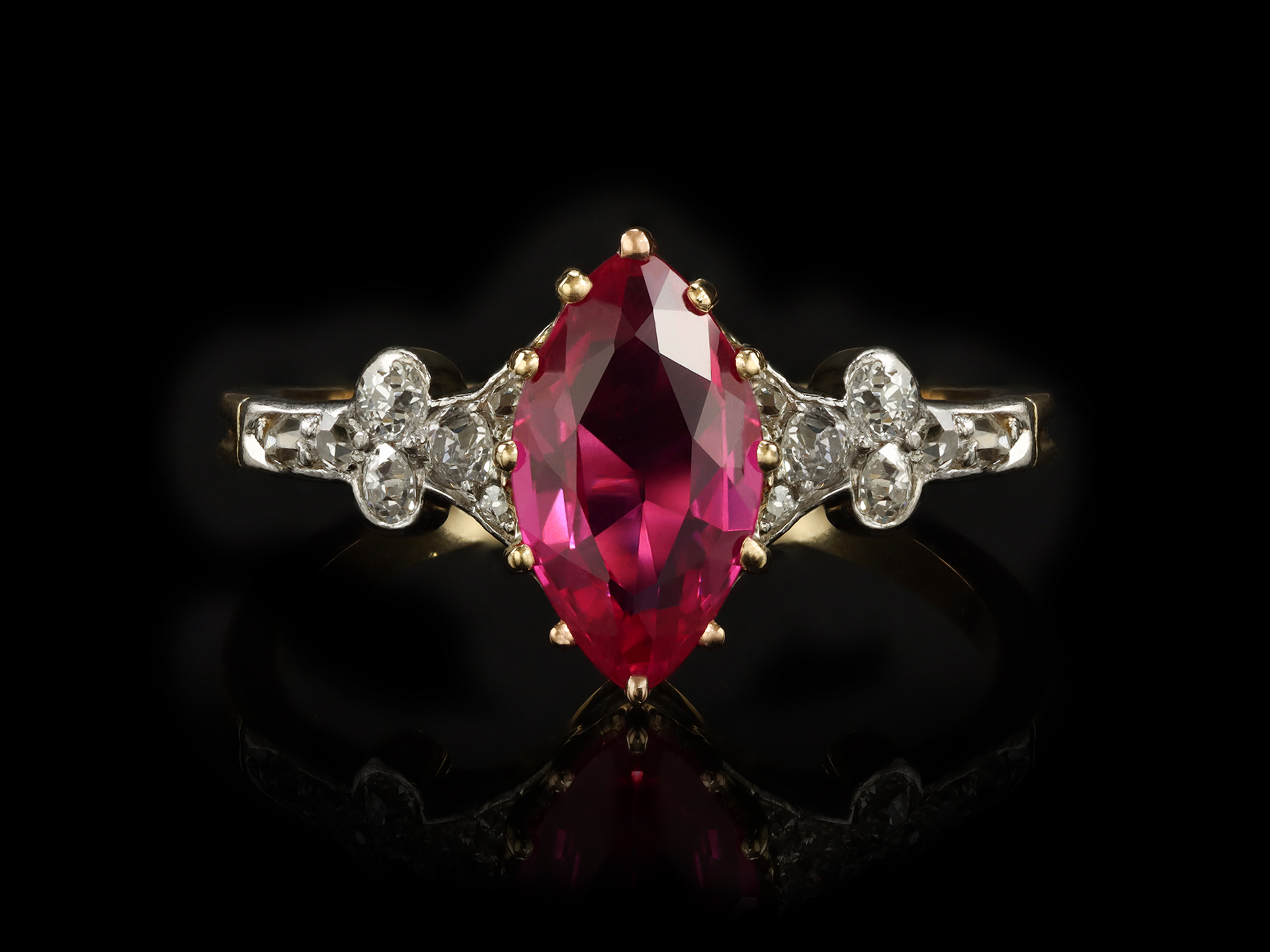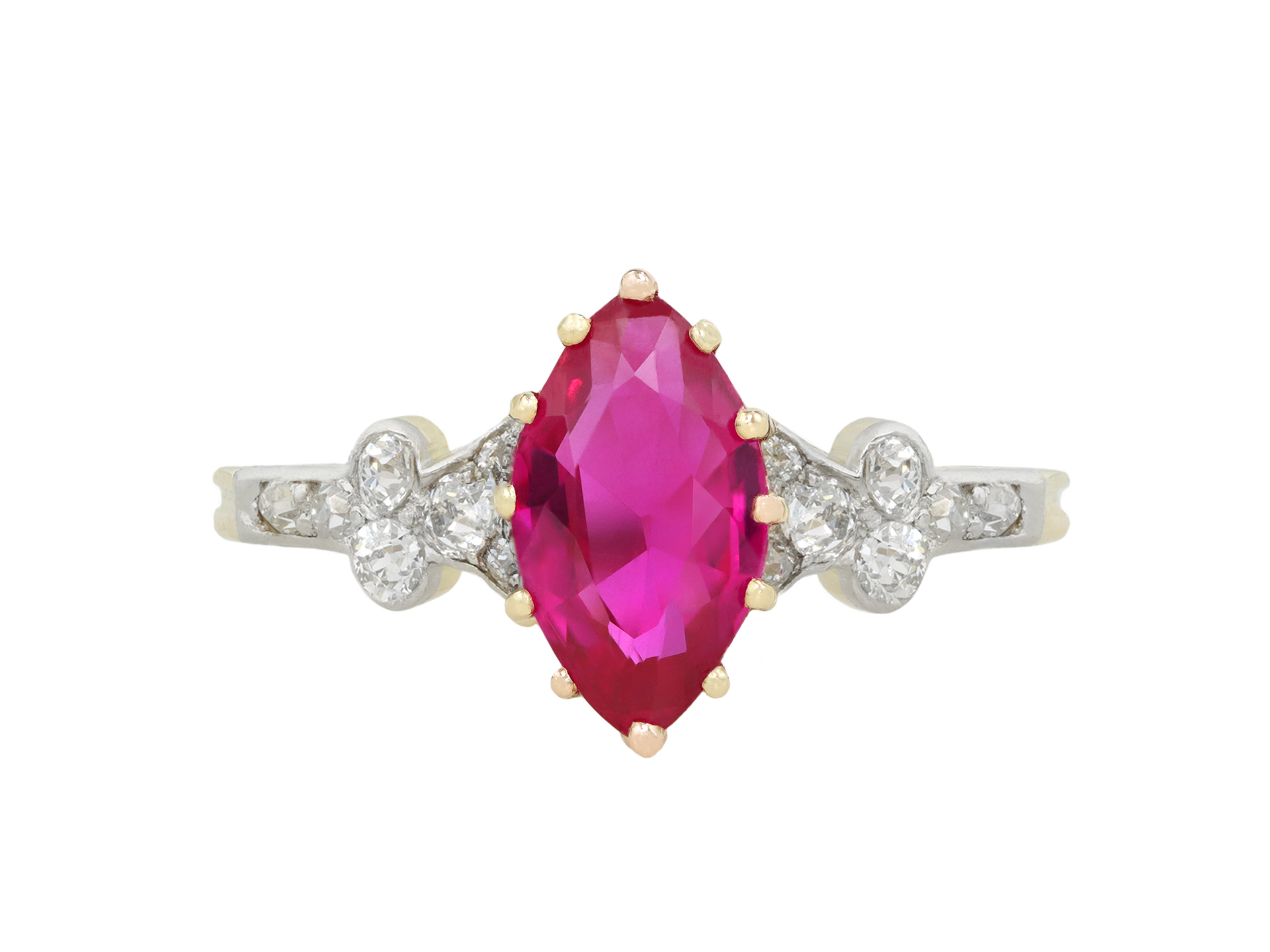 Burmese ruby and diamond flanked solitaire ring. Set to centre with a marquise shape old cut natural unenhanced Burmese ruby in an open back claw setting with a weight of 1.47 carats, flanked by fourteen round old cut diamonds in open back rubover and grain settings with an approximate combined weight of 0.36 carats, to an elegant design featuring curving claws, a smooth gallery and intricate open backholing, leading to an elegant tapered shoulders which flow through to a solid D-shape shank. Tested yellow gold and platinum, circa 1915, accompanied by Deutsche Stiftung Edelsteinforschung (DSEF) report #038904.