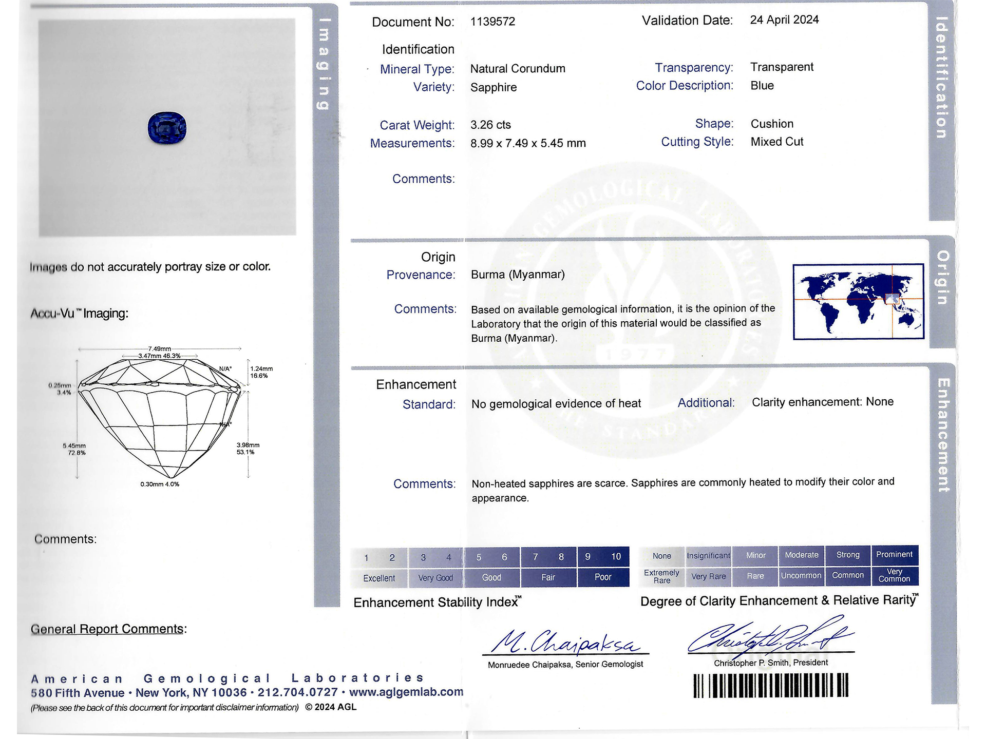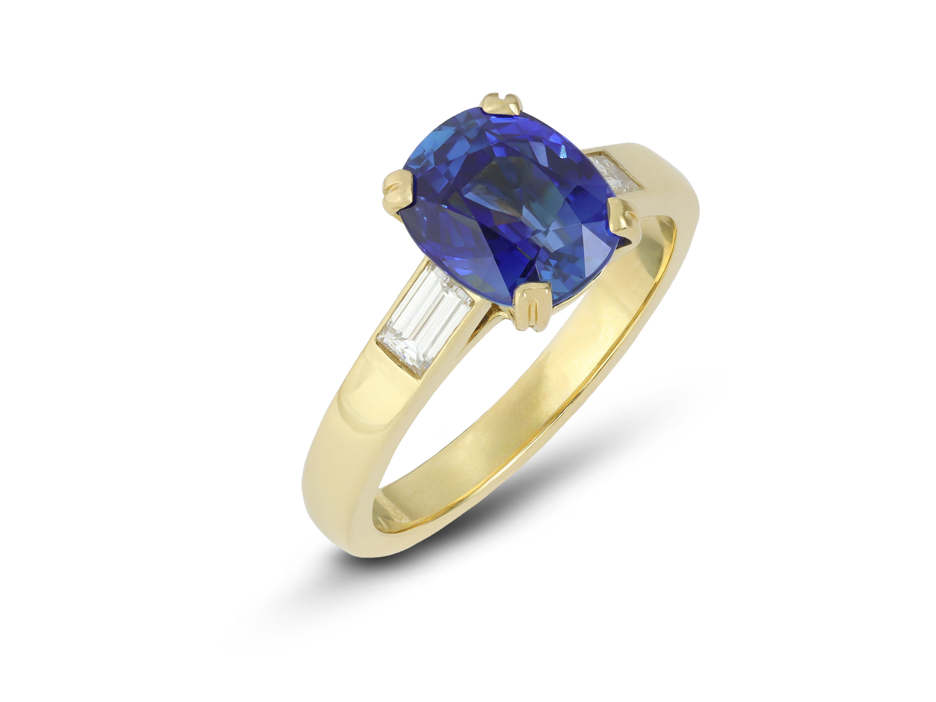 Burmese sapphire and diamond flanked solitaire ring. Set to centre with a cushion shape mixed cut natural unenhanced Burmese sapphire in an open back claw setting with a weight of 3.26 carats, flanked by two rectangular baguette cut diamonds in open back rubover settings with a combined approximate weight of 0.30 carats, to an elegant flanked solitaire design featuring corner claws with grooved detail, a pierced gallery and open backholing, leading to raised shoulders and flowing through to a solid shank. Tested yellow gold, circa 1970, accompanied by American Gemological Laboratories report #1139572.