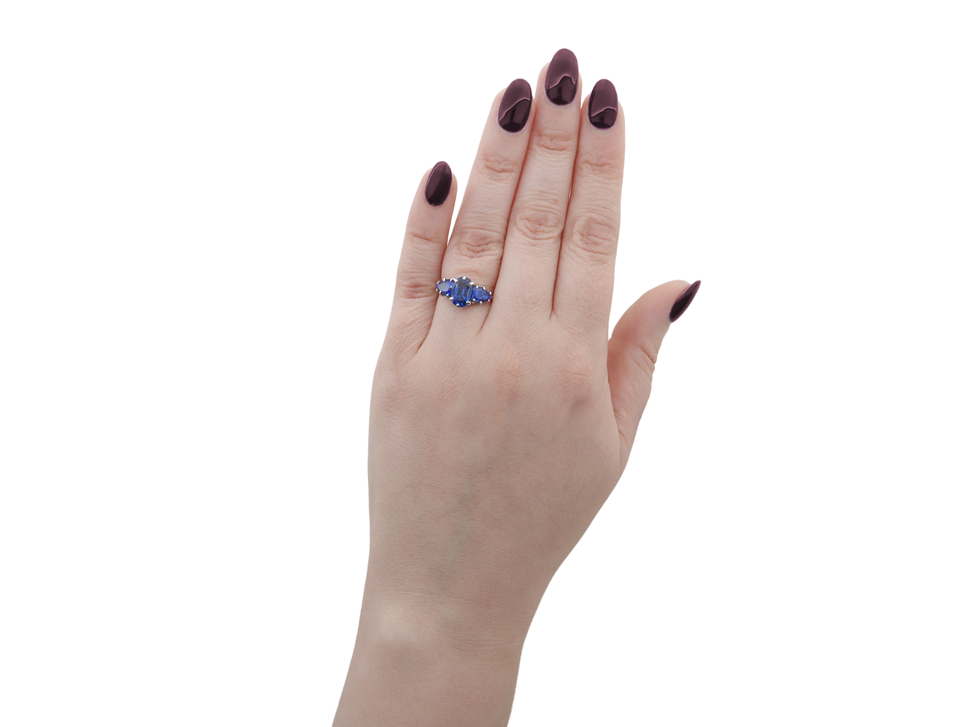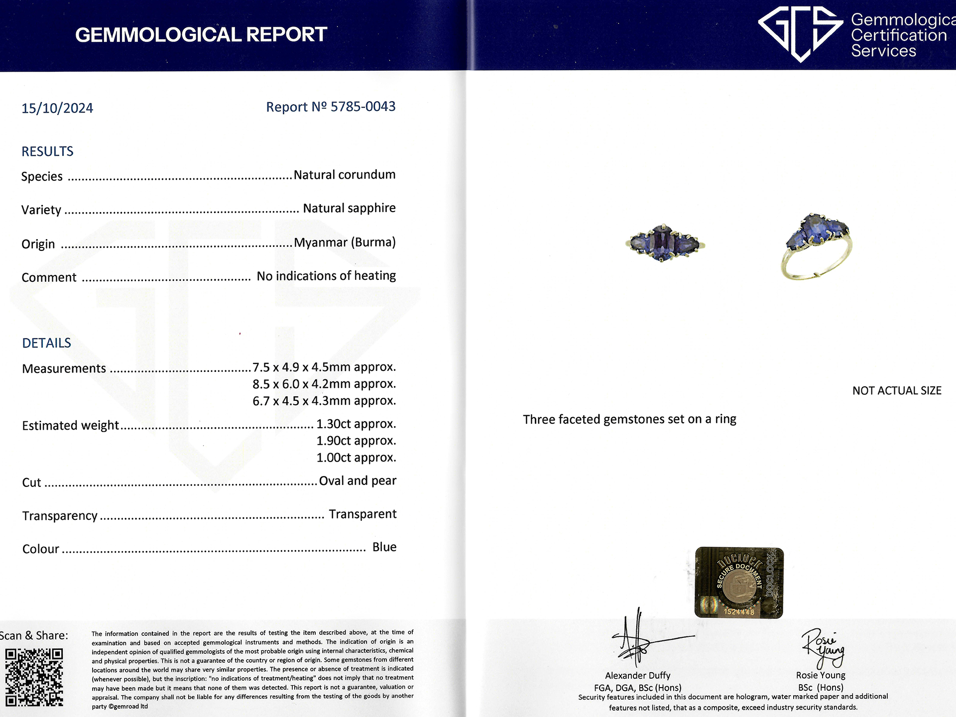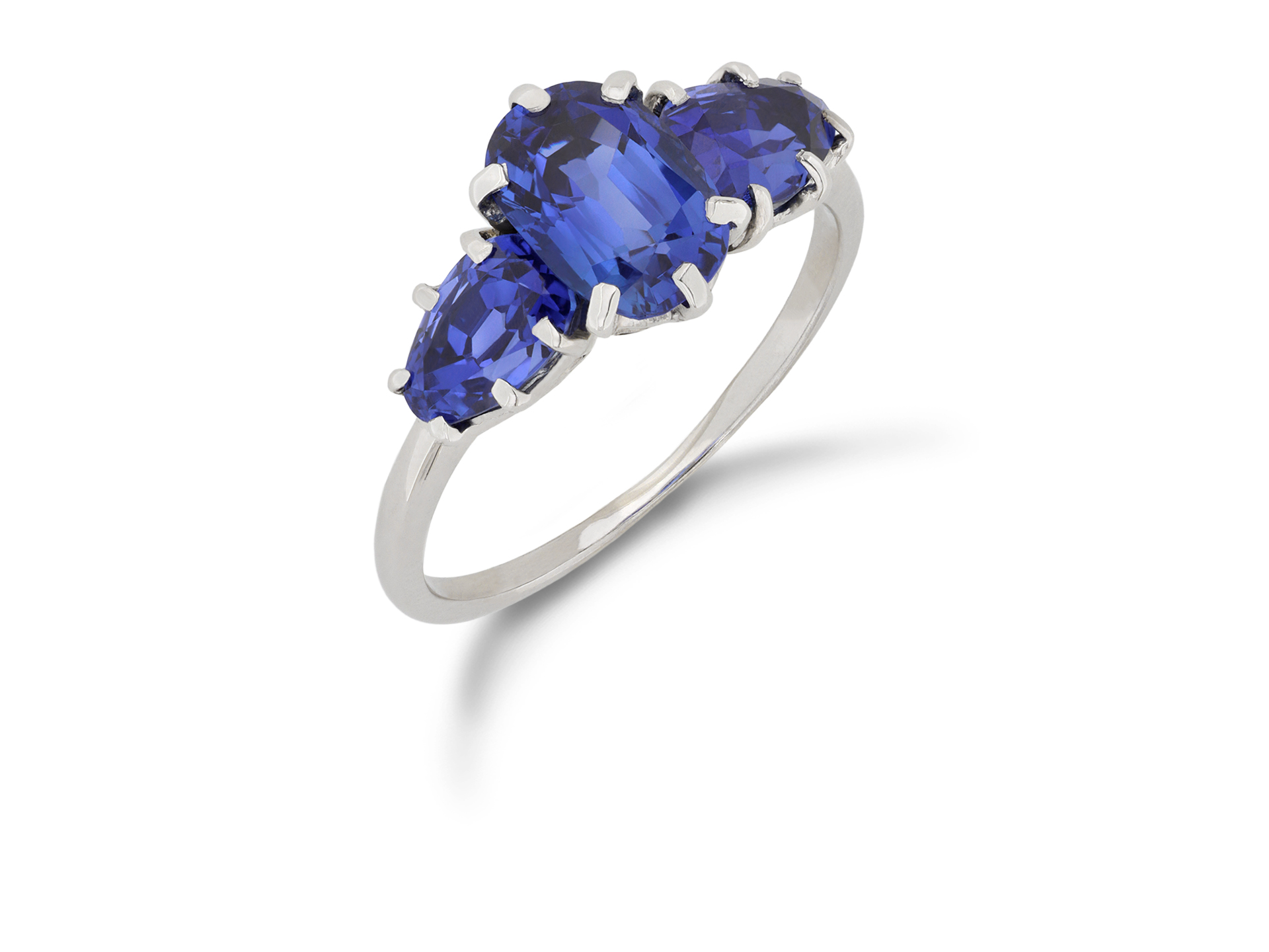 Burmese sapphire three stone ring. Set to centre with an oval old cut natural unenhanced Burmese sapphire in an open back claw setting with an approximate weight of 1.90 carats, flanked by two natural unenhanced drop shape sapphires in open back claw settings with a combined weight of 2.30 carats. The total approximate sapphire weight is 4.20 carats, to a tapering three stone design featuring curving claws, a decorative gallery with scrolling motifs and fancy shape open backholing, leading to smooth shoulders which flow through to a solid D-shape shank. Settings tested platinum, shank tested white gold, circa 1920, accompanied by Gemmological Certification Services report #5785-0043.