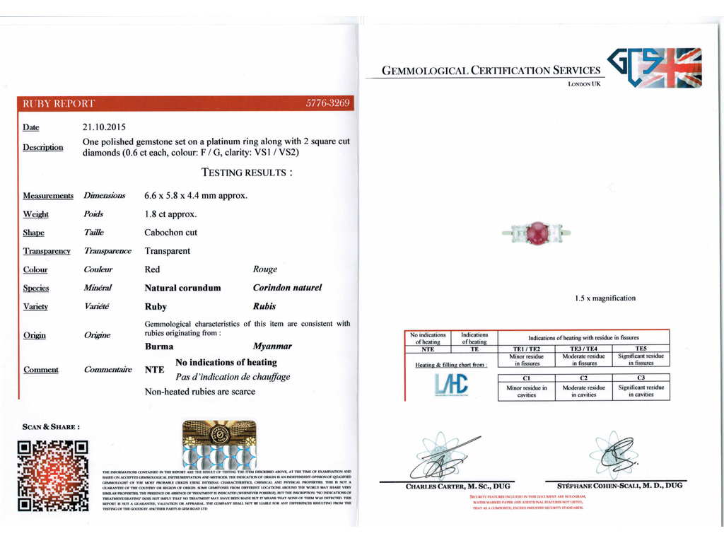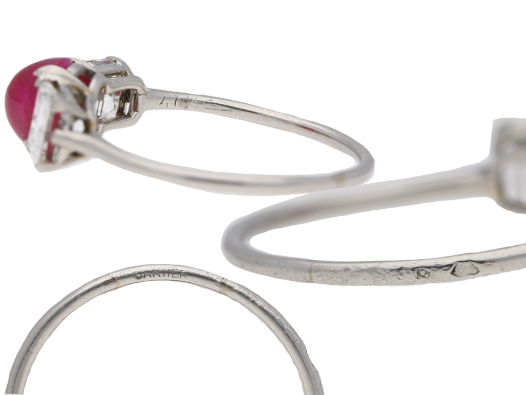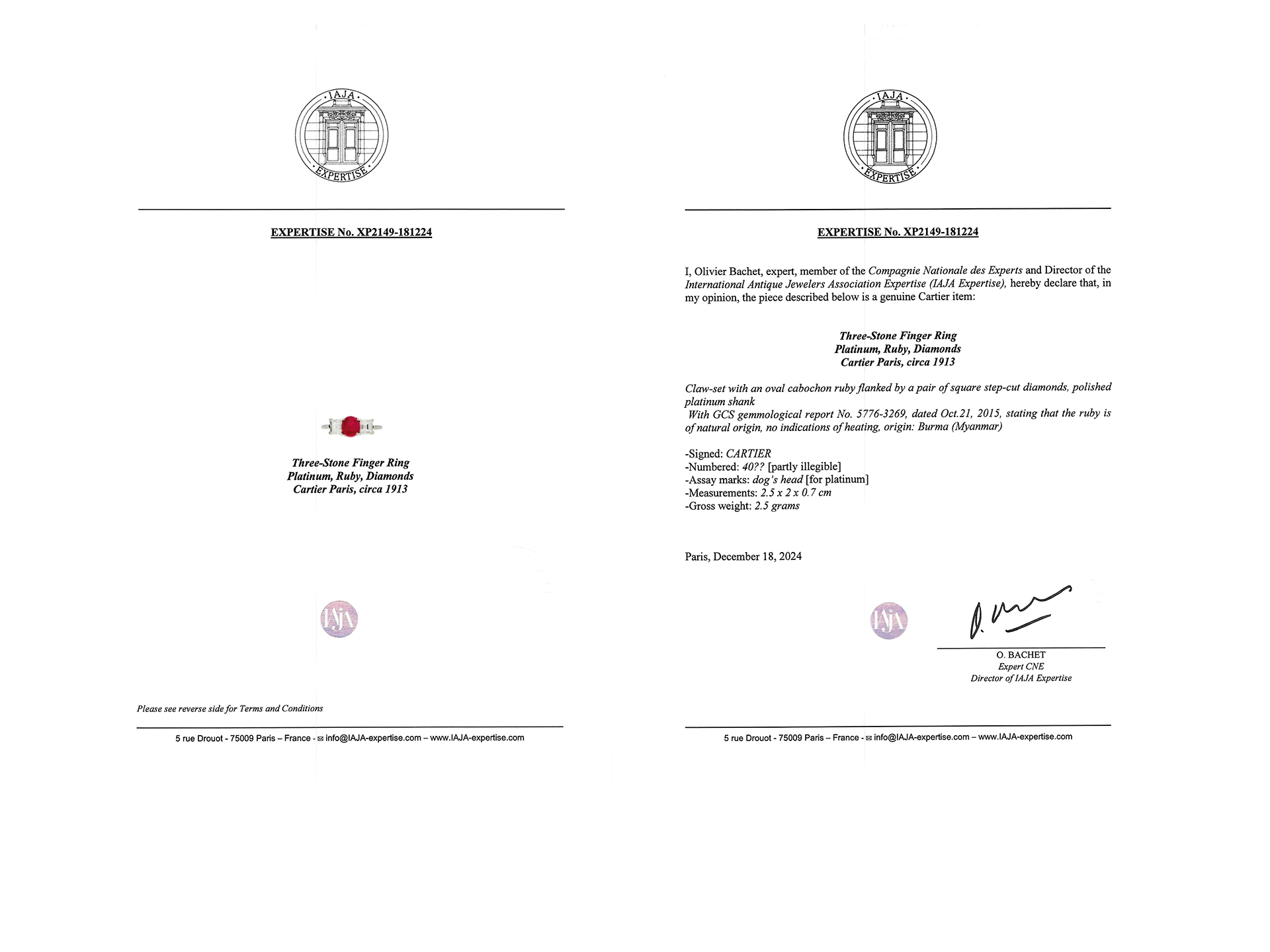 Cartier Burmese ruby and diamond ring. Set with an oval cabochon natural unenhanced Burmese ruby in an open back claw setting with an approximate weight of 1.80 carats, further set with two square step-cut diamonds in open back claw settings with a combined approximate weight of 1.20 carats, to a stylish three stone design, featuring curving corner claws, a structured openwork gallery and fancy open backholing, flanked by trumpeting split shoulders flowing through to a solid slim D-shape shank. Marked platinum, signed 'CARTIER', partial maker’s mark for Henri Picq, French, circa 1913, accompanied by Gemmological Certification Services report #5775-3269, accompanied by IAJA Expertise report #XP2149-181224.