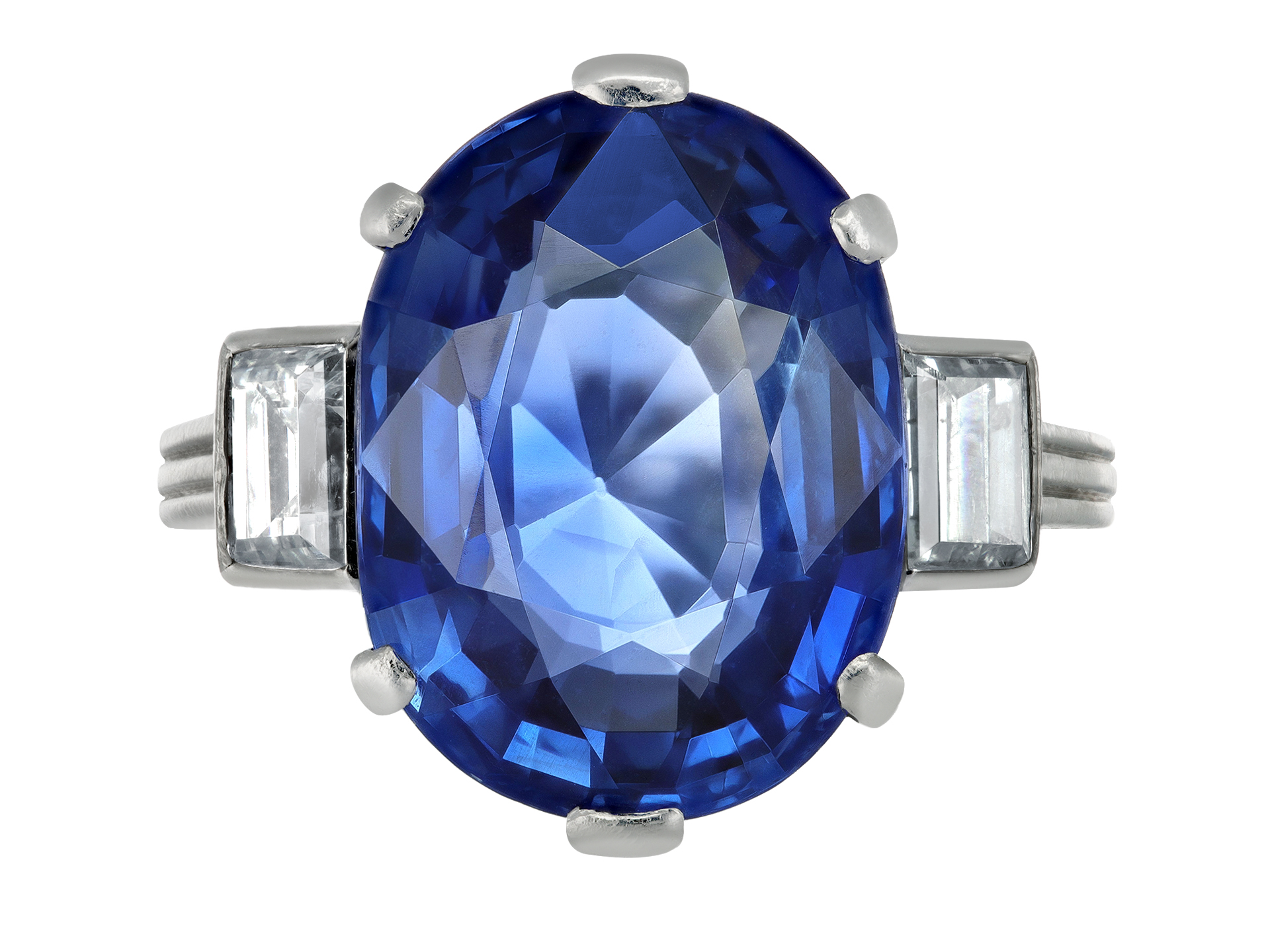 Ceylon sapphire and diamond ring. Set to centre with an oval old cut natural no heat Ceylon sapphire in an open back claw setting with an approximate weight of 7.30 carats, flanked by rectangular step cut diamonds in open back rubover settings with an approximate combined weight of 0.60 carats, to an impressive flanked solitaire design featuring polished edges, a geometric gallery and fancy shape open backholing, leading to raised shoulders with linear engraved detail which flow through to a solid shank. Marked platinum, French, circa 1920, accompanied by Gemmological Certification Services report #5785-1600.