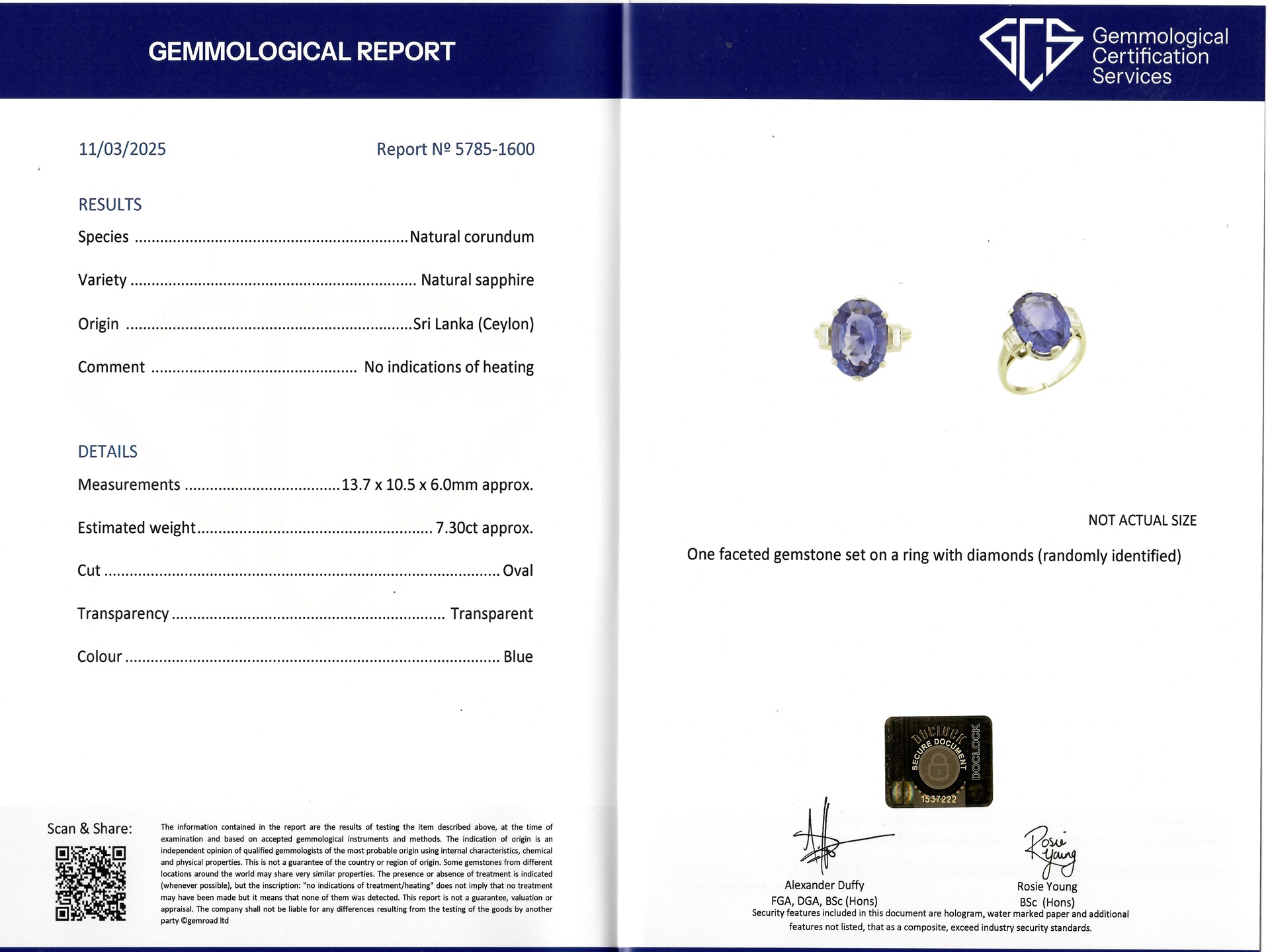 Gemstone Ceylon Unheated Sapphire, Old Cut, approximately 7.3ct 2 x Diamonds, Step Cut, approximately 0.6ct total