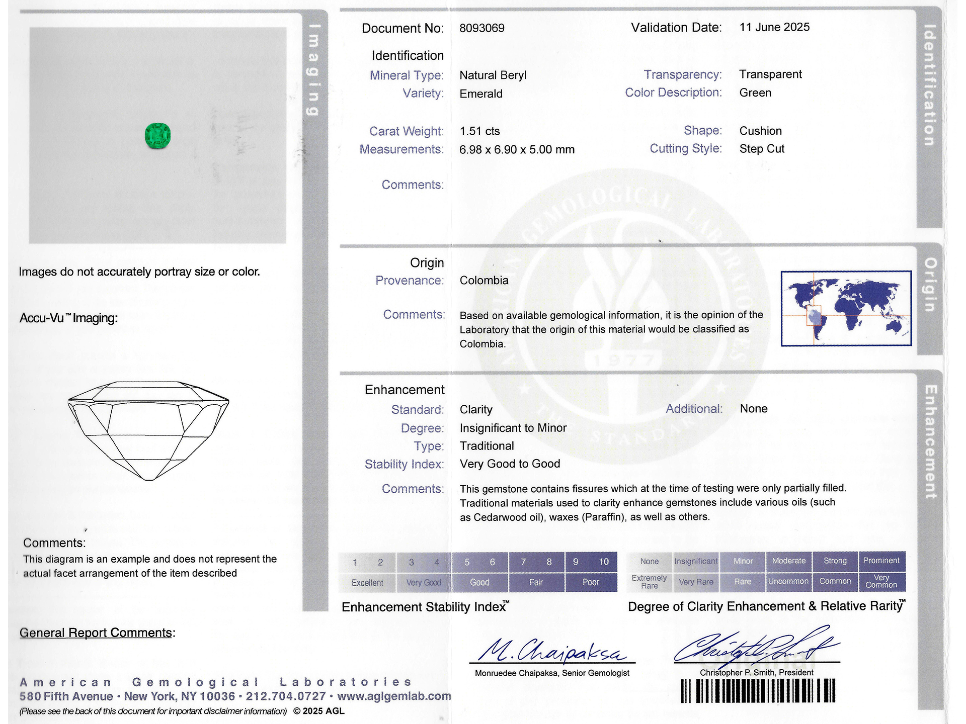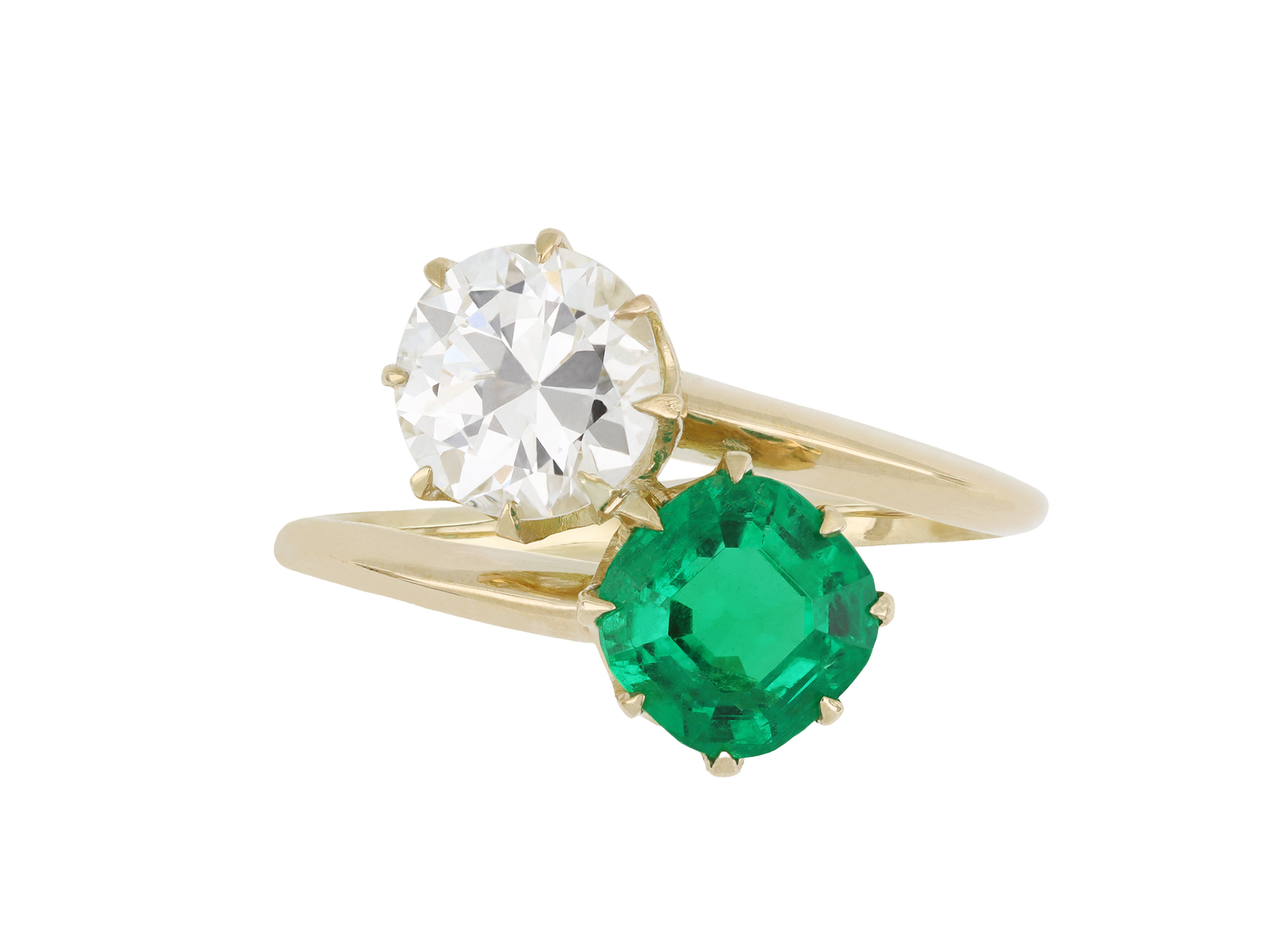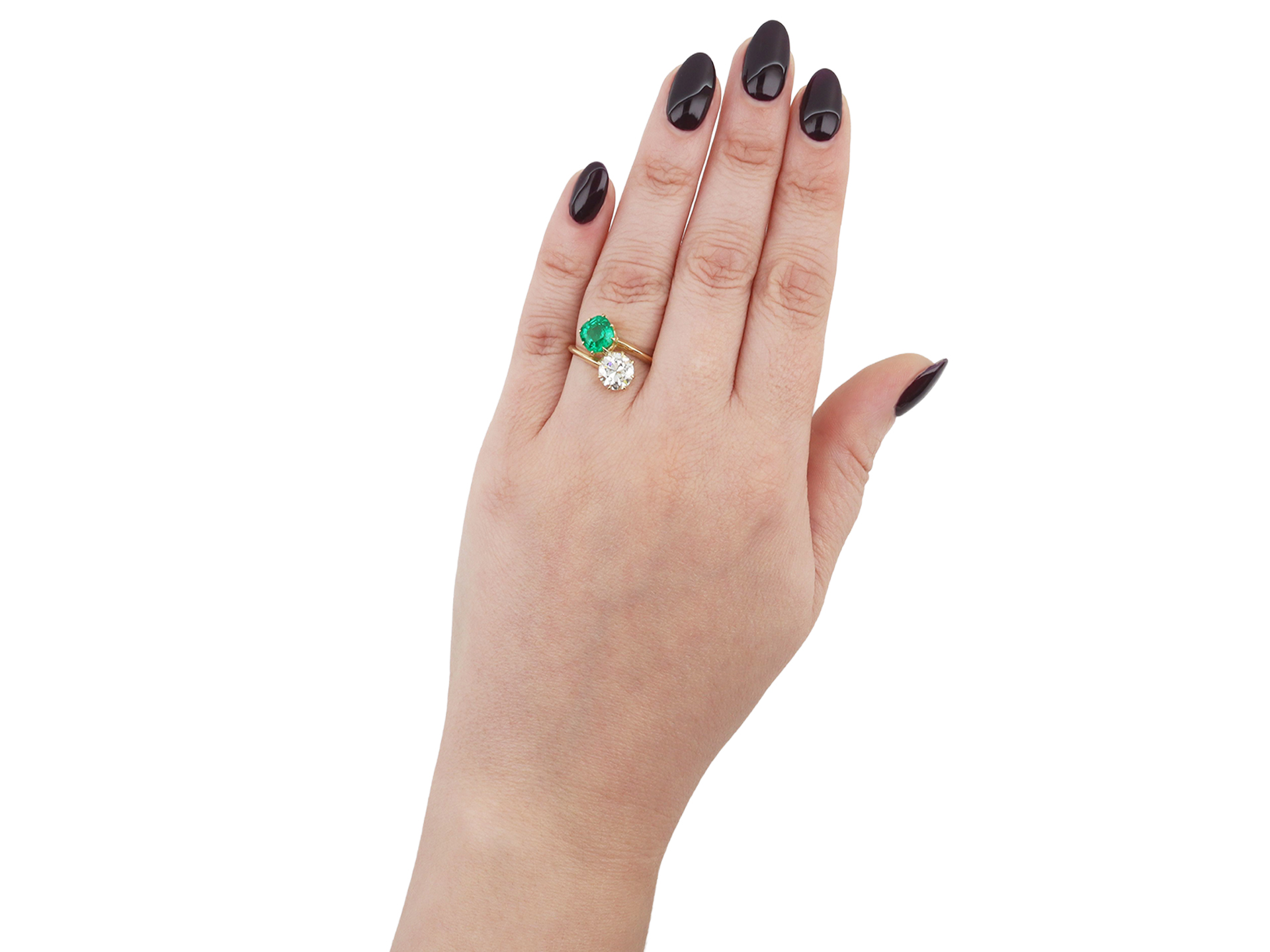 Colombian emerald and diamond ring. Set with a cushion shape step cut natural insignificant to minor Colombian emerald in an open back claw setting with a weight of 1.51 carat, and further set with a round old cut diamond in an open back claw setting with an approximate weight of 1.50 carats, to an elegant crossover design featuring stylised claws, a pierced gallery and open backholing, leading to asymmetric shoulders which flow through to a solid shank. Marked 18 carat yellow gold, circa 1950, accompanied by American Gemological Laboratories (AGL) report #8093069.