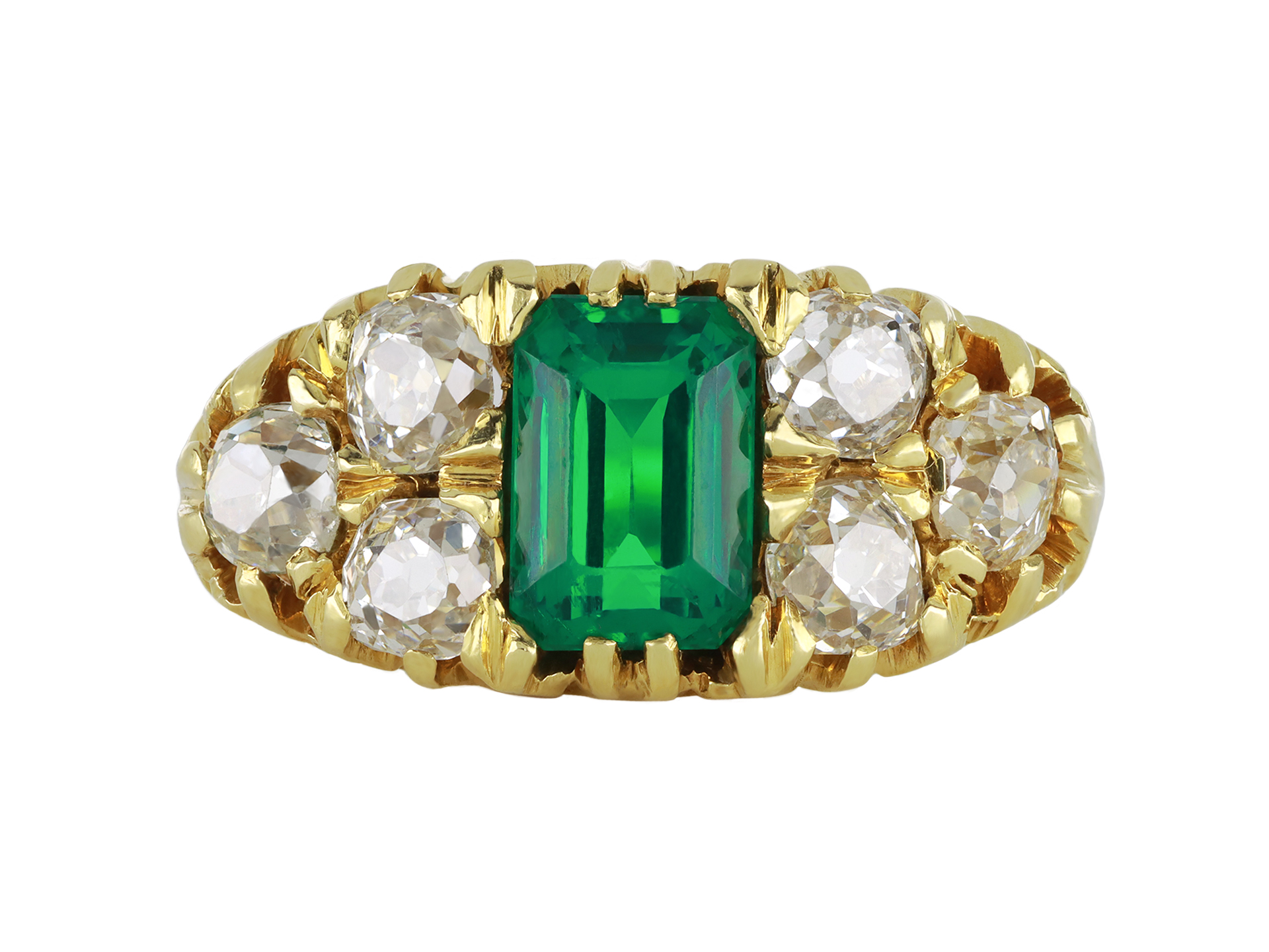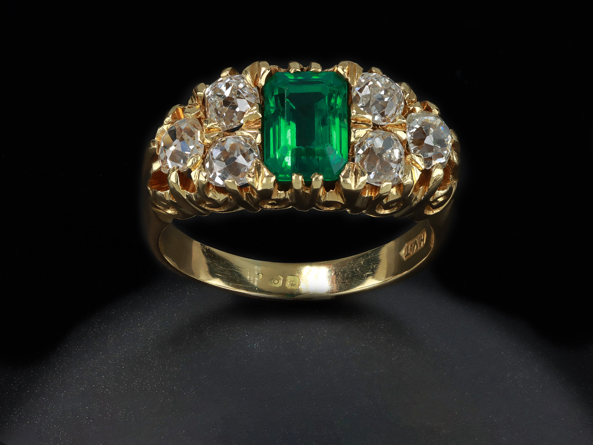 Colombian emerald and diamond carved ring. Centrally set with an octagonal emerald-cut natural Colombian emerald with negligible clarity enhancement in an open back claw setting with an approximate weight of 1.10 carats, further adorned by six cushion shape old mine diamonds in open back claw settings with a combined approximate weight of 1.35 carats, to an impressive horizontal cluster featuring split claws, an intricately carved gallery with scrolling motifs and fancy shape open backholing, leading to broad grooved shoulders and flowing through to a solid D-shaped shank. Tested 18 carat yellow gold, maker's mark 'H.V.T', circa 1890, English, accompanied by Gem and Pearl Laboratory report #23380.