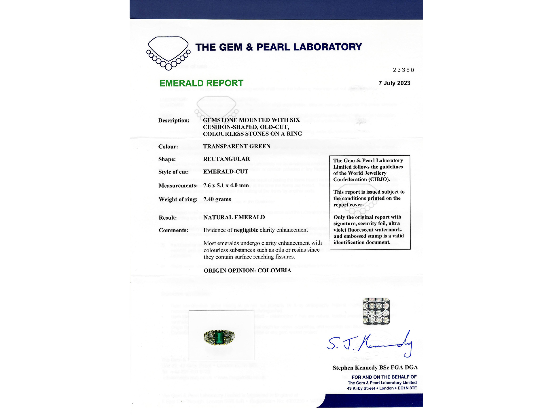 Gemstone Colombian Minor Oil Emerald, Emerald Cut, approximately 1.1ct 6 x Diamonds, Old Mine, approximately 1.35ct total