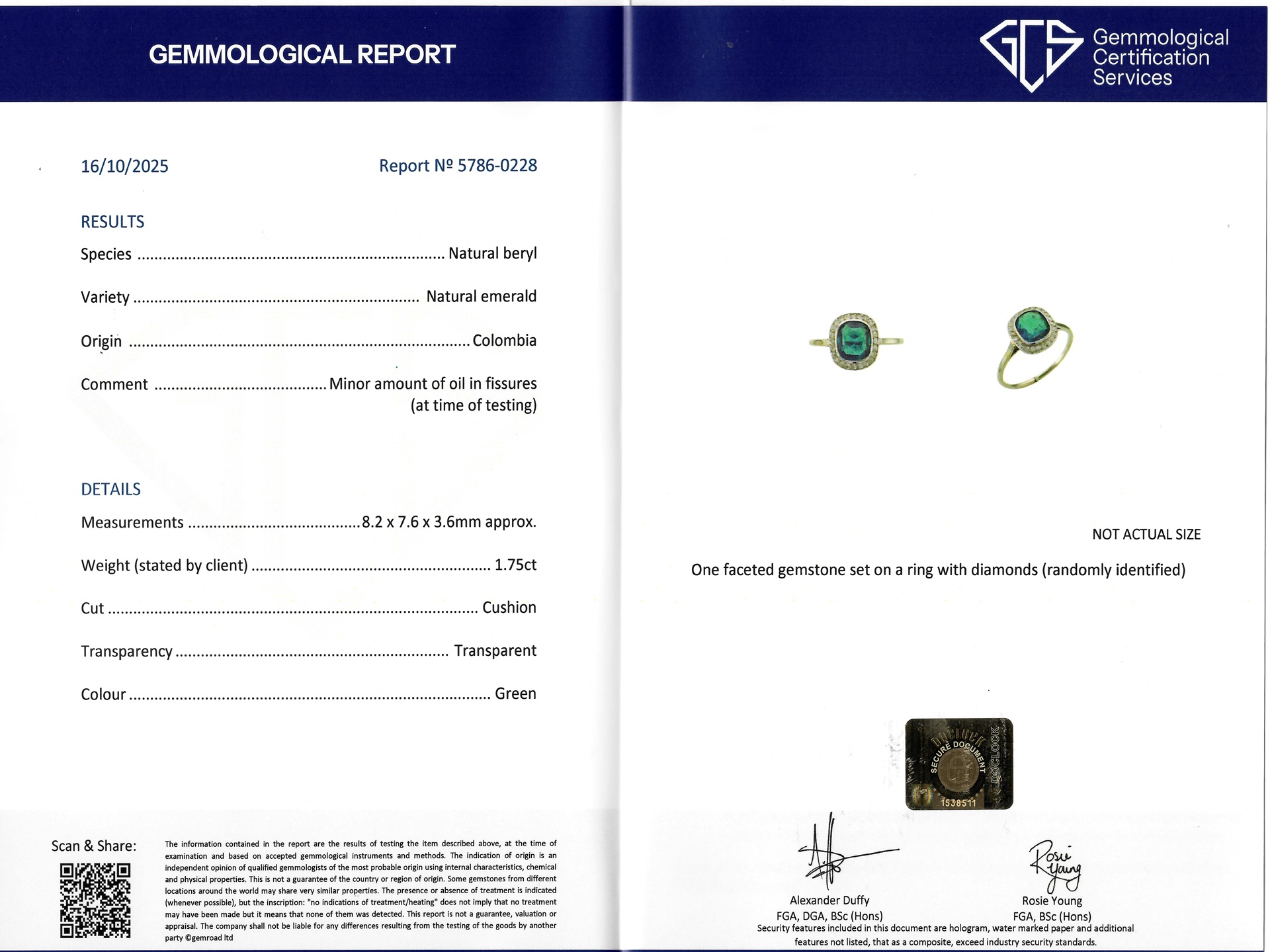 Colombian emerald and diamond coronet cluster ring. Set to centre with a cushion shape old cut natural Colombian emerald with minor oil in an open back rubover setting with an approximate weight of 1.75 carats, surrounded by a single row of twenty-four round eight cut diamonds in open back grain settings with an approximate combined weight of 0.24 carats, to an exceptional coronet cluster design featuring polished edges, a decoratively pierced gallery with hear motifs and open backholing, leading to raised shoulders, which flow through to a solid D-shape shank. Marked 18 carat white gold and platinum, indistinct maker's mark, French, circa 1915, accompanied by Gemmological Certification Services report #5786-0228.