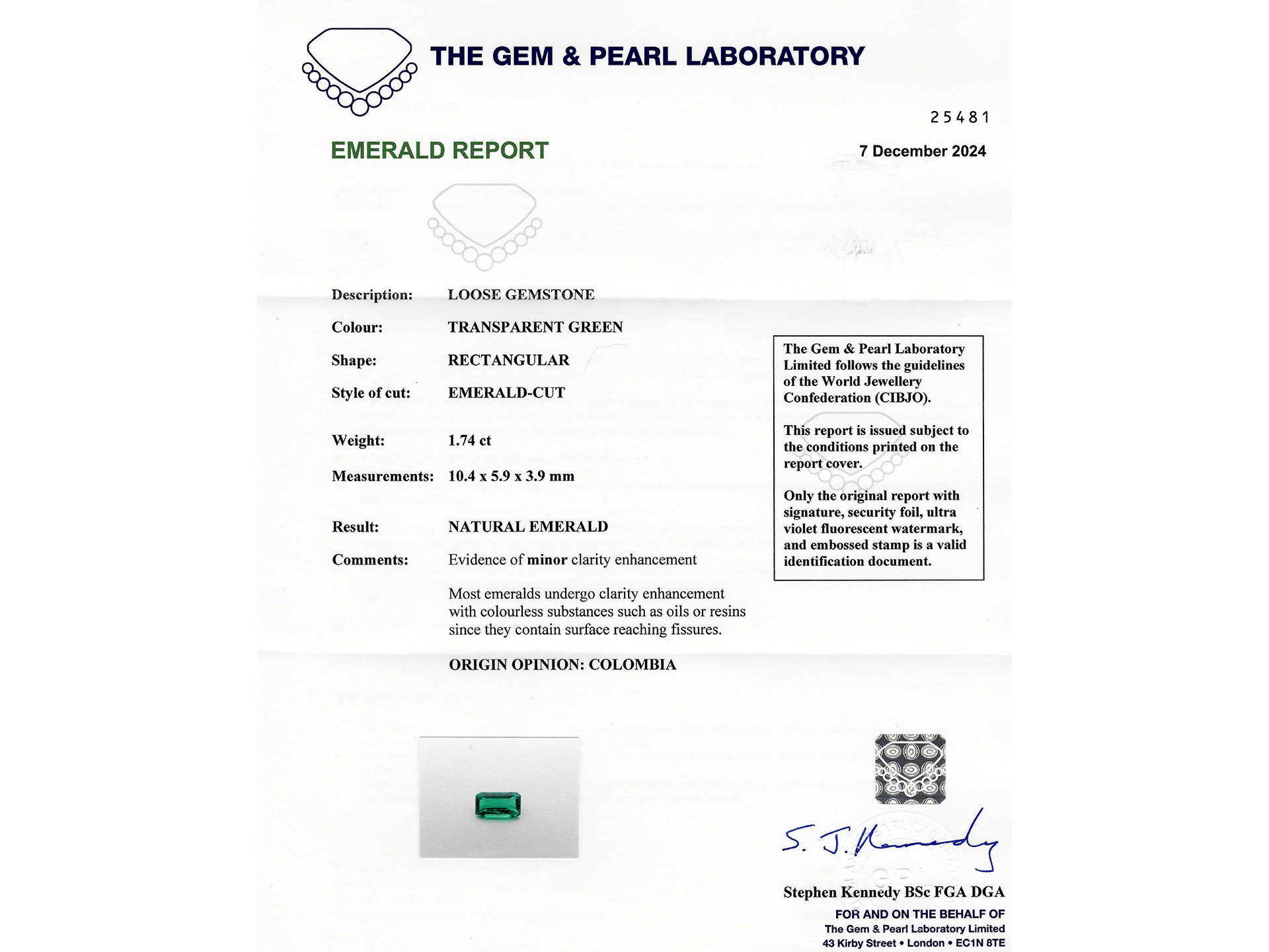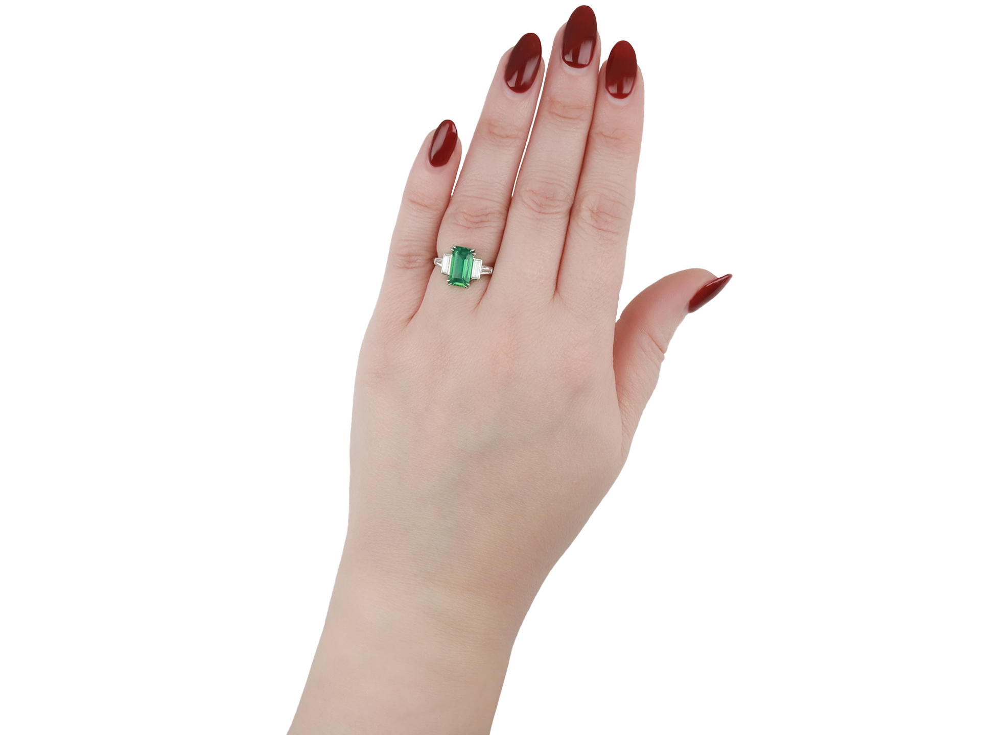 Gemstone Colombian Minor Oil Emerald, Emerald Cut, 1.74ct 2 x Diamonds, Baguette Cut, approximately 0.35ct total 2 x Diamonds, Baguette Cut, approximately 0.3ct total