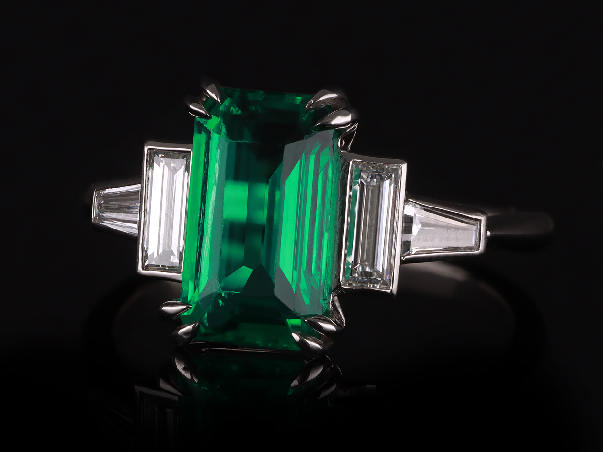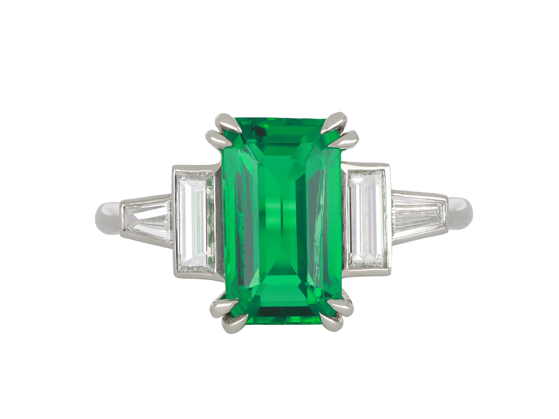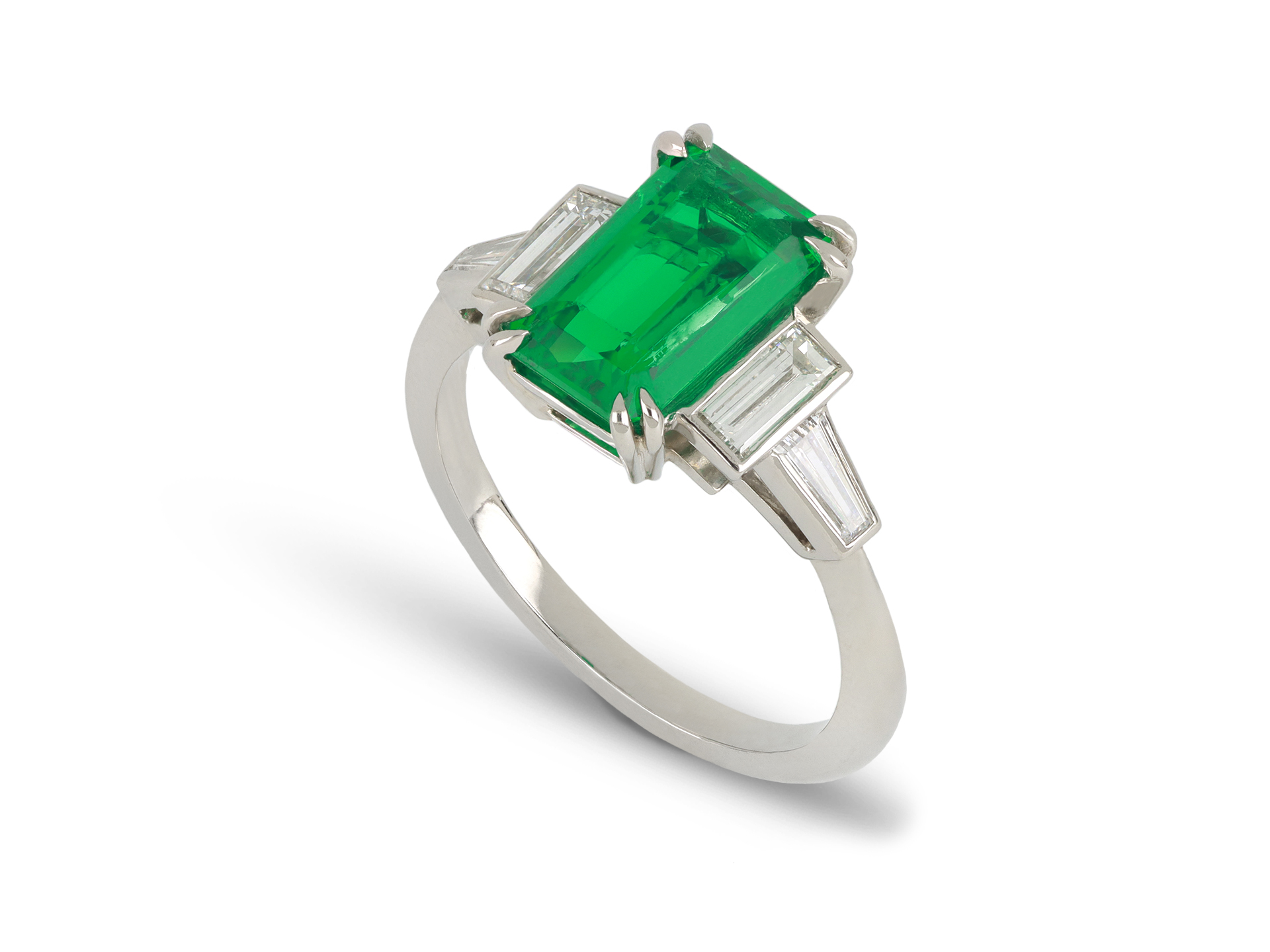 Colombian emerald and diamond flanked solitaire ring. Set to centre with an octagonal emerald-cut natural emerald with minor oil in an open back split claw setting with a weight of 1.74 carats, flanked by two rectangular baguette cut diamonds in open back rubover settings with a combined approximate weight of 0.35 carats and further set with two tapered baguette cut diamonds in open back rubover settings with a combined weight of 0.30 carats. The total approximate diamond weight is 0.65 carats, to a geometric flanked design featuring polished edges, a structural gallery and open backholing, leading to raised shoulders which flow through to a solid D-shape shank. Tested platinum, circa 1950, accompanied by The Gem and Pearl Lab report #25481