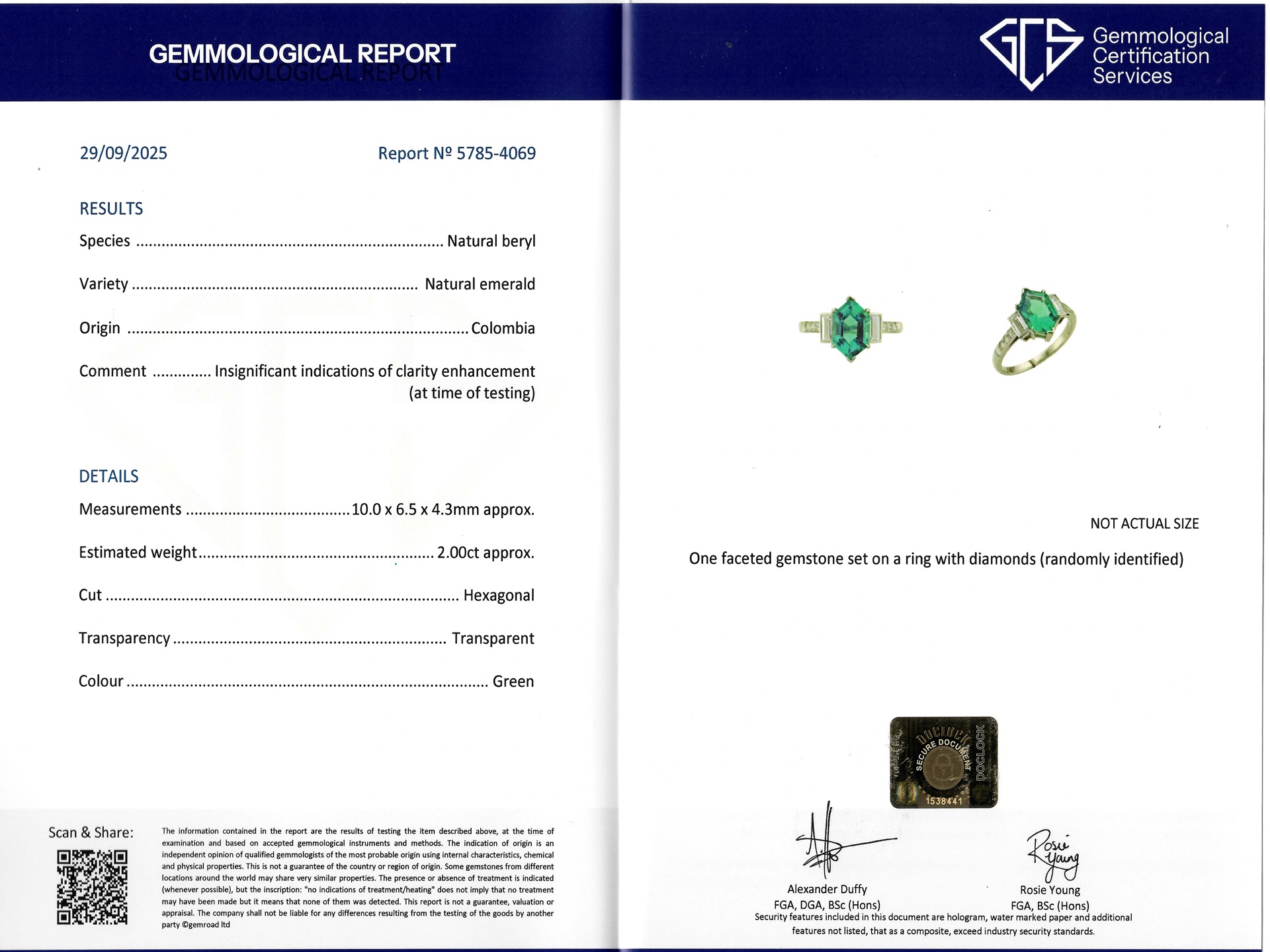 Colombian emerald and diamond flanked solitaire ring. Set to centre with a hexagonal step-cut natural Colombian emerald with insignificant oil in an open back claw setting with an approximate weight of 2.00 carats, further set with two rectangular baguette cut diamonds in open back rubover settings with a combined weight of 0.24 carats, further enhanced by six round eight cut diamonds in open back grain settings with a combined weight of 0.06 carats. The total approximate diamond weight is 0.30 carats, to a geometric flanked solitaire design featuring stylised claws, a finely pierced gallery and fancy shape open backholing, flanked by raised shoulders which flow through to a solid D-shape shank. Tested platinum, English, circa 1950, accompanied by Gemmological Certification Services report #5785-4069.