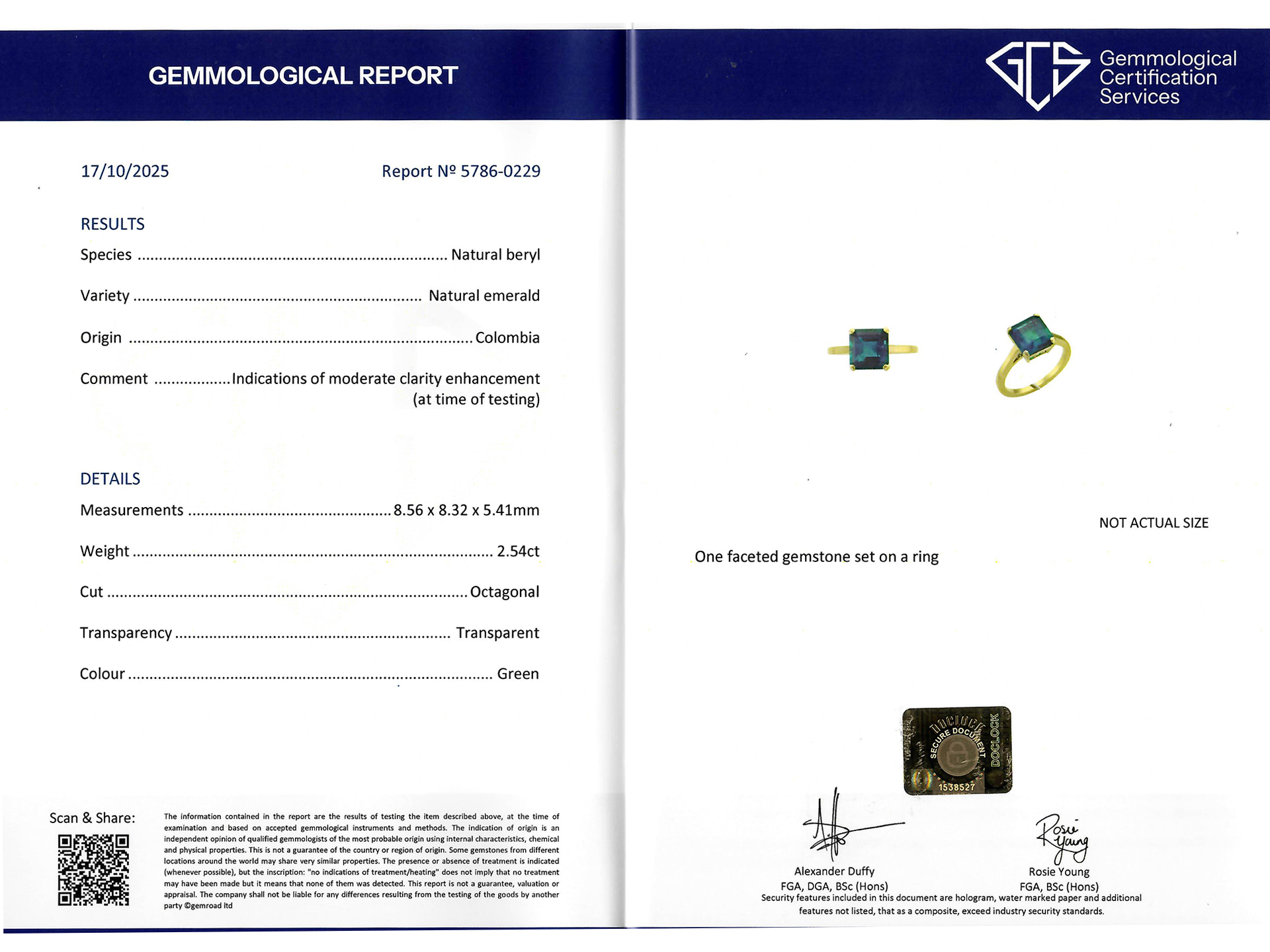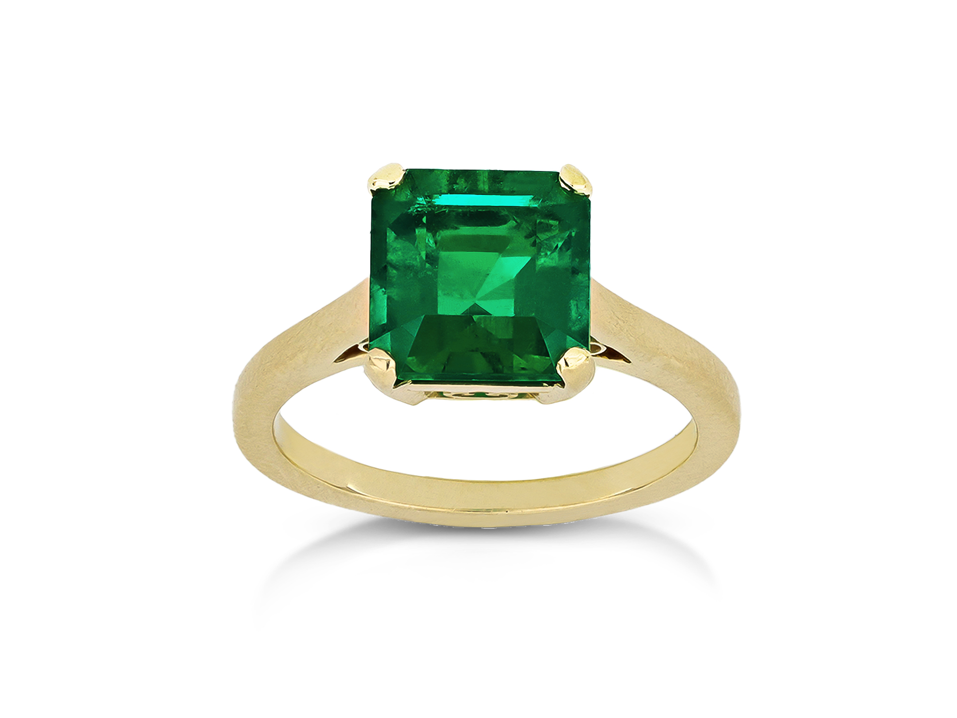 Colombian emerald solitaire ring. Centrally set with an octagonal emerald-cut natural Colombian emerald with moderate clarity enhancement in an open back claw setting with a weight of 2.54 carats, to an elegant solitaire design featuring curving corner claws, a pierced gallery and open backholing, flanked by raised shoulders with cheniers which flow down to a solid flat shank. Tested yellow gold, circa 1980, accompanied by Gemmological Certification Services report #5786-0229.