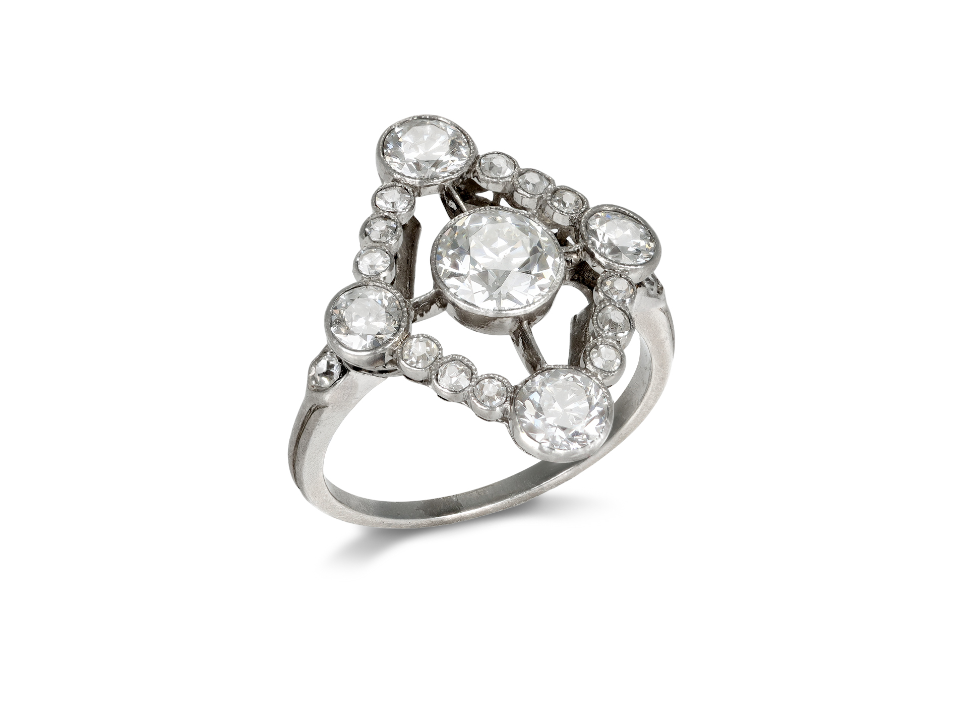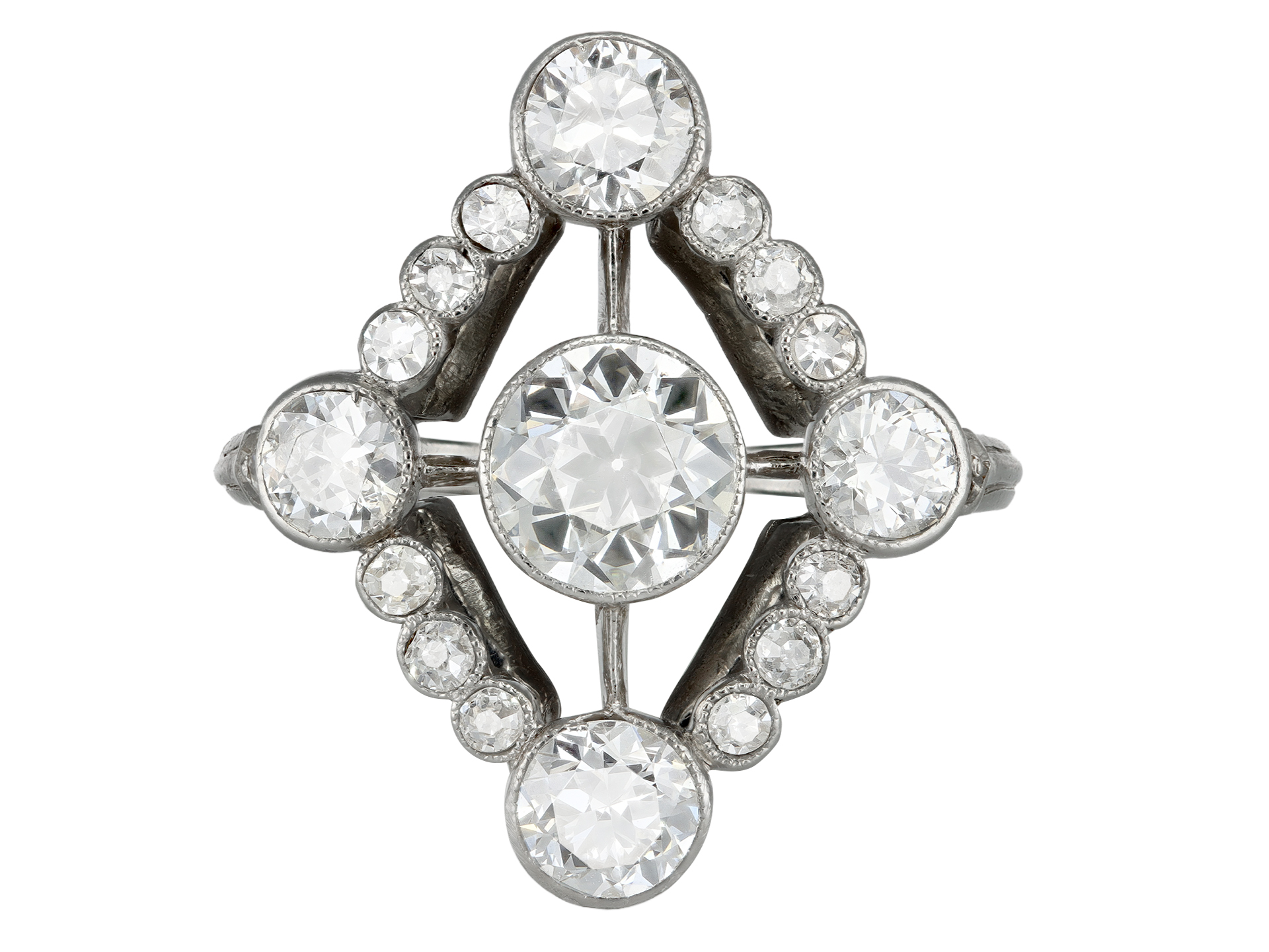 Diamond cluster ring. Set to centre with one round old cut diamond in an open back rubover setting with an approximate weight of 0.95 carats, further set at the cardinal points with four round old cut diamonds in open back rubover settings with a combined weight of 1.00 carats, flanked by fourteen round eight cut diamonds in open back rubover and grain settings with a combined weight of 0.30 carats. The total approximate diamond weight is 2.25 carats, to an openwork cluster design featuring millegrain edging, a decoratively pierced scalloped gallery and open backholing, leading to ridged shoulders and flowing through to a solid shank. Marked platinum, French, circa 1920.