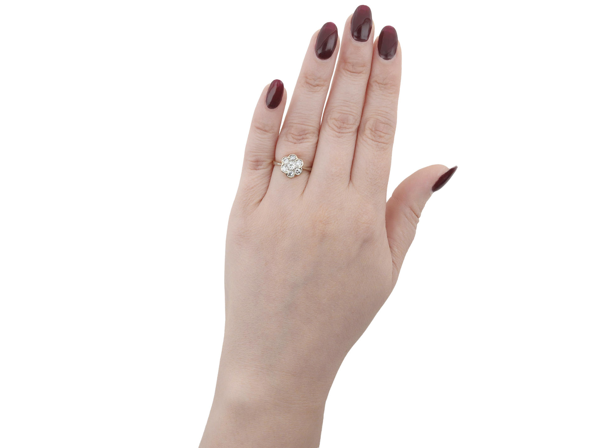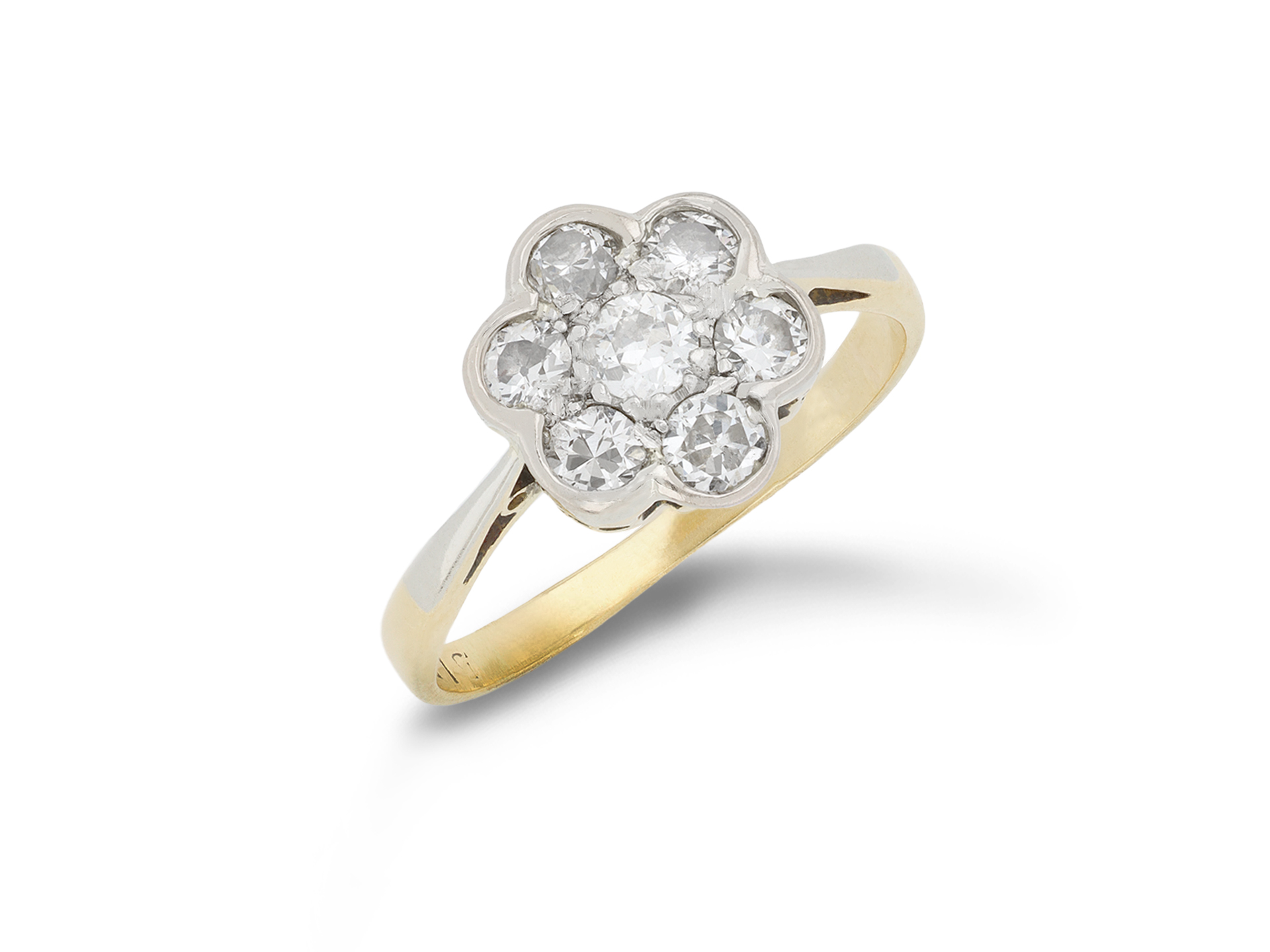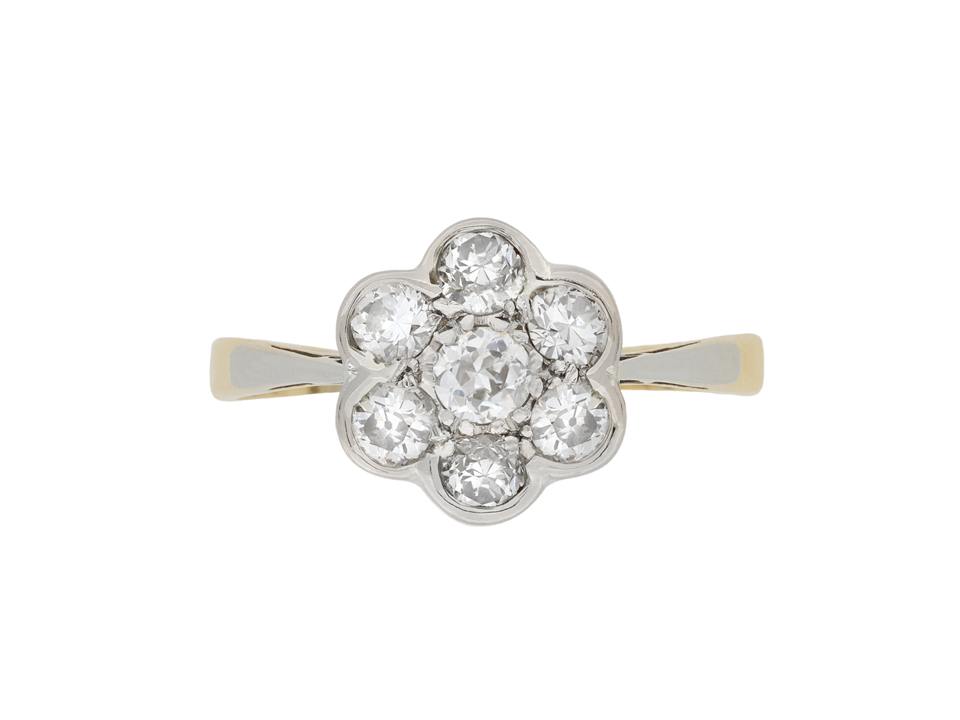 Diamond coronet cluster ring. Set to the centre with a round old cut diamond in an open back grain setting with an approximate weight of 0.15 carats, surrounded by six round old cut diamonds in open back rubover and grain settings with a combined weight of 0.90 carats. The total approximate diamond weight is 1.05 carats, to an elegant flora form design featuring polished scalloped edging, an intricate open gallery with chenier details and open backholing, the raised inwardly tapering shoulders are supported by decorative cheniers which flow through to a solid D-shape shank. Tested gold, circa 1940.