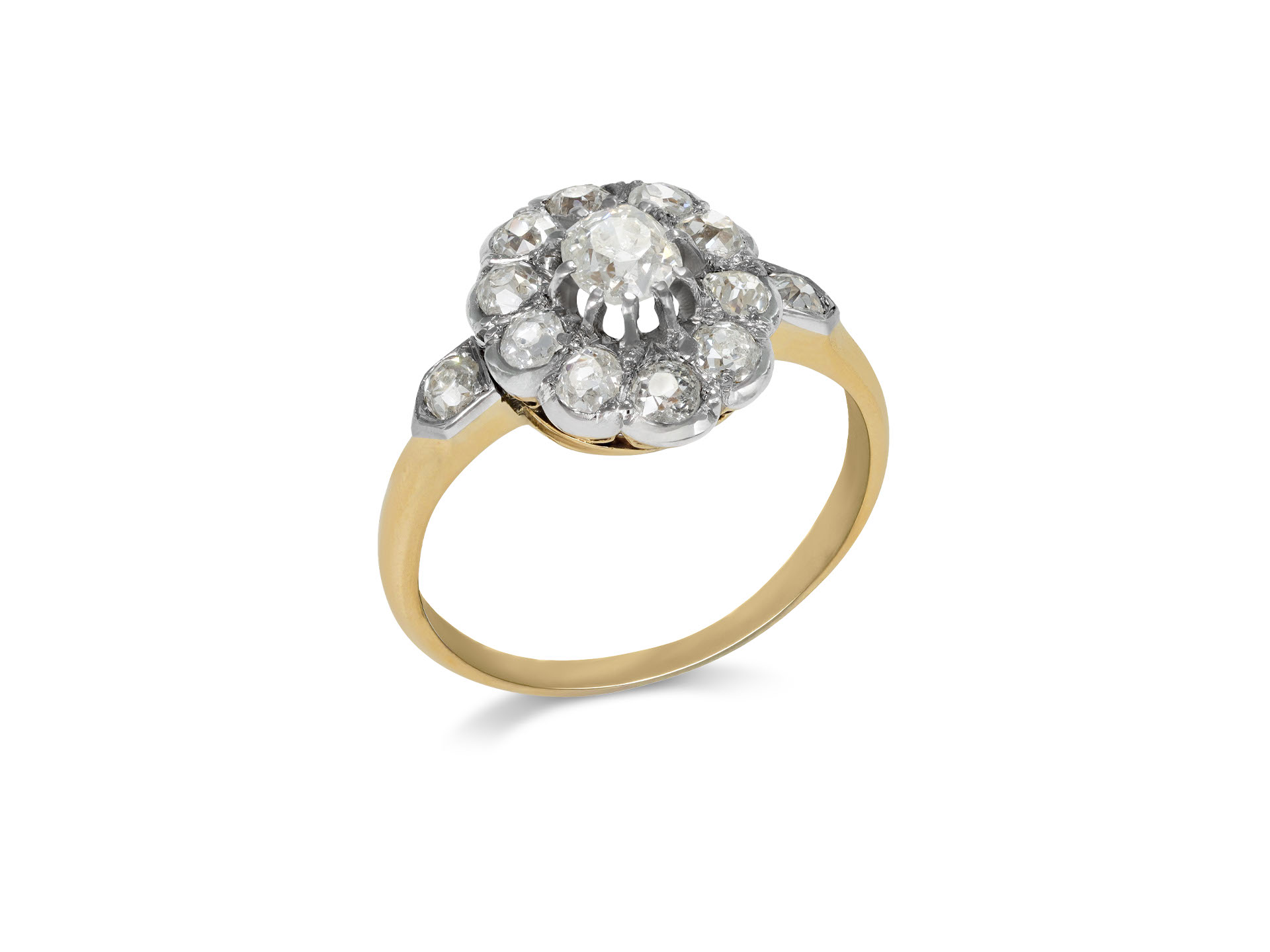 Diamond coronet cluster ring. Set to centre with a cushion shape old mine diamond in an open back claw setting with an approximate weight of 0.50 carats, further set with twelve cushion shape old mine diamonds in open back part-rubover and grain settings with a combined weight of 1.20 carats. The total approximate diamond weight is 1.70 carats, to an elegant elongated coronet cluster design featuring scalloped edges, an intricately pierced gallery and fancy shape open backholing, the shoulders with chamfered edges flow through to a solid shank. Marked 18 carat gold and platinum, French import marks, numbered '3595', circa 1910.