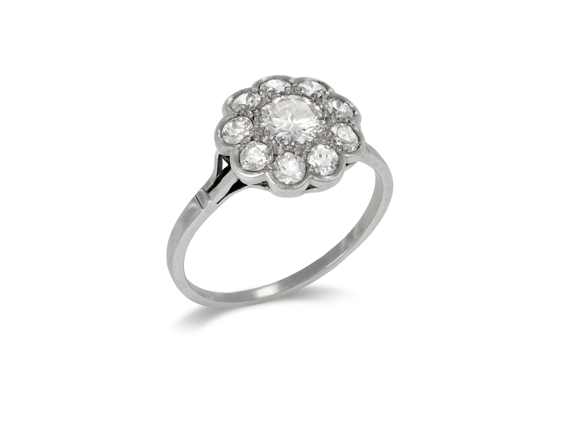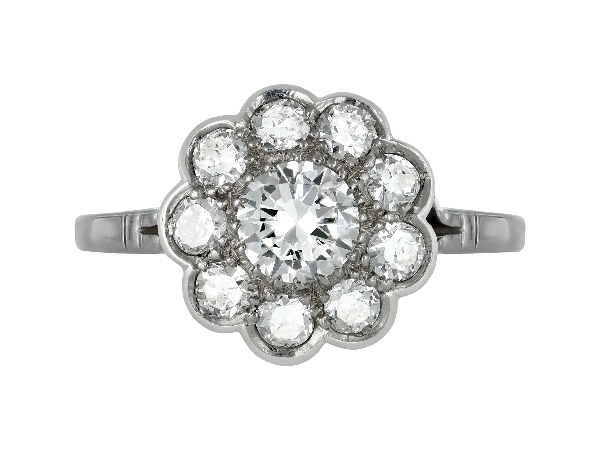 Diamond coronet cluster ring. Set to the centre with a round transitional cut diamond in an open back grain setting with an approximate weight of 0.60 carats, surrounded by nine round transitional cut diamonds in open back rubover and grain settings with a combined weight of 0.65 carats. The total approximate diamond weight is 1.25 carats, to an elegant flora form cluster with polished borders, scalloped edging, an intricate open gallery and open backholing, the split shoulders with ridge detailing flow through to a solid D-shape shank. Tested white gold and platinum, indistinct maker's mark, French, circa 1950.