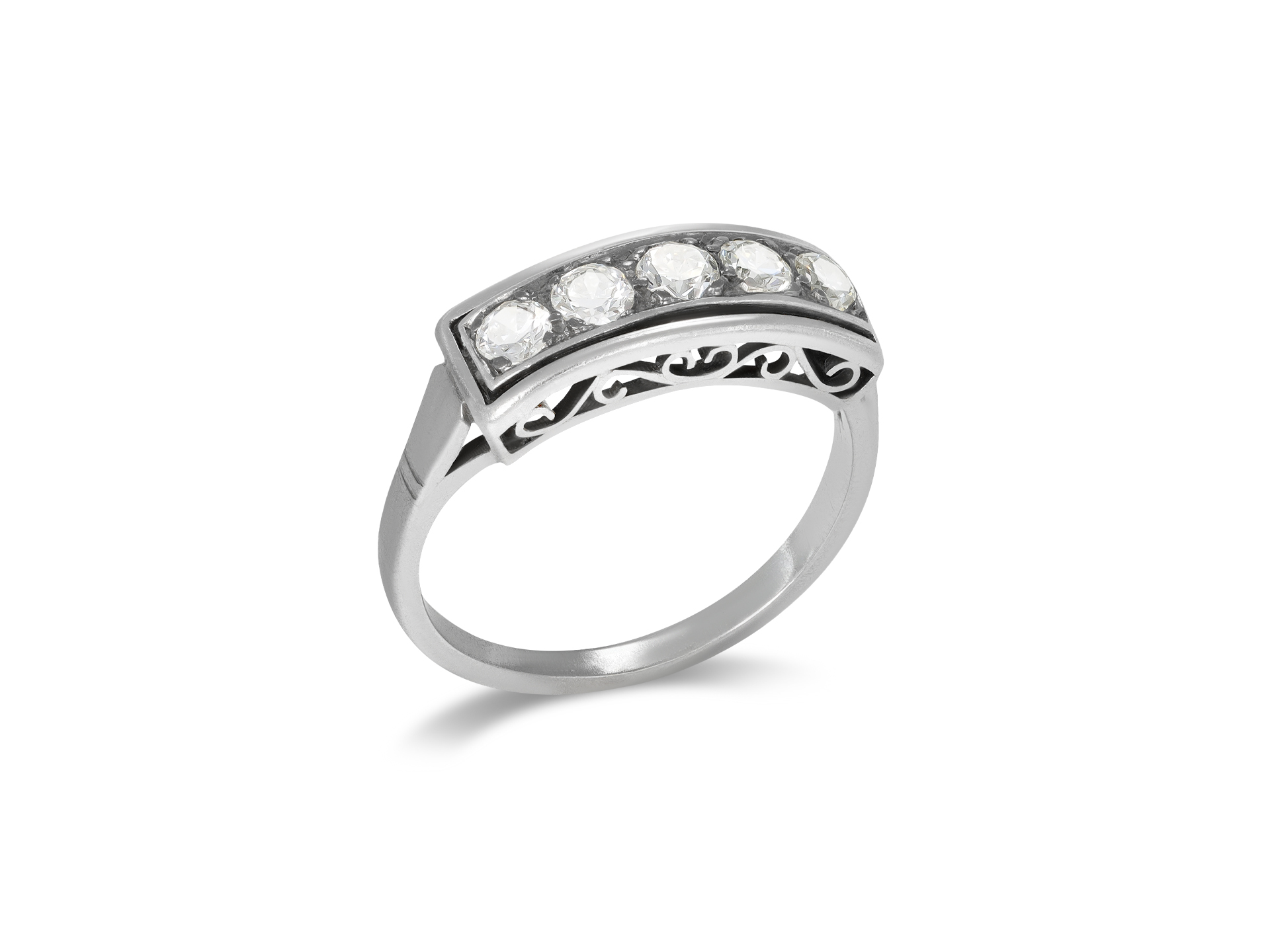 Diamond five stone ring. Set with five round old cut diamonds in open back grain settings with a combined approximate weight of 0.55 carats, to a geometric five stone design featuring linear openwork borders with polished edging, a decorative scrolling gallery and open backholing, leading to raised shoulders with ridged detail which flow through to a solid shank. Marked platinum, french import mark, circa 1915.