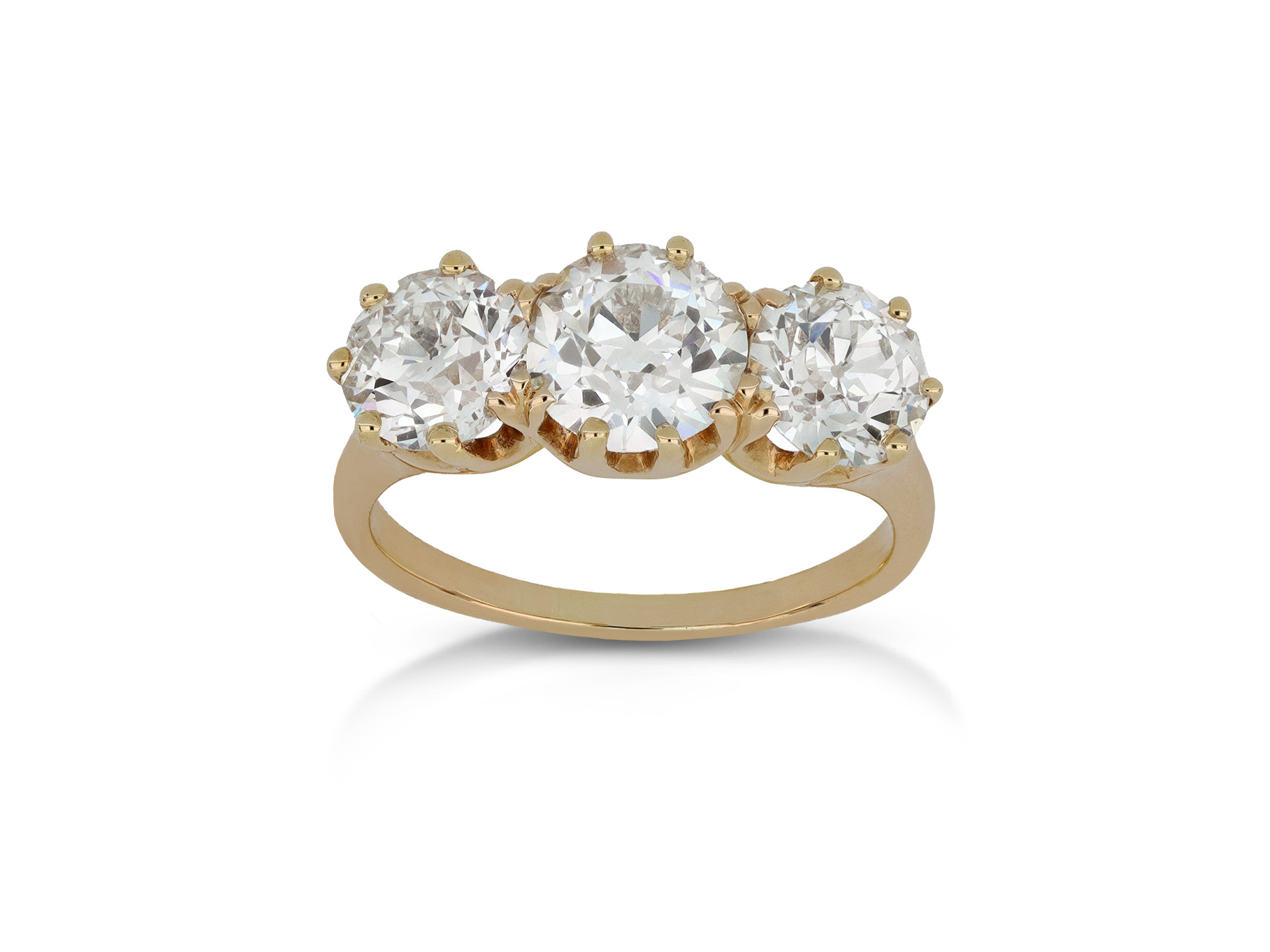 Diamond three stone ring. Set to centre with a round old mine diamond in an open back claw setting with an approximate weight of 1.20 carats, flanked by two round old mine diamonds in open back claw settings with a combined weight of 1.70 carats. The total approximate diamond weight is 2.90 carats to an impressive three stone design featuring curving claws, a pierced gallery and circular open backholing, leading to integrated shoulders which taper through to a solid D-shape shank. Marked 18 carat gold, French import mark, circa 1905.