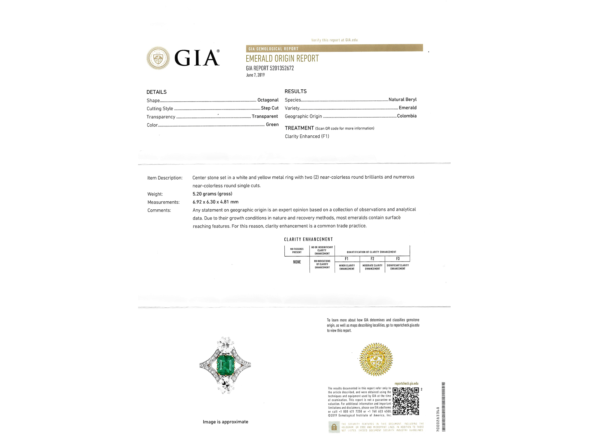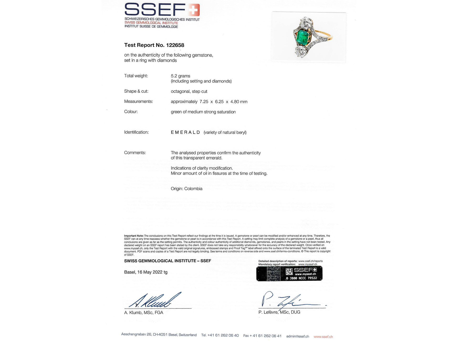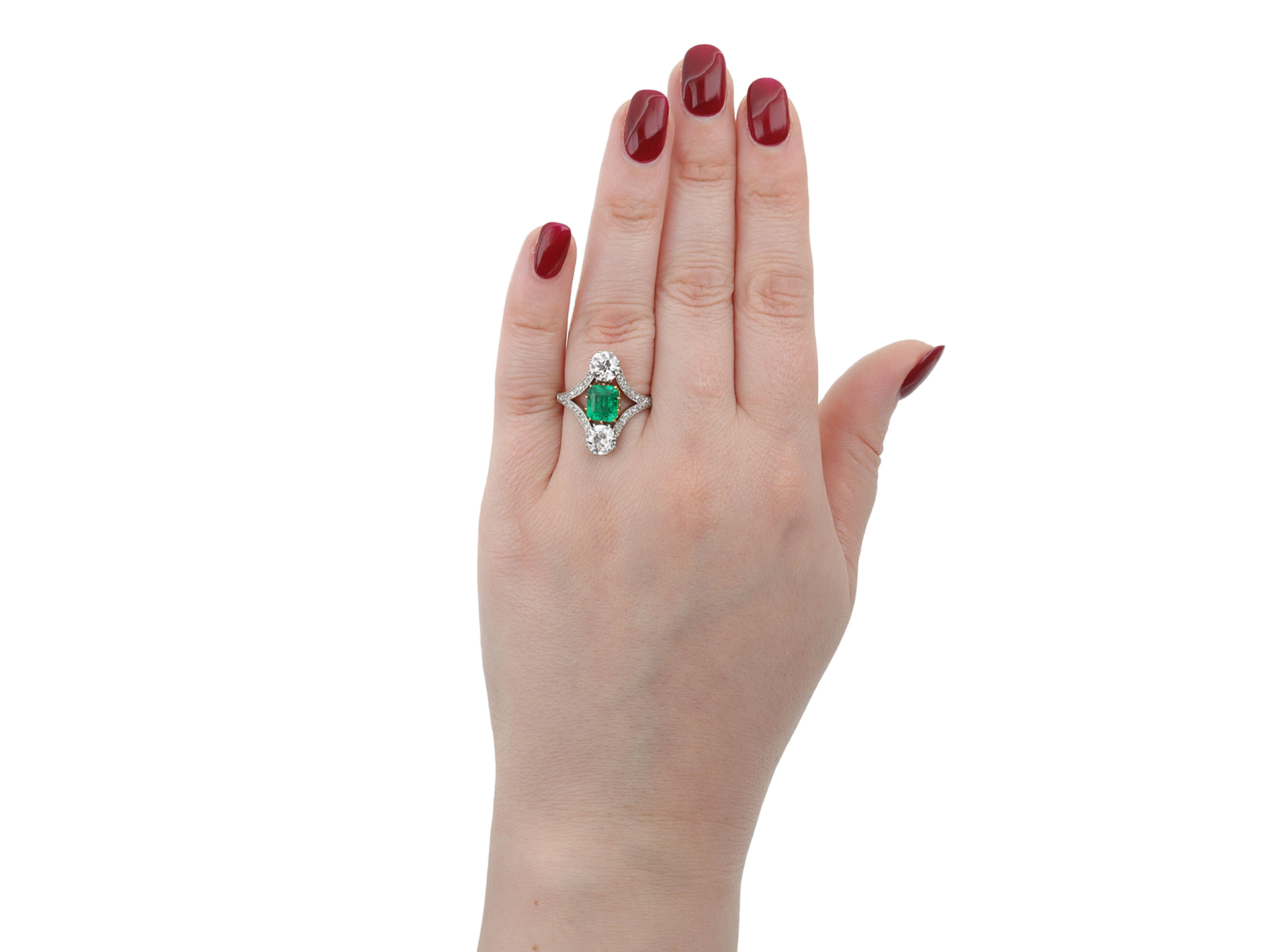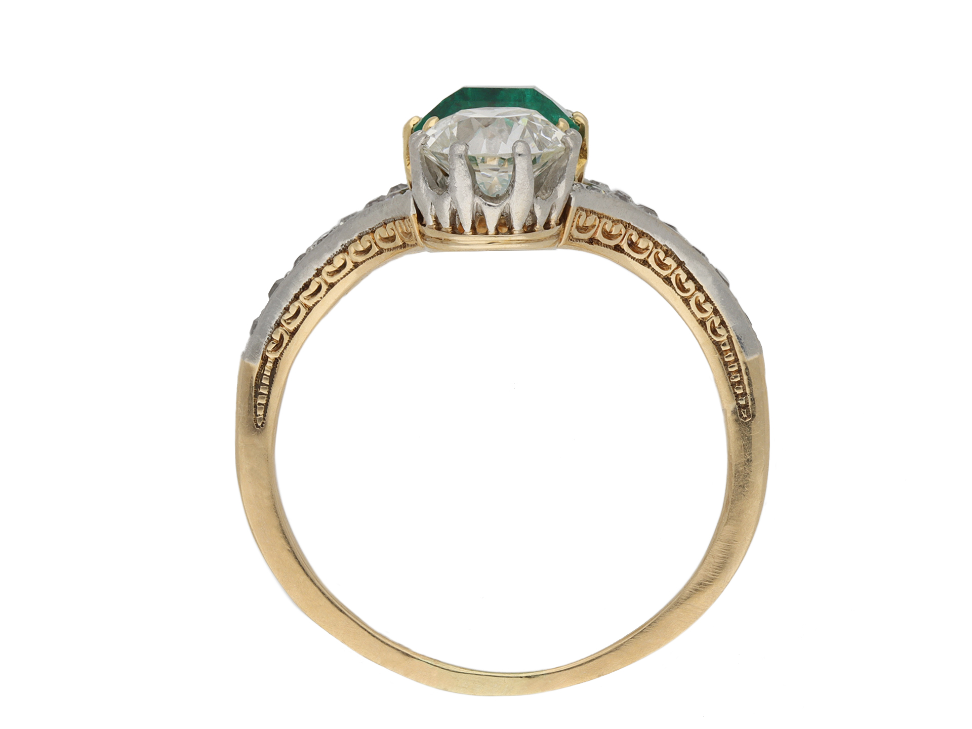 Edwardian Colombian emerald and diamond cluster ring. Set to centre with an octagonal emerald-cut natural Colombian emerald with minor oil, in an open back claw setting with an approximate weight of 1.45 carats, flanked to top and bottom by two round old cut diamonds in open back claw settings with an approximate combined weight of 1.65 carats, further decorated with twenty eight round old cut diamonds in open back grain settings with a combined weight of 0.35 carats. The total approximate diamond weight is 2.00 carats, all to an ornate vertical three stone design featuring decorative openwork with polished edges, an engraved gallery with scrolling motifs and fancy shaped open backholing, leading to tapering shoulders and flowing through to a solid ridged shank. Tested yellow gold and platinum, circa 1910, accompanied by Gemological Institute of America (GIA) report #2501352672 and Swiss Gemmological Institute (SSEF) report #122658.
