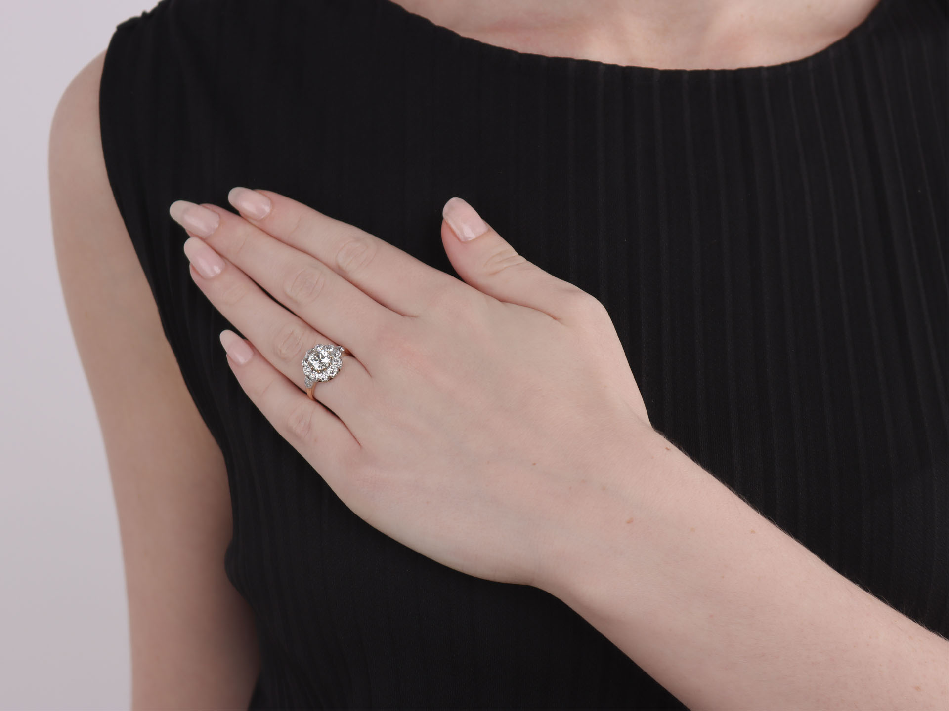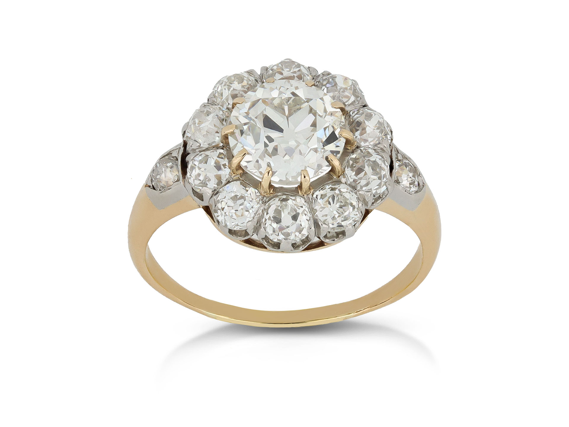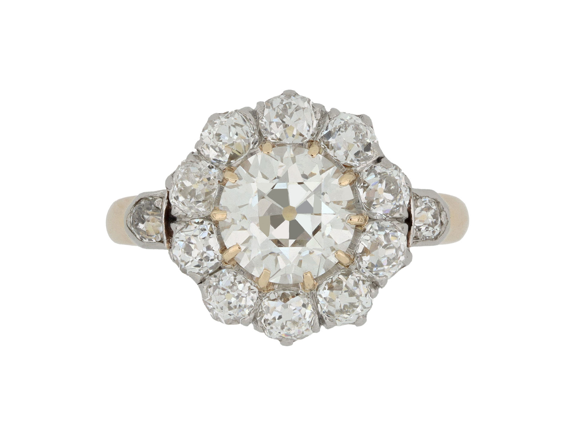 Edwardian diamond coronet cluster ring. Set to centre with a round old cut diamond, J colour, SI2 clarity, with a weight of 1.50 carats, surrounded by ten cushion shape old mine diamonds in open back claw settings with a combined approximate weight of 1.30 carart and decorated to the shoulders with two cushion shape old mine diamonds in open back grain settings with a combined weight of 0.15 carats. The total approximate diamond weight is 2.95 carats, to an elegant coronet cluster design featuring curving claws, a pierced gallery and fancy shape open backholing, leading to angular shoulders which flow through to a solid D-shape shank. Tested yellow gold and platinum, circa 1910, accompanied by Gemological Institute of America report #5222352942.