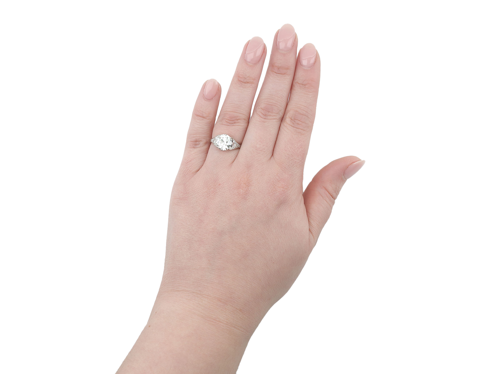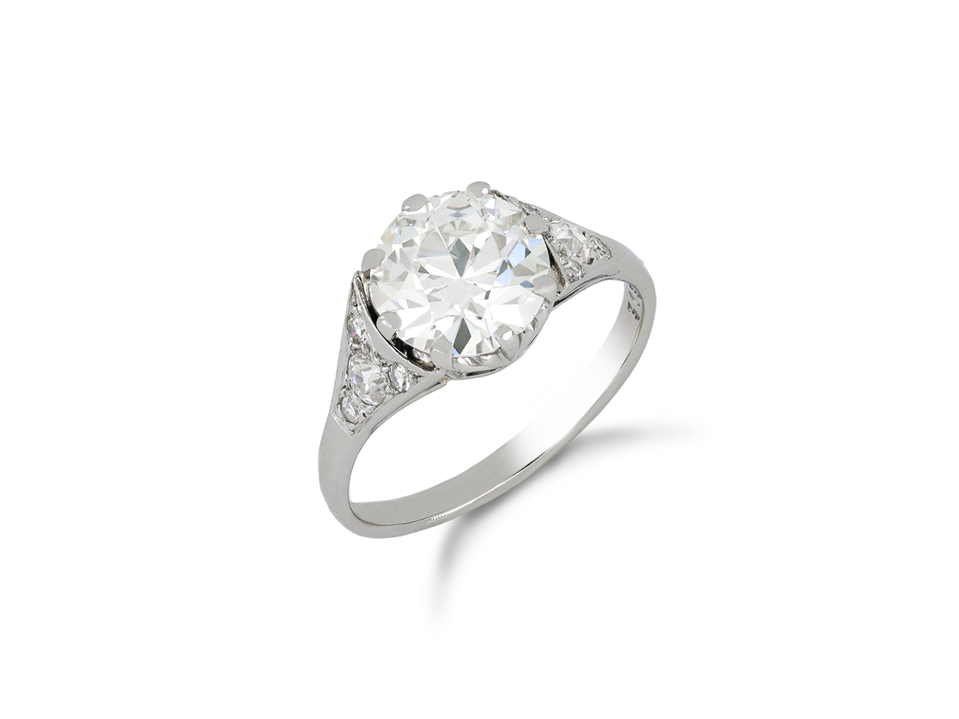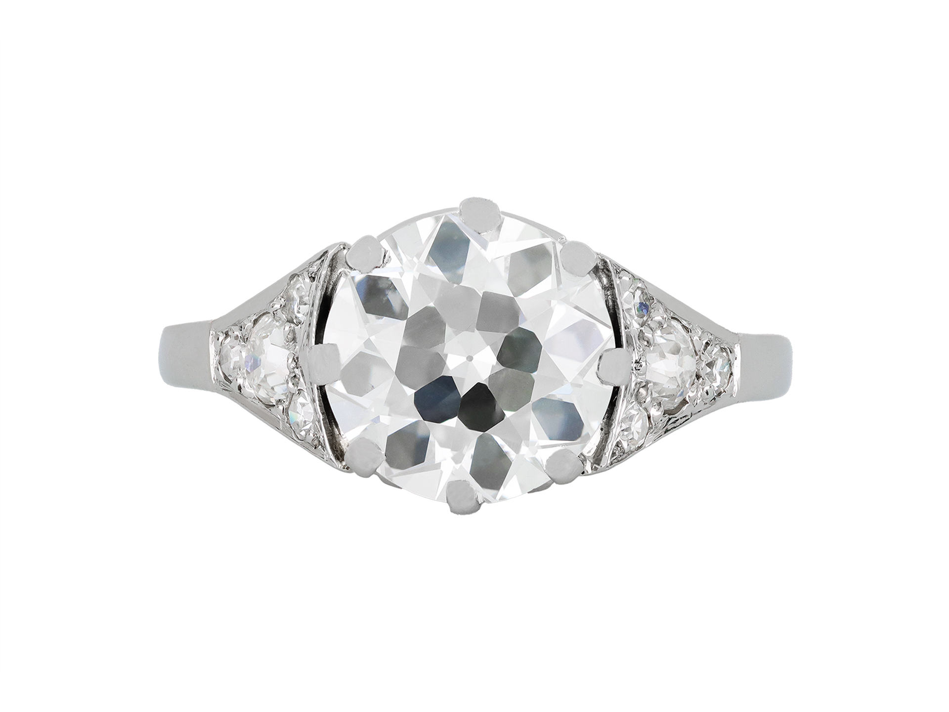 Edwardian diamond flanked solitaire ring. Set to centre with a round old cut diamond, I colour, SI1 clarity, with a weight of 2.48 carats in an open back claw setting, flanked by six round eight cut diamonds in open back grain settings with a combined weight of 0.12 carats. The total approximate diamond weight is 2.60 carats, to an elegant flanked solitaire design featuring curving claws, a finely pierced openwork gallery with foliate motifs and fancy open backholing, the trumpeting shoulders flowing though to a solid flat shank. Marked platinum, numbered '363' , circa 1910, accompanied by a Gemological Institute of America (GIA) report #2233501390.