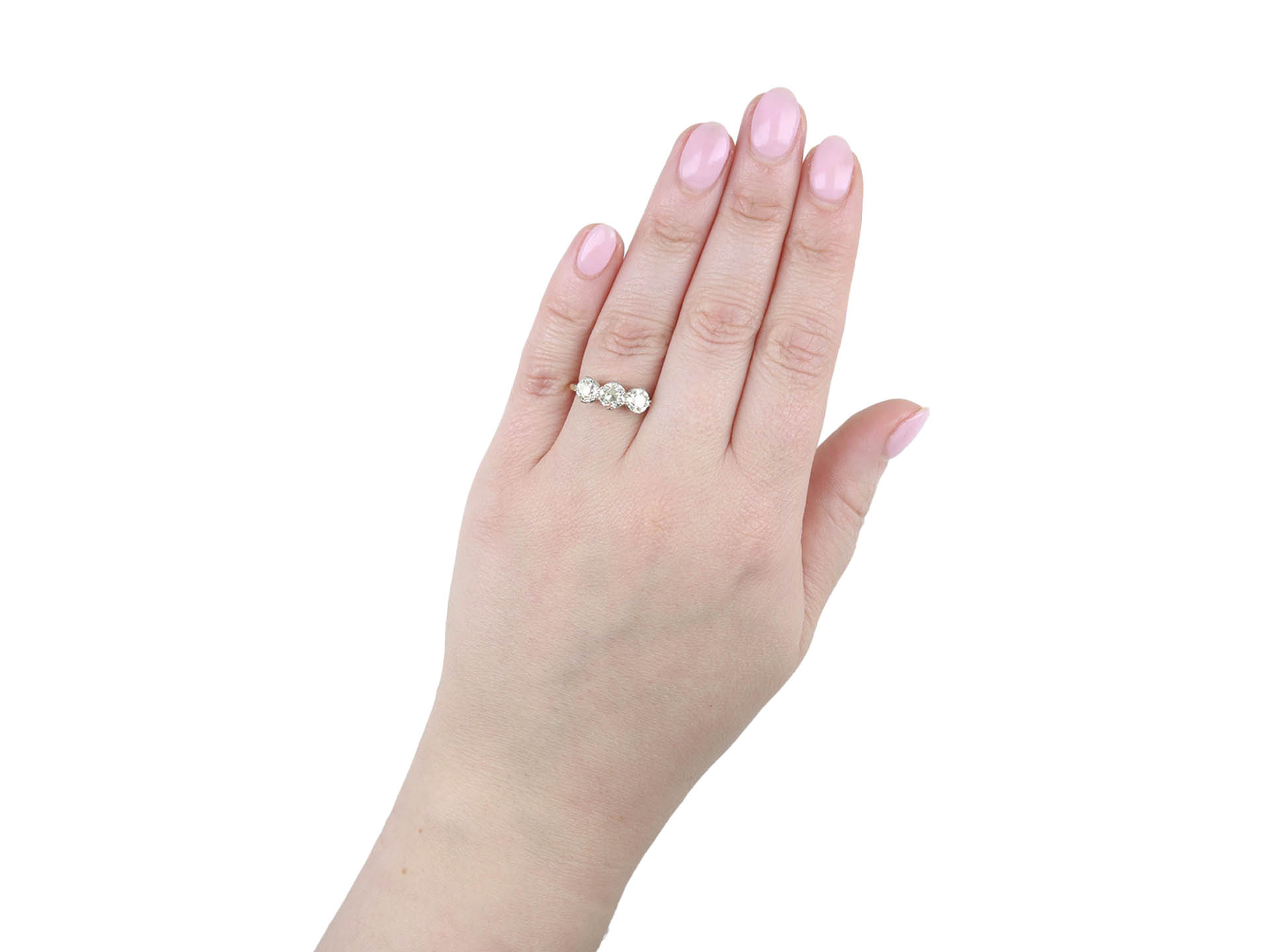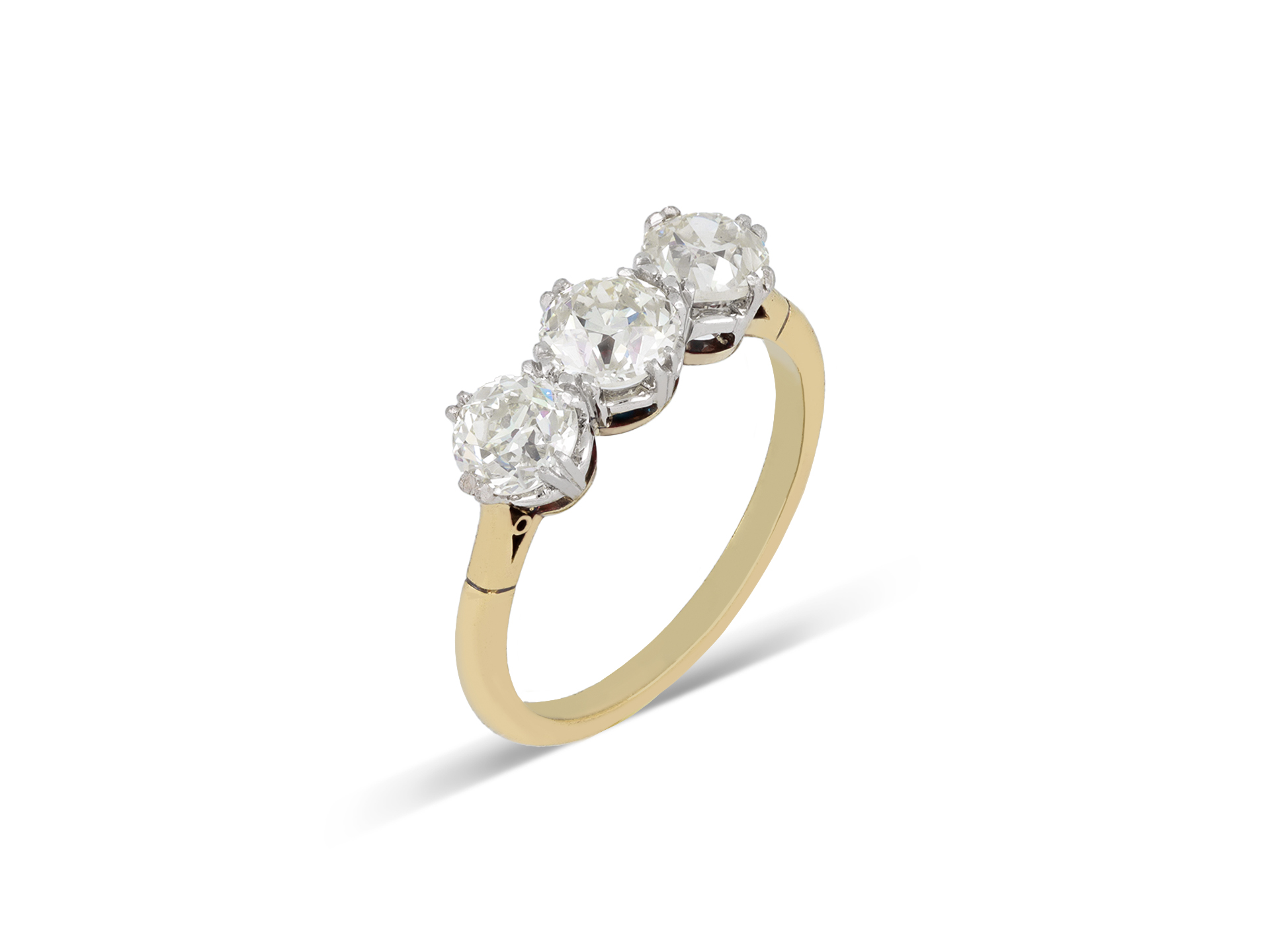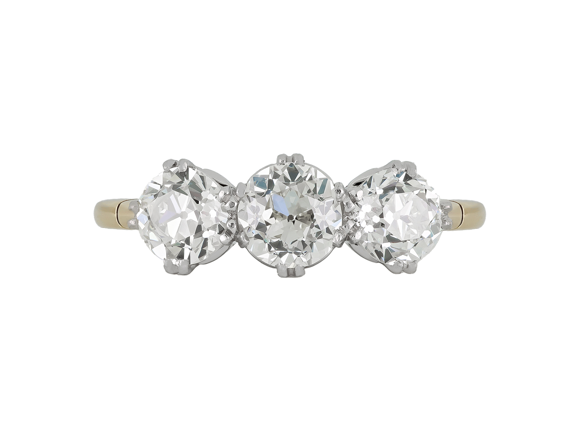Edwardian diamond three stone ring. Set to centre with one round old cut diamond in an open back claw setting with an approximate weight of 0.70 carats, flanked by two round old cut diamonds in open back claw settings with a combined weight of 1.00 carats. The total approximate diamond weight is 1.70 carats to an elegant three stone design featuring curving split claws, an intricately pierced gallery and open circular backholing, leading to inwardly tapering raised shoulders with cheniers and flowing through to a solid D-shape shank. Tested yellow gold and platinum, circa 1910.