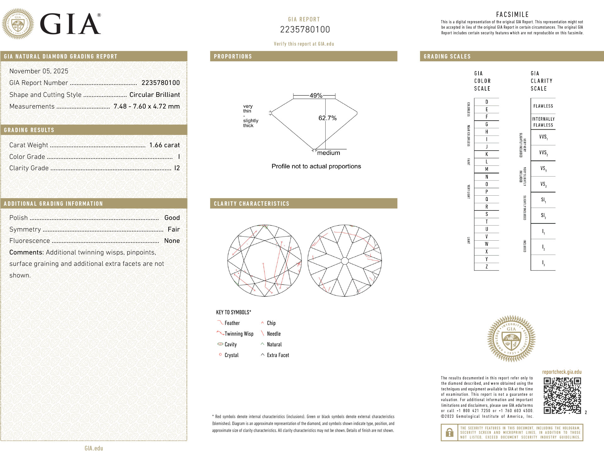 Edwardian diamond three stone ring. Set to centre with a round old cut diamond, I colour, I2 clarity with a weight of 1.66 carats, in an open back claw setting, flanked by two round old cut diamonds in open back claw settings with a combined weight of 1.50. The total approximate diamond weight is 3.16 carats, to an elegant graduating three stone design featuring curving claws, an intricate scrolling gallery and circular open backholing, leading to raised split shoulders which flow through to a solid D-shape shank. Marked platinum, circa 1910, accompanied by Gemological Institute of America report #2235780100.