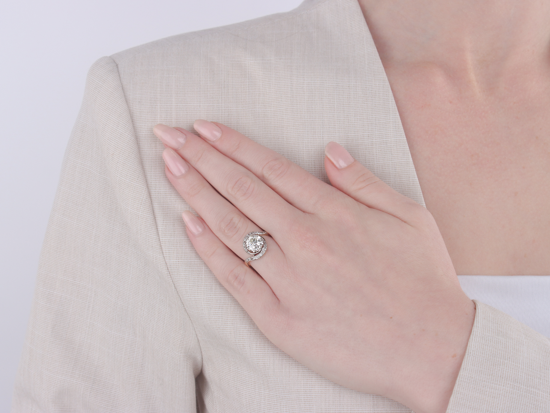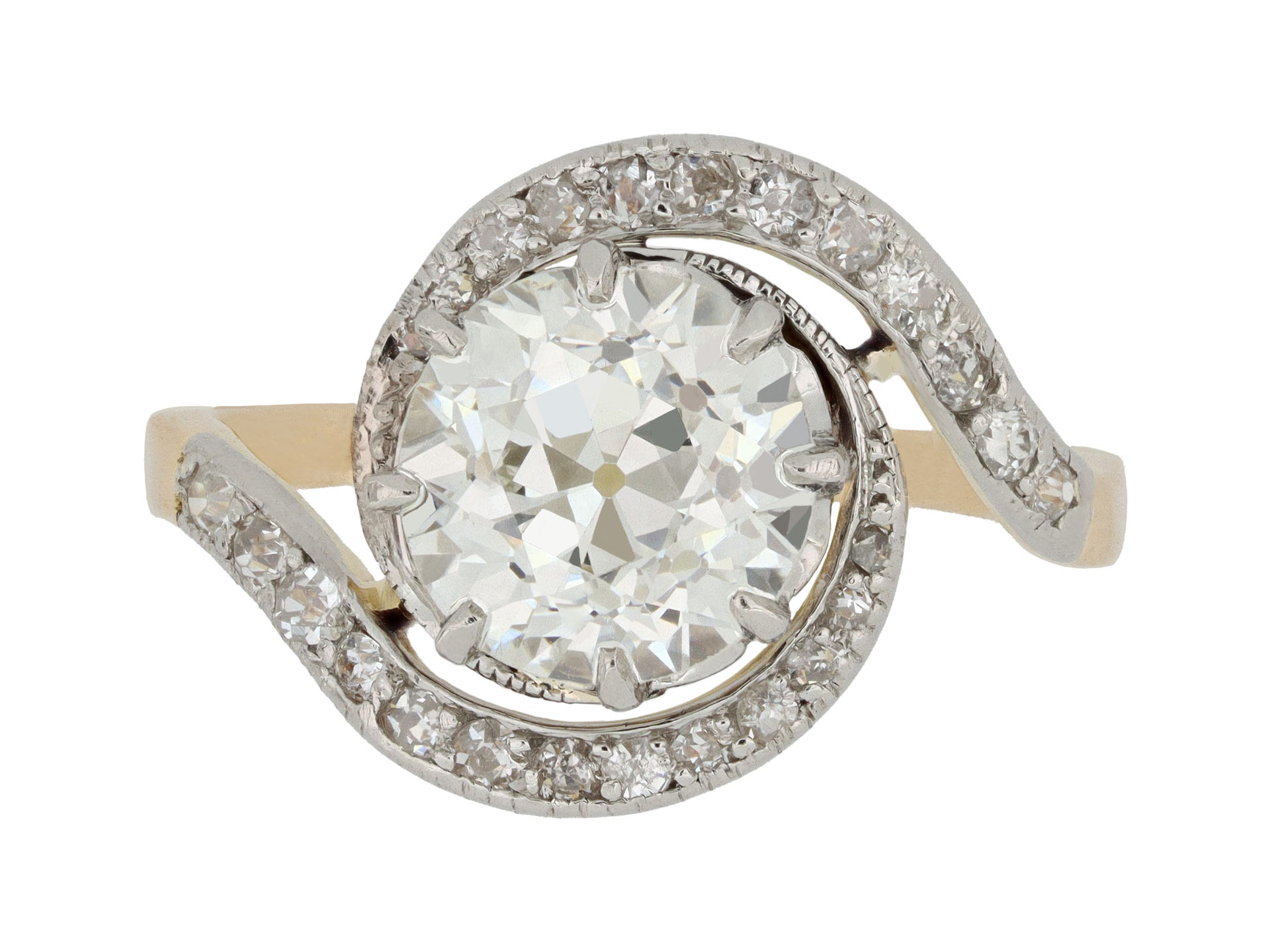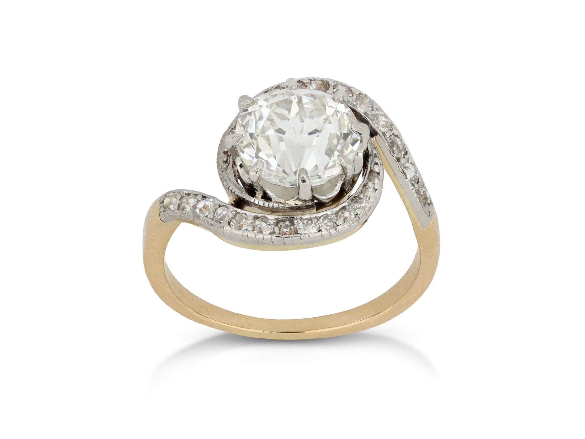 Edwardian diamond tourbillon ring. Set to centre with a round old cut diamond, K colour, SI1 clarity with a weight of 2.15 carats in an open back claw setting, further decorated with twenty one round eight cut diamonds in open back grain settings with a combined approximate weight of 0.40 carats and set with four round rose cut diamonds in open back grain settings with a combined weight of 0.04 carats. The total approximate diamond weight is 2.59 carats, to an elegant tourbillon design featuring curving claws and millegrain edging, a pierced gallery and fancy shape open backholing, leading to a-symmetric shoulders which flow through to a solid D-shape shank. Tested yellow gold and platinum, circa 1905, accompanied by Gemological Institute of America (GIA) report #5232760821.