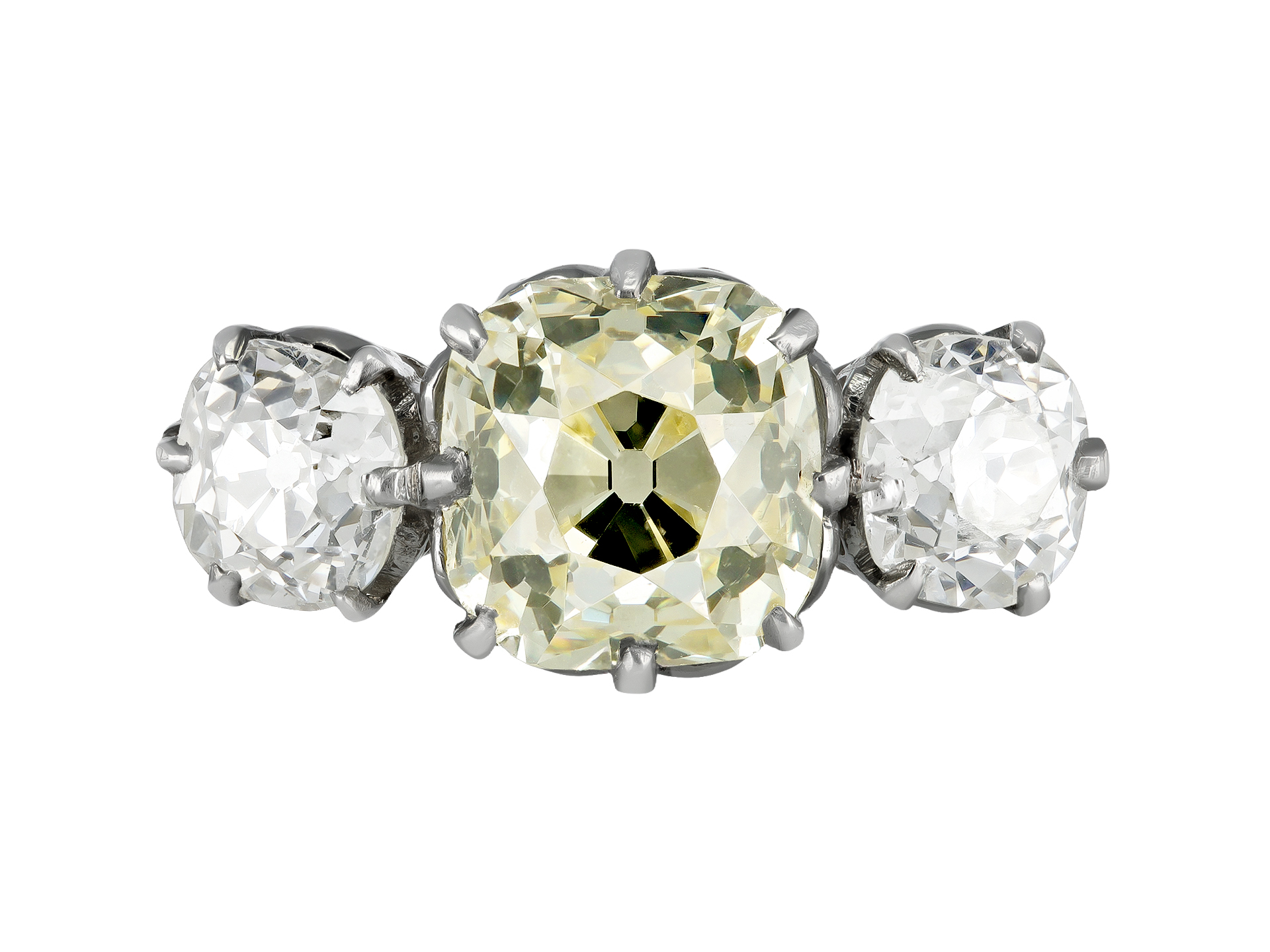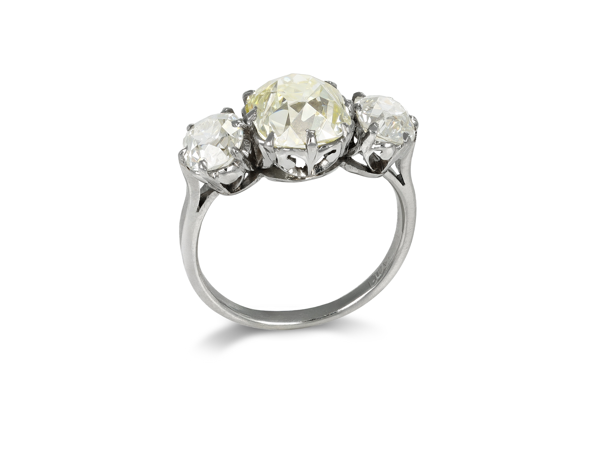 Fancy light yellow diamond three stone ring. Set centrally with a cushion shape old mine cut natural unenhanced fancy light yellow diamond, VS2 clarity, with a weight of 3.16 carats in an open back claw setting, further set with two cushion shape old mine diamonds in open back claw settings with a combined weight of 1.90 carats. The total approximate diamond weight is 5.06 carats, to an impressive graduating three stone design, featuring curving claws, an intricately pierced gallery and open circular backholing, flanked by gently sloping inwardly tapering shoulders flowing through to a solid slim D-shape shank. Marked platinum, English, circa 1910, accompanied by Gemological Institute of America (GIA) report #2201647344.