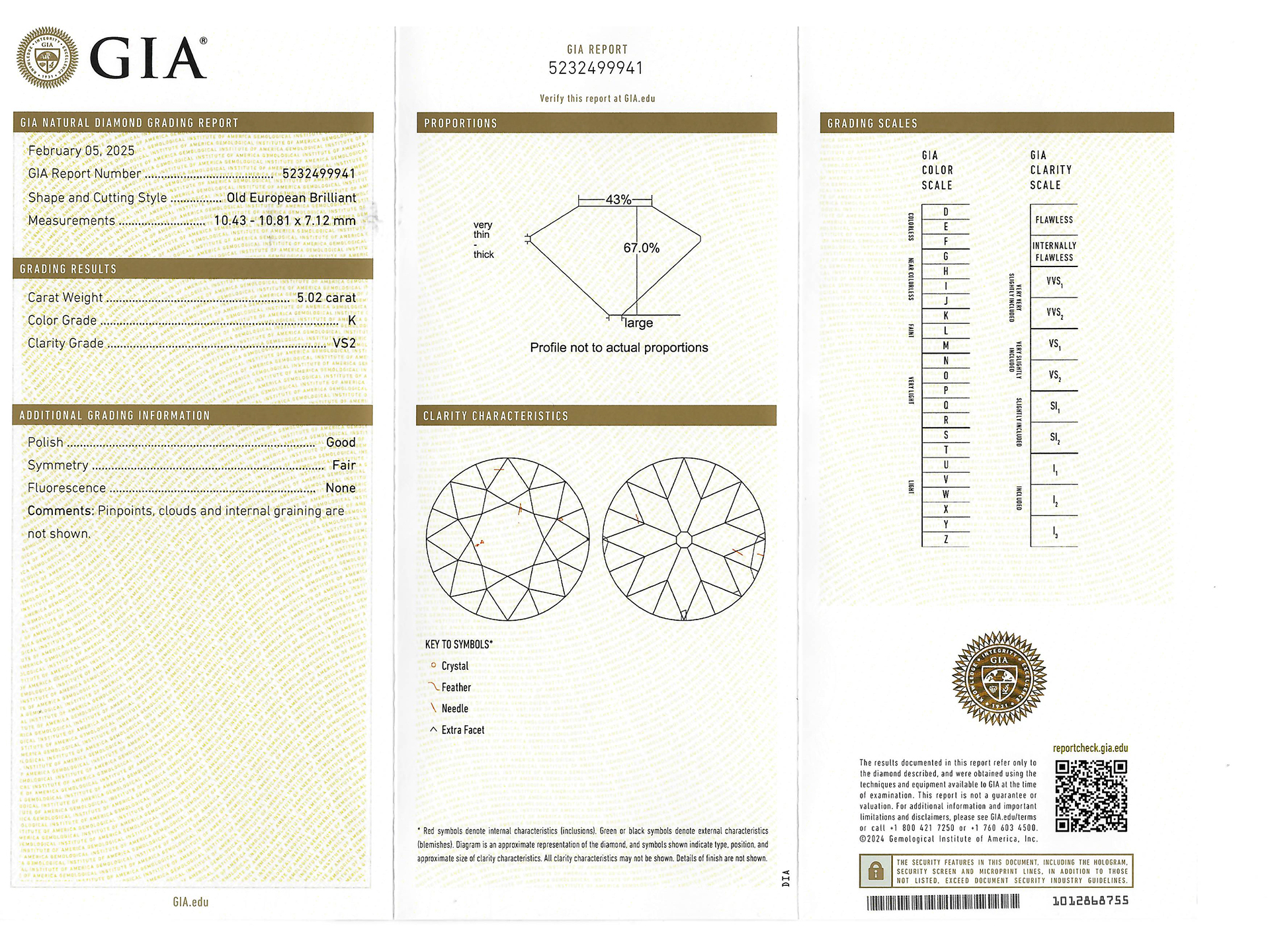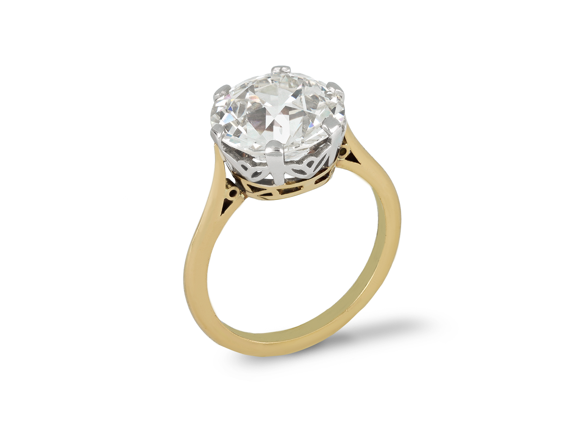 5.02 carat old cut diamond solitaire ring. Set with a round old cut diamond, K colour, VS2 clarity, with a weight of 5.02 carats, in an open back claw setting, to an impressive solitaire design featuring curving claws, a decorative gallery with floral motifs and open backholing, leading to raised shoulders with chenier detail and flowing through to a solid D-shape shank. Tested yellow gold and platinum, circa 1910, accompanied by Gemological Institute of America (GIA) report #5232499941.