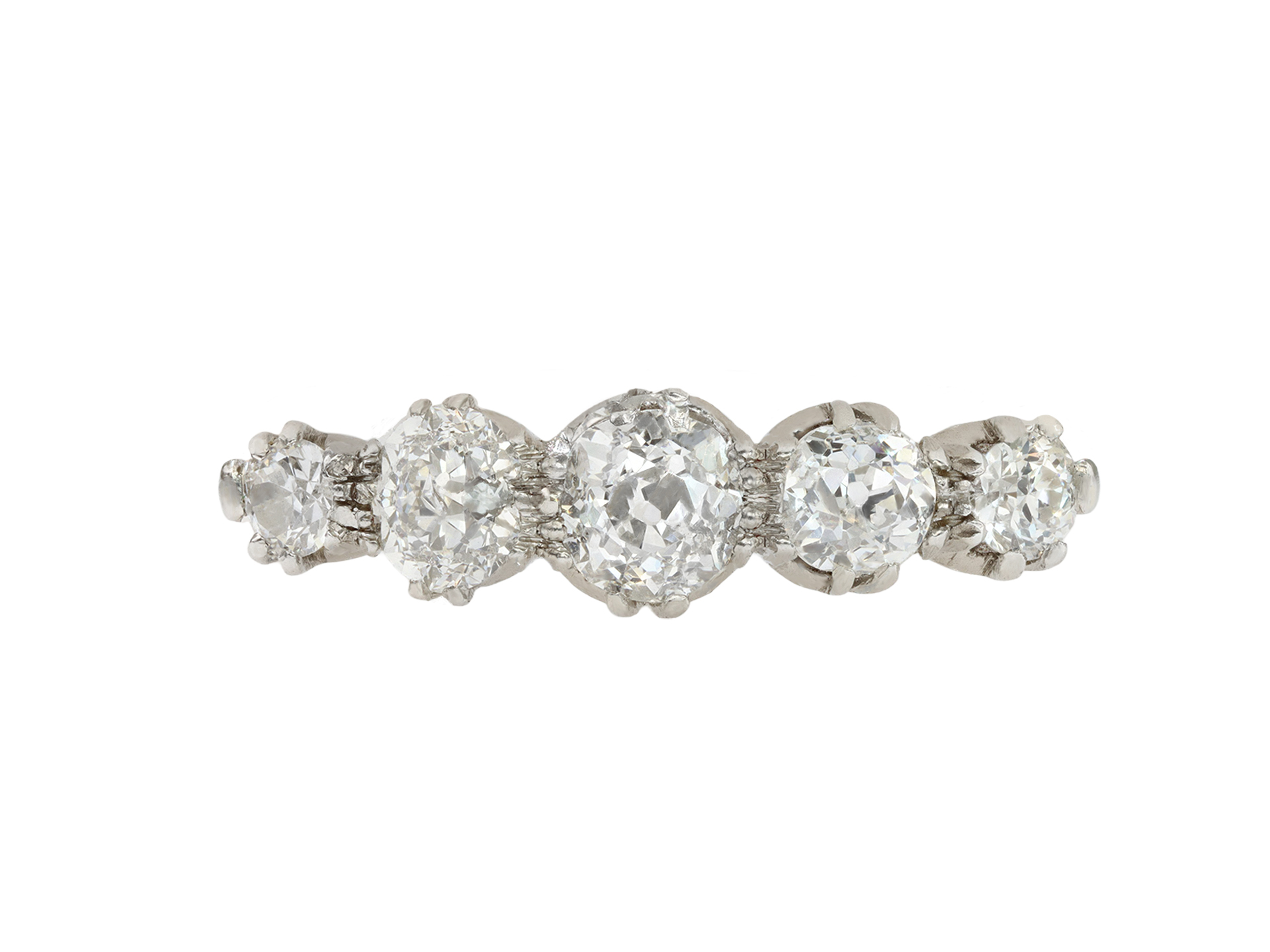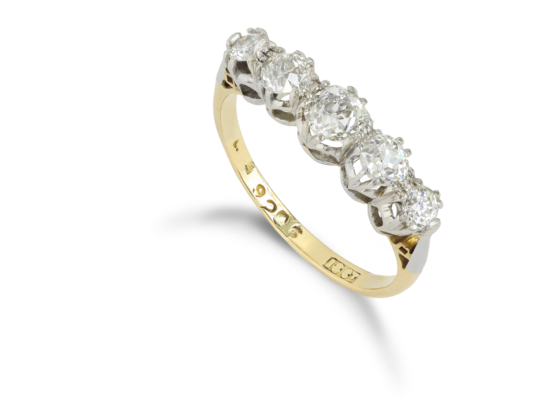 Edwardian old mine diamond five stone ring. Horizontally set with five cushion shape old mine diamonds in open back claw settings, with a combined approximate weight of 1.15 carats, to a graduated five stone design featuring curved claws, an intricately pierced gallery and circular open backholing, flanked by raised shoulders with chenier detailing that flow through to a solid D-shape shank. Marked 18 carat yellow gold and tested platinum, numbered '9203', circa 1910.