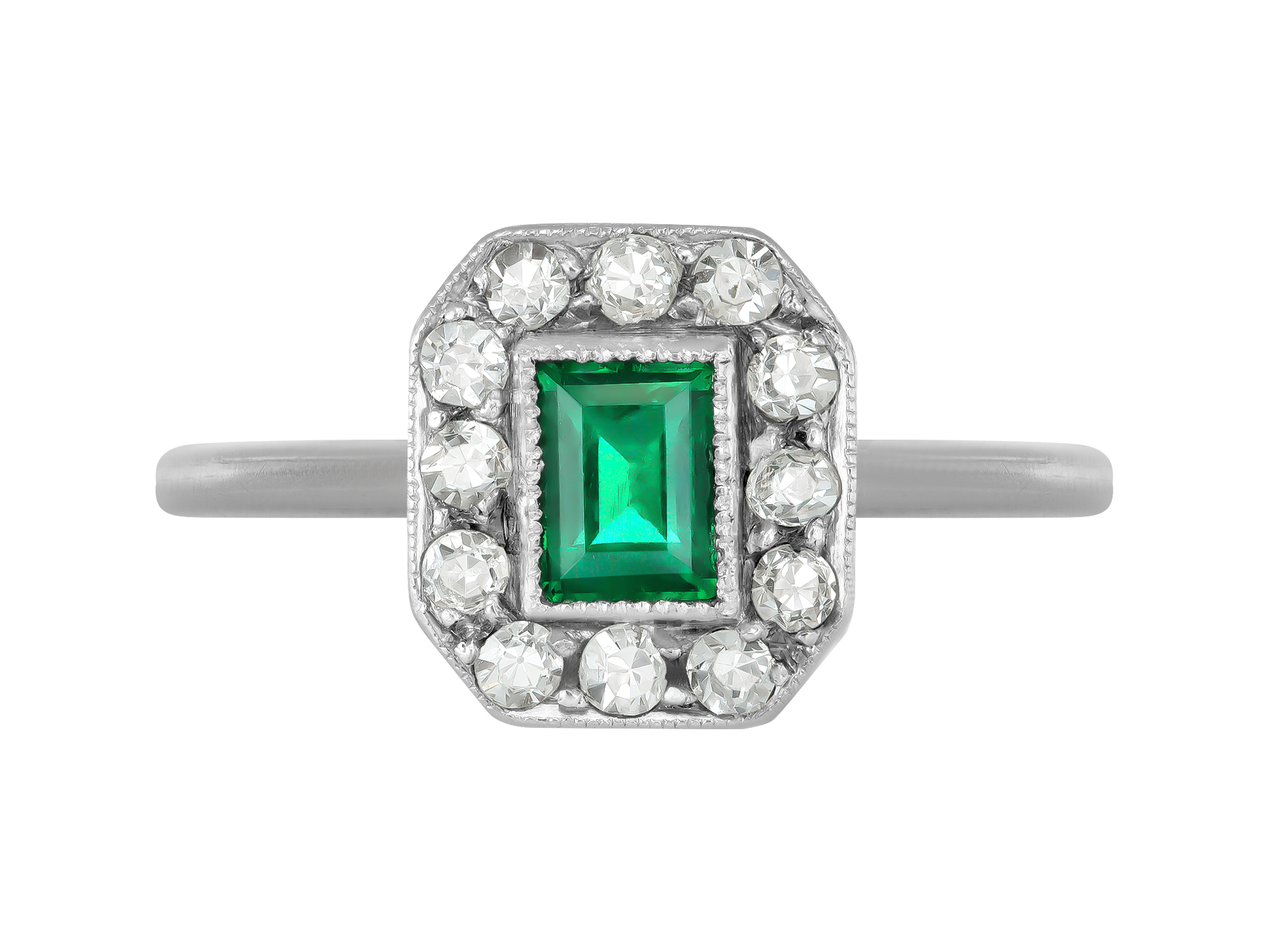 Emerald and diamond cluster ring. Centrally set with a rectangular step-cut natural emerald in an open back rubover setting with an approximate weight of 0.25 carats, surrounded by a row of twelve round eight cut diamonds in open back grain settings with a combined approximate weight of 0.25 carats to an elegant coronet cluster design featuring millegrain borders, an intricately pierced gallery and fancy shape open backholing, raised shoulders with chenier detail which flow through to a solid D-shape shank. Tested white gold with platinum settings, circa 1930.