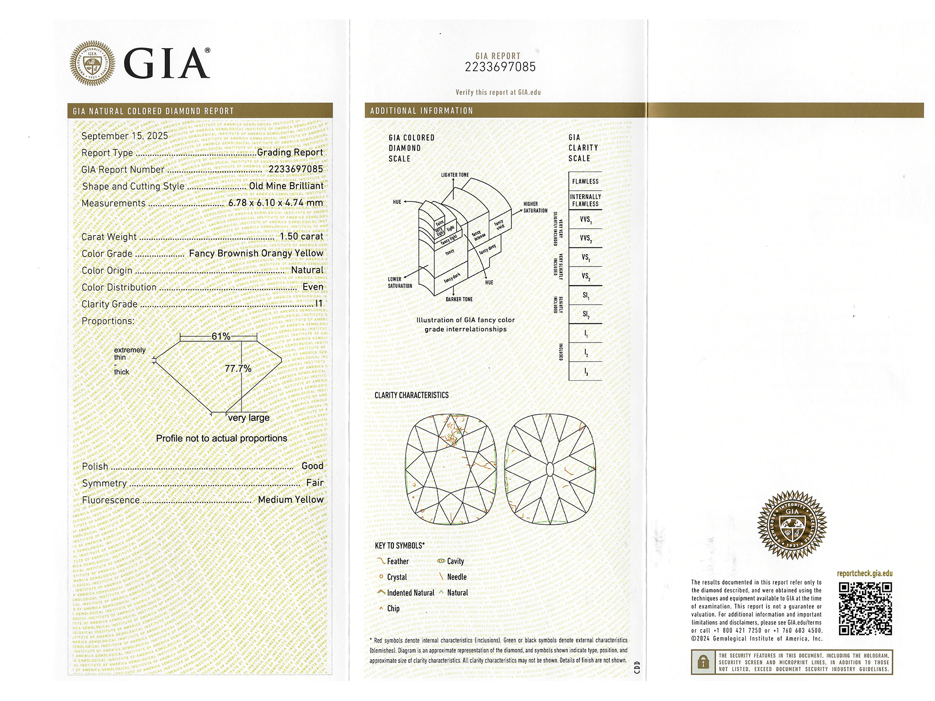 Fancy brownish orangy yellow diamond three stone ring. Set to centre with a cushion shape old mine natural unenhanced fancy brownish orangy yellow diamond, I1 clarity, with a weight of 1.50 in an open back claw setting, flanked by two cushion shape old mine diamonds in open back claw settings with a combined approximate weight of 1.65 carats, to an elegant three stone design featuring curving split claws, a pierced gallery and open circular backholing, leading to inwardly tapering raised shoulders with cheniers which flow through to a solid D-shape shank. Marked 18 carat yellow gold and platinum, English, circa 1905, accompanied by Gemological Institute of America (GIA) report #2233697085.