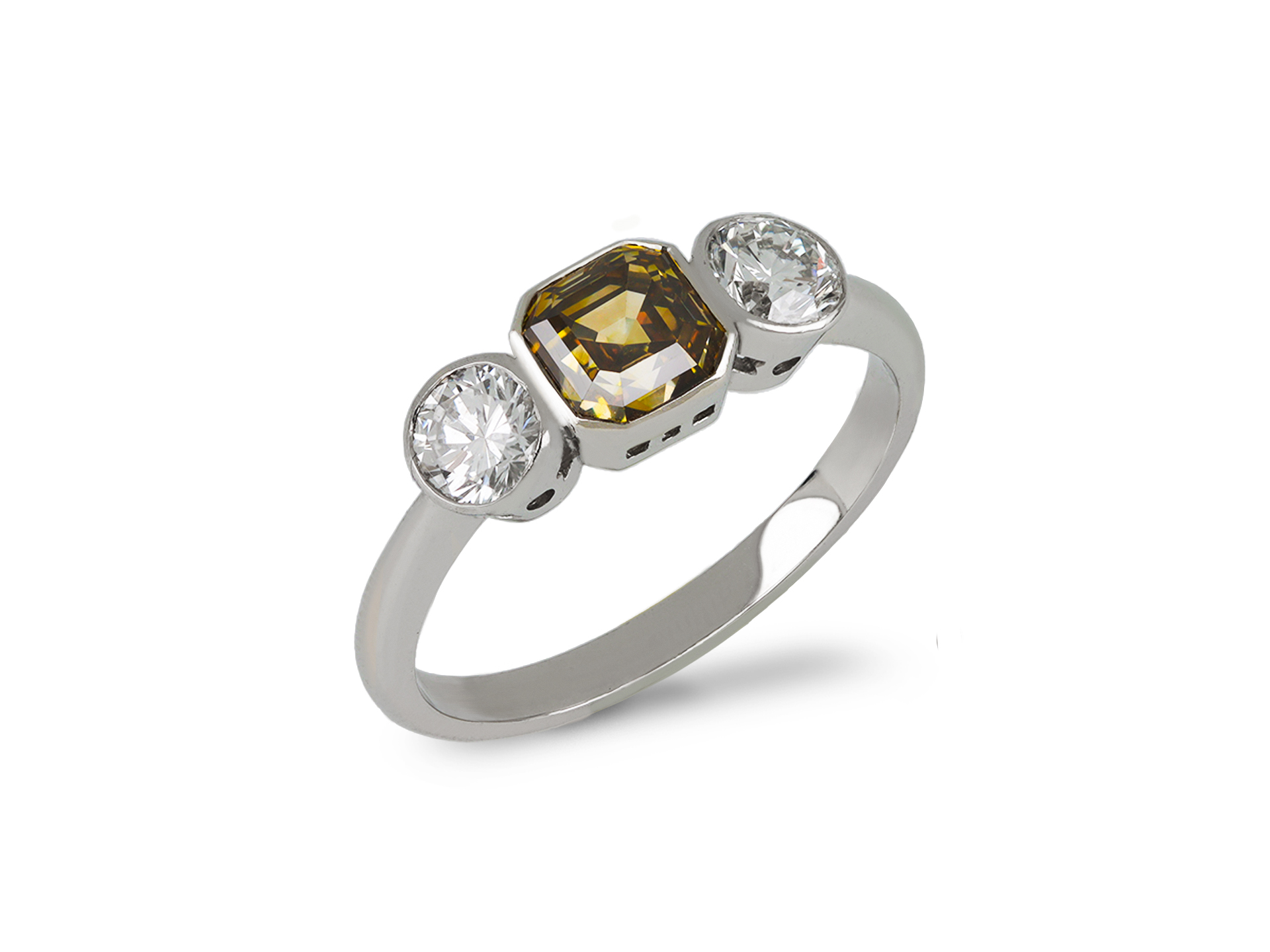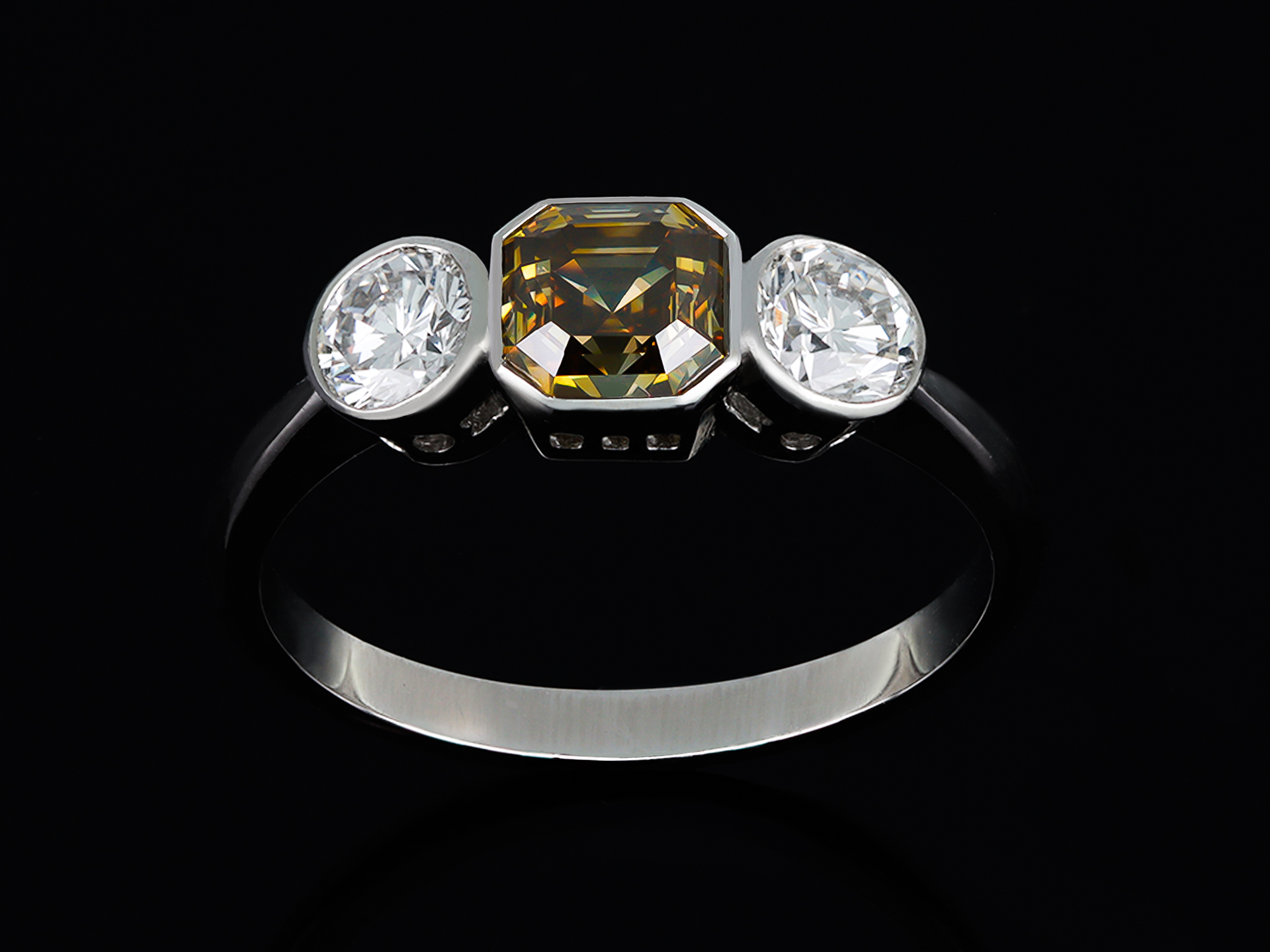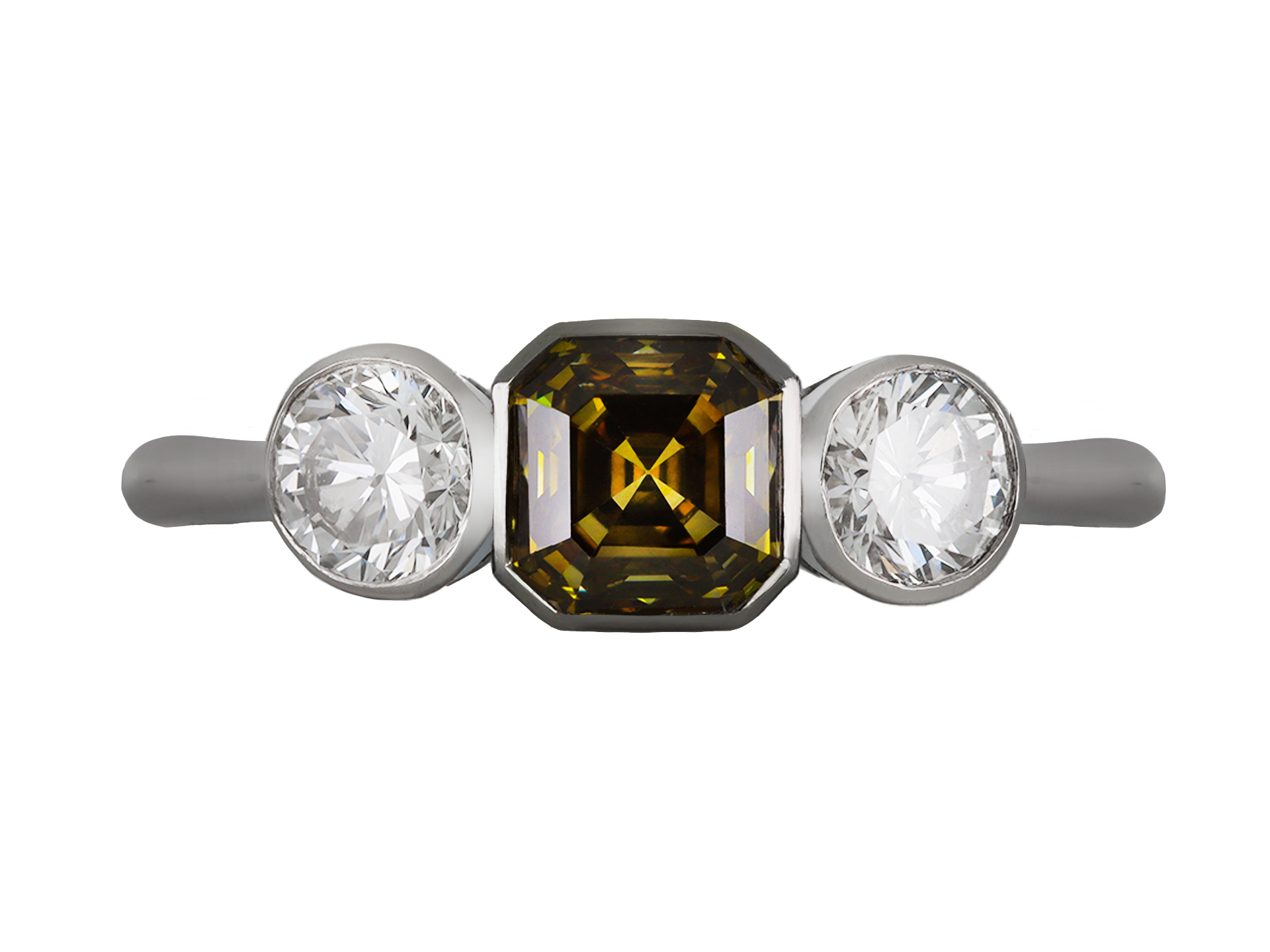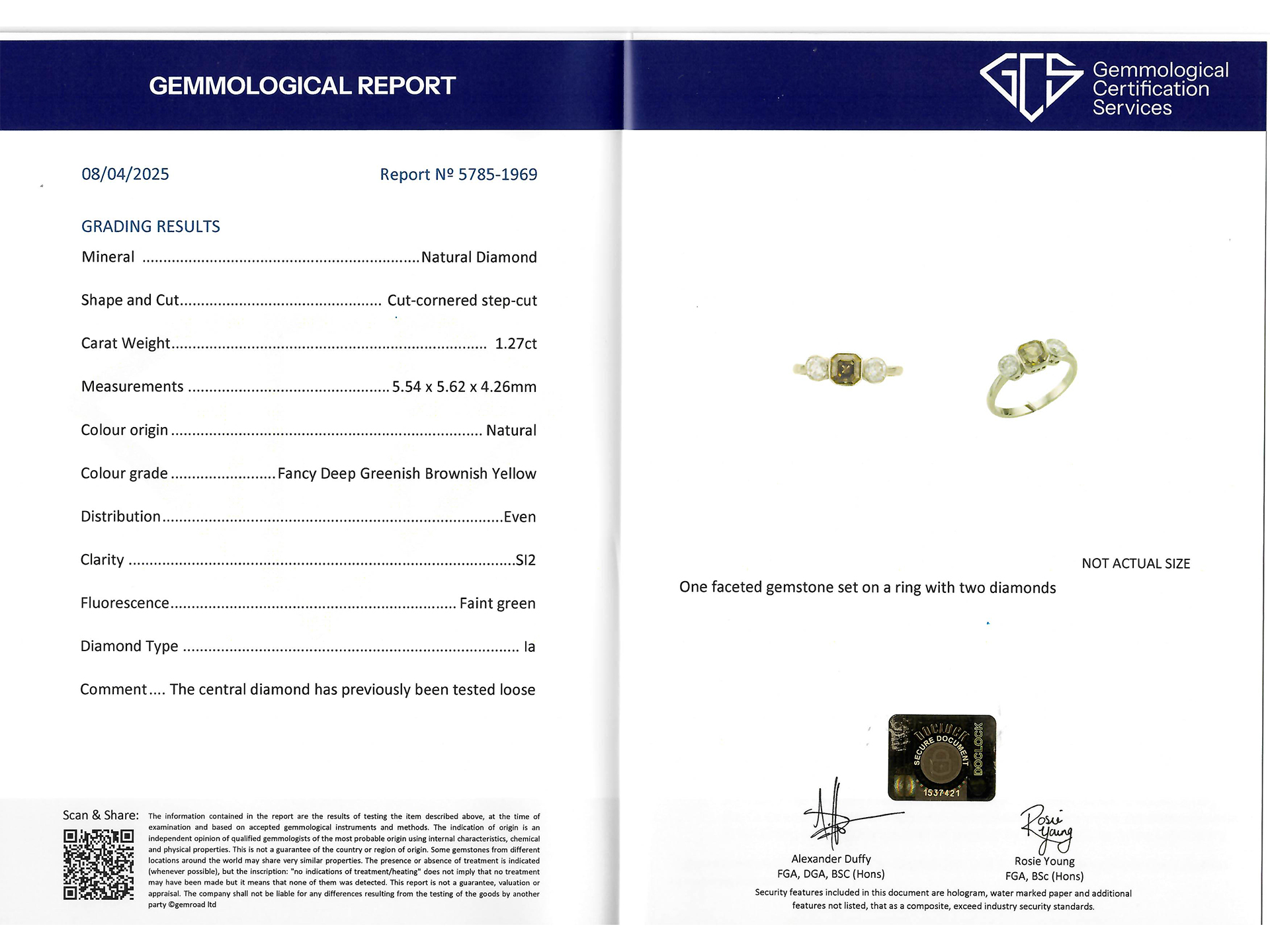 Fancy deep greenish brownish yellow diamond three stone ring. Set to centre with an octagonal asscher cut natural unenhanced fancy deep greenish brownish yellow diamond, SI2 clarity, with a weight of 1.27 carats in an open back rubover setting, flanked by two round brilliant cut diamonds in open back rubover settings with a combined approximate weight of 0.80 carats. The total approximate diamond weight is 2.07 carats, to an elegant three stone design featuring polished edges, a pierced gallery with geometric motifs and fancy shape open backholing, leading to inwardly tapering shoulders which flow through to a solid D-shape shank. Tested platinum, accompanied by Gemmological Certification Services report #5785-1969.