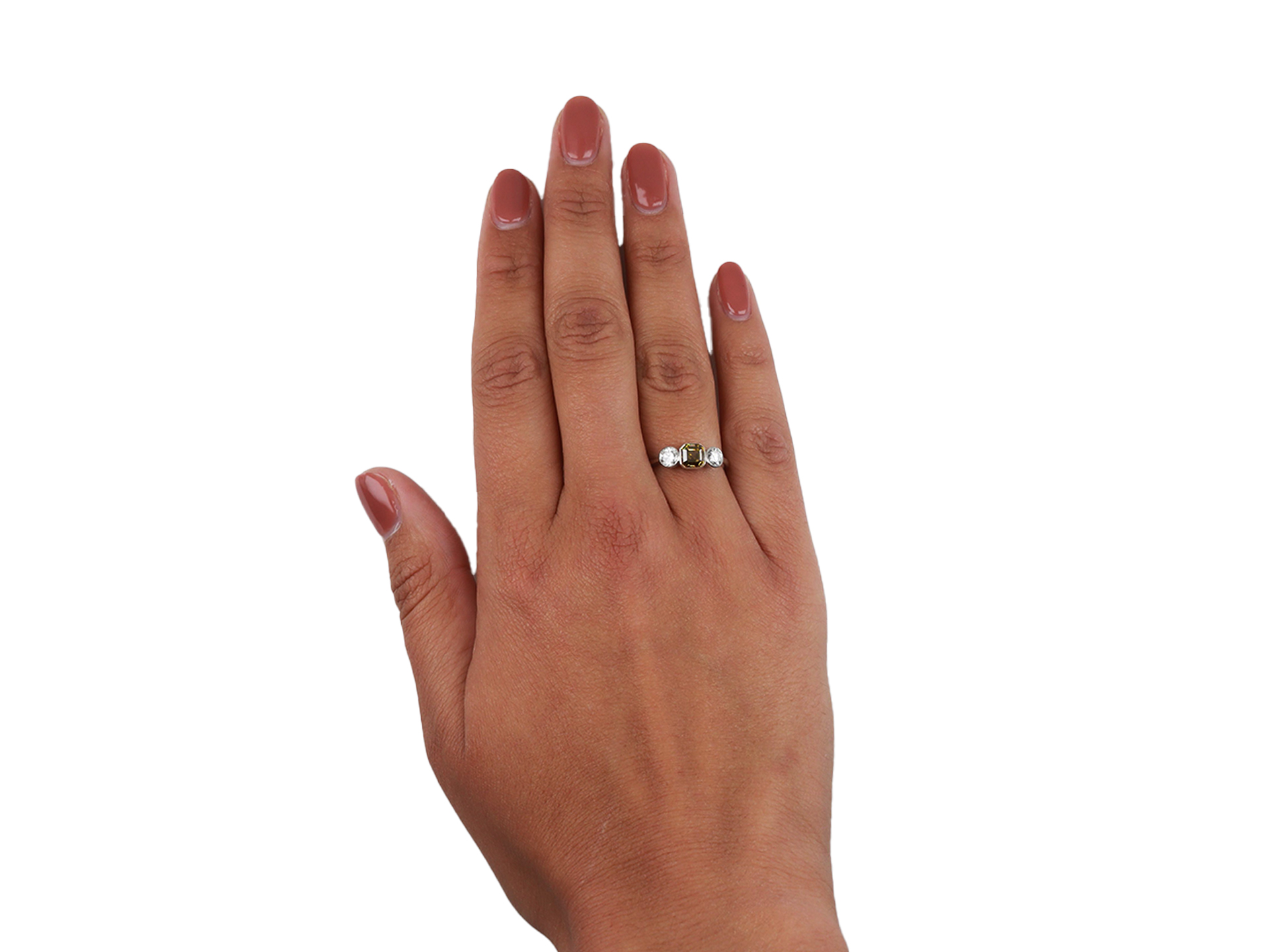 Fancy deep greenish brownish yellow diamond three stone ring.