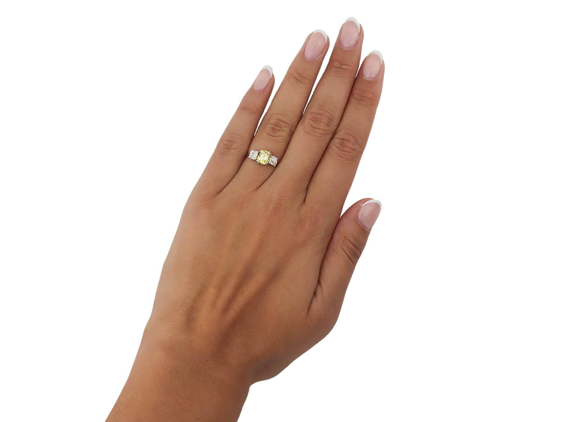 Fancy intense yellow diamond, yellow diamond engagement ring, three stone diamond ring,